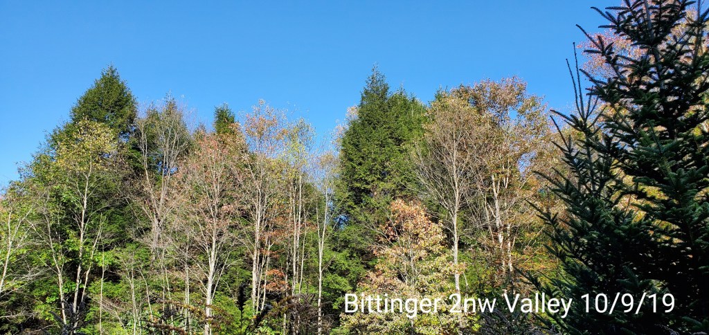 Foliage up top is well past peak. The maples are bare for the most part up high. With a few random exceptions . The birch on Weiss has come and gone in the week. Some patches of nice color down low. The main green foliage on the hillsides are locust, cherry with some beech. Locust and and cherry are blahhhh. The valley birch should become nice this coming week. (Towards the resort)