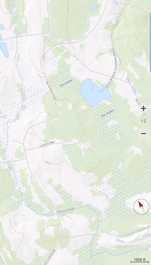 Same story, coating of snow holds in shady and north slopes. Courtesy of low dewpoints and low sun