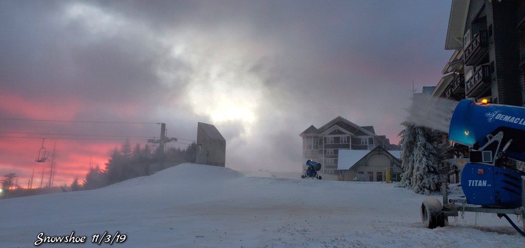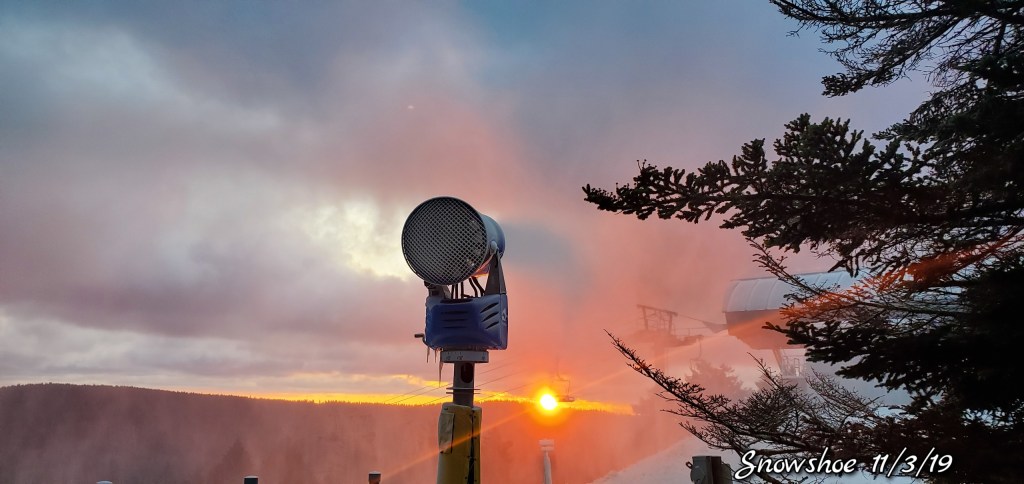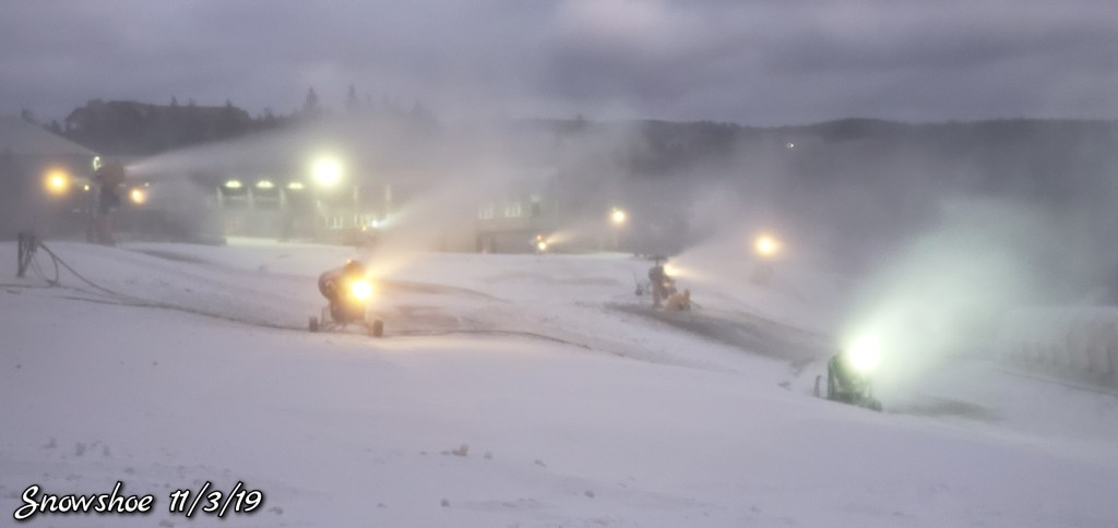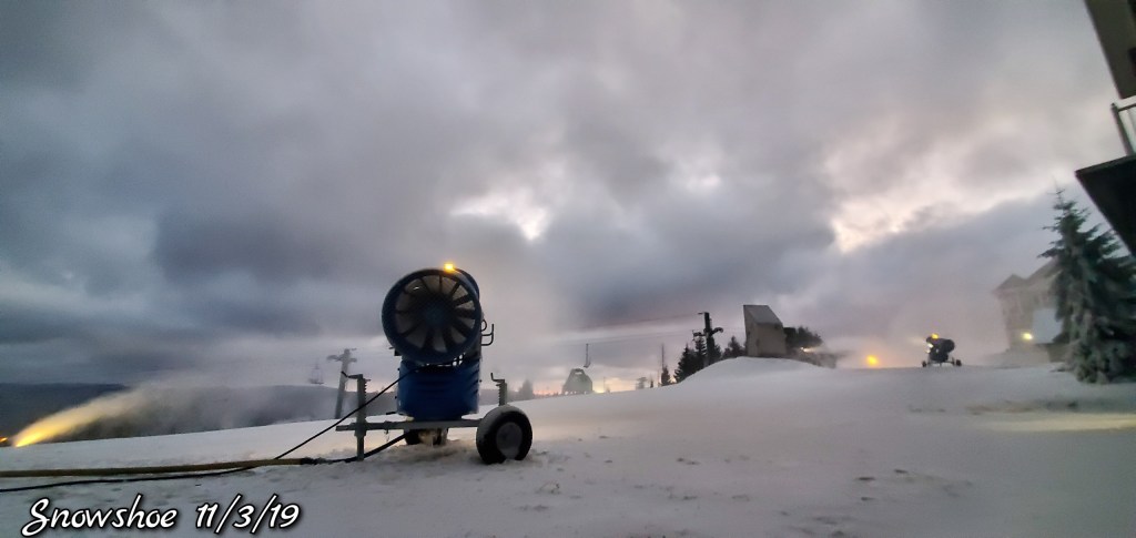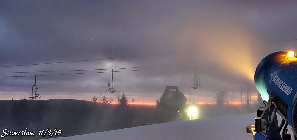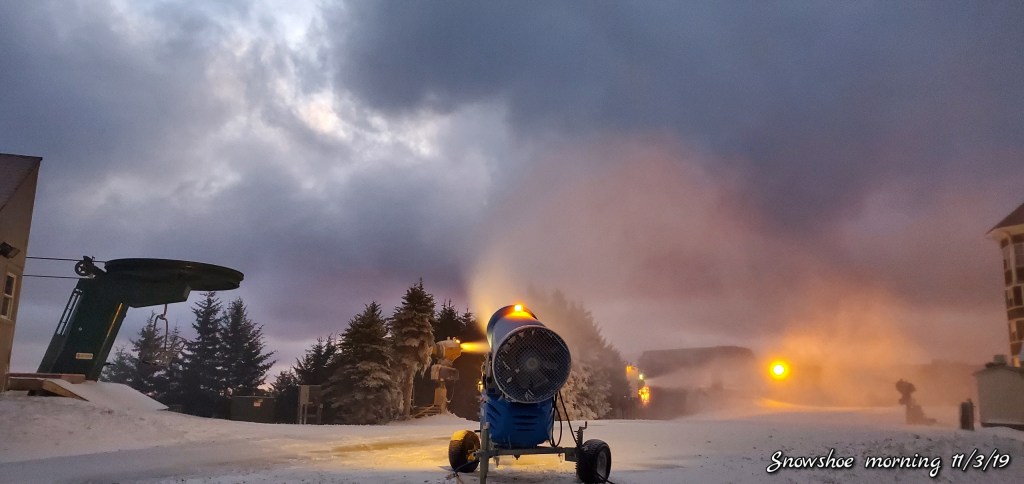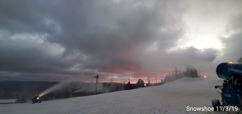 Snow guns were on, it looked, felt like winter. Cold winds blowing Snow guns ran until midday and returned after dark for a short time. Still a little natural snow left under the Spruce and north facing areas.