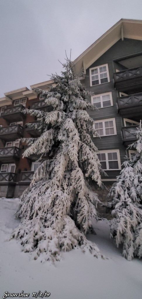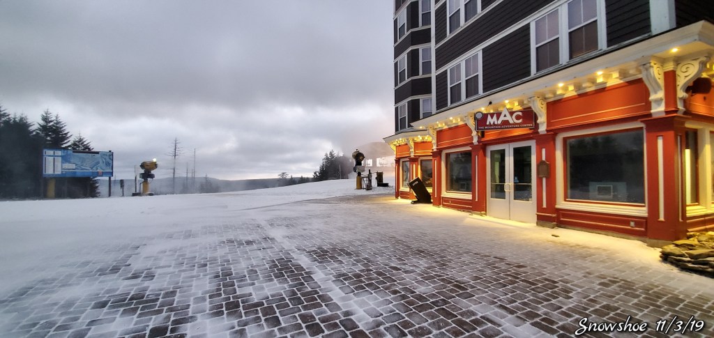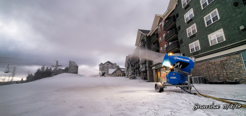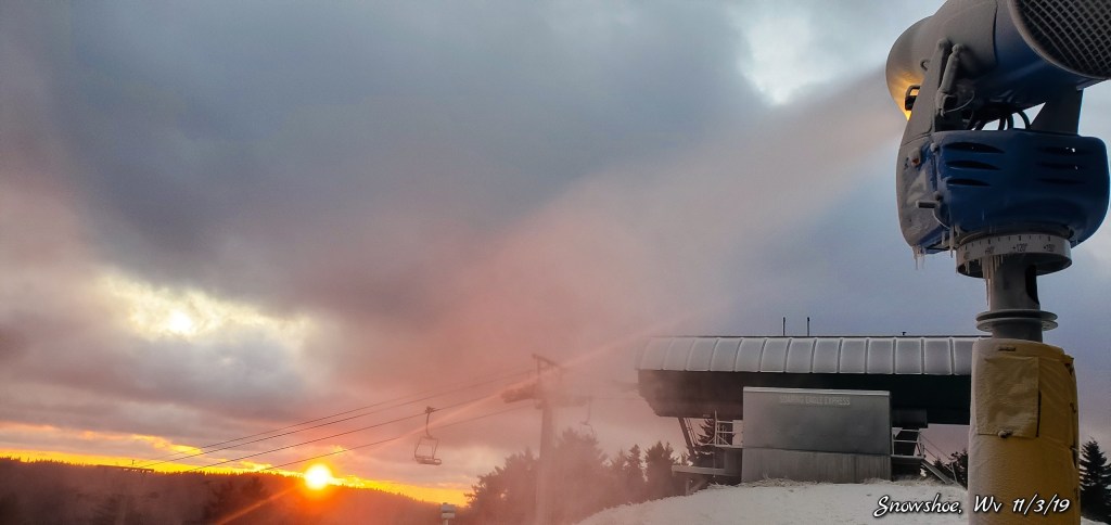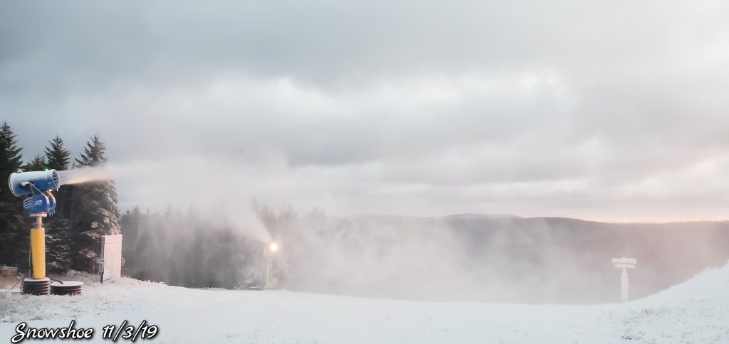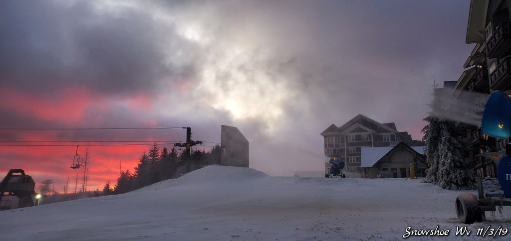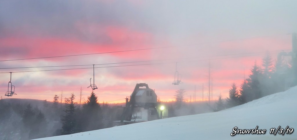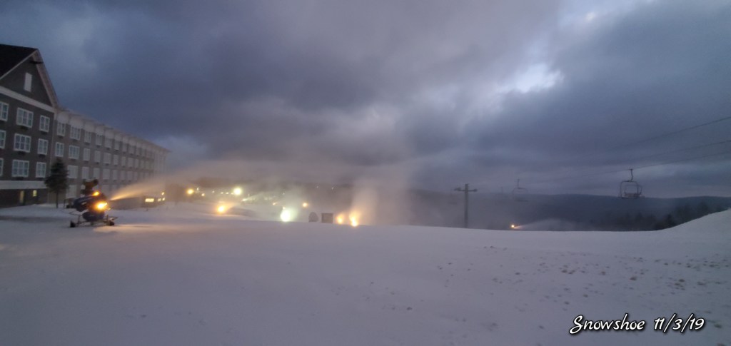 Snow guns were on, it looked, felt like winter. Cold winds blowing Snow guns ran until midday and returned after dark for a short time. Still a little natural snow left under the Spruce and north facing areas.