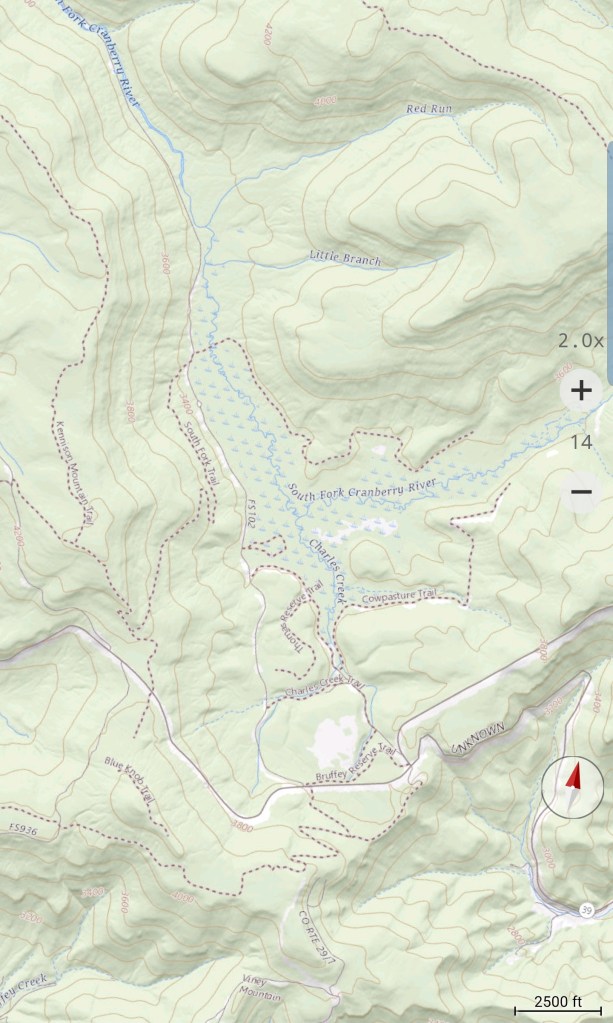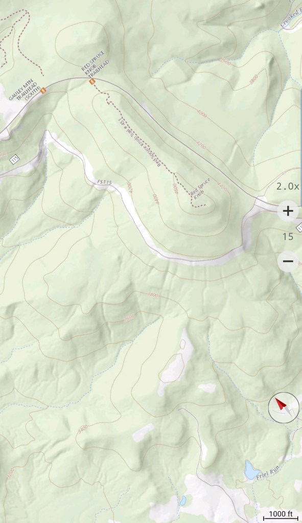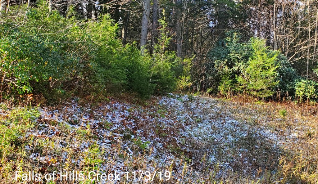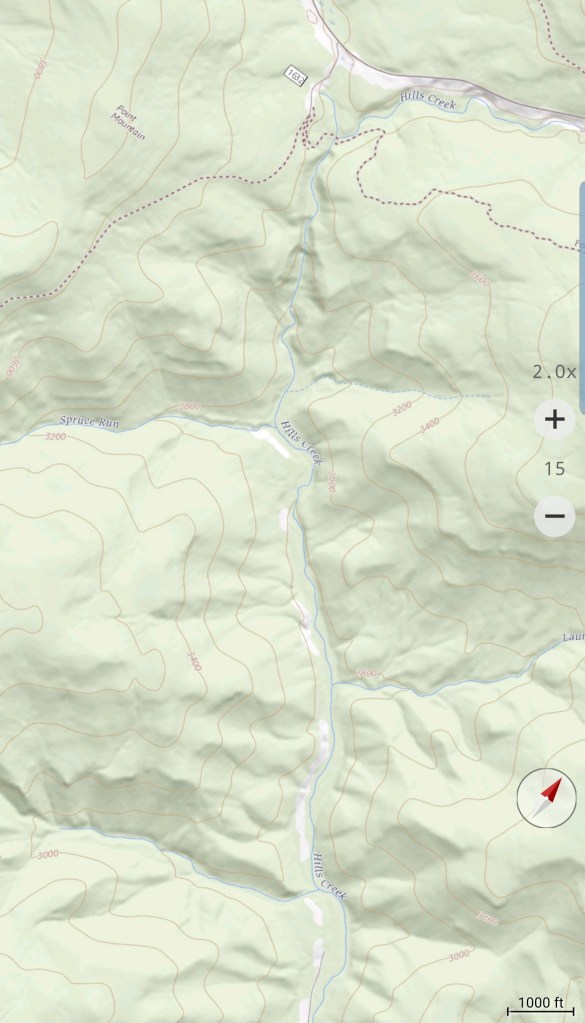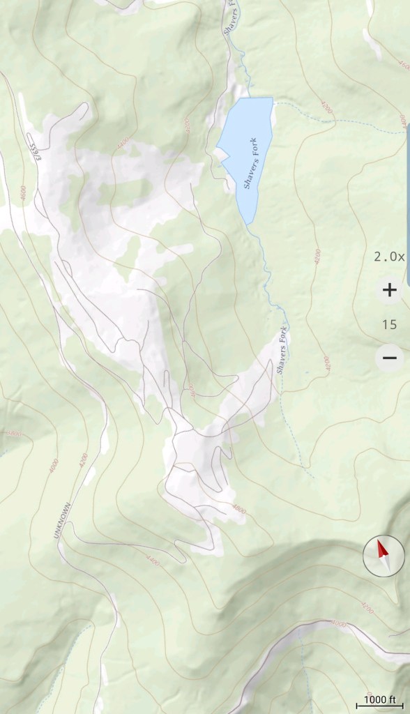 Touch of snow in shady spots up top….the creek flowing nicely today…