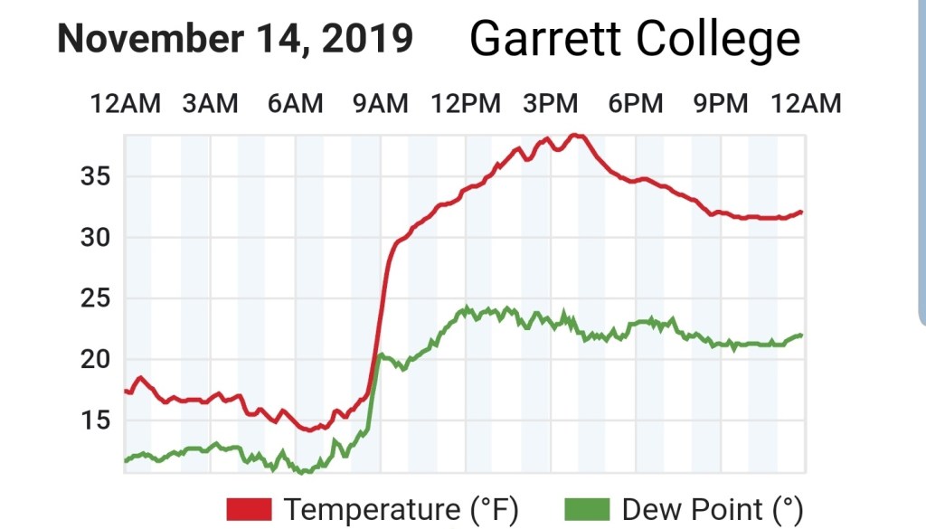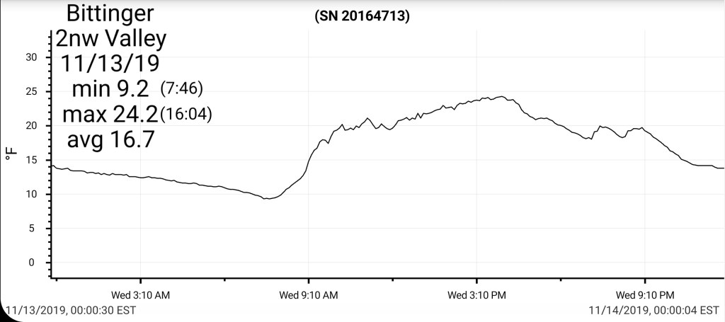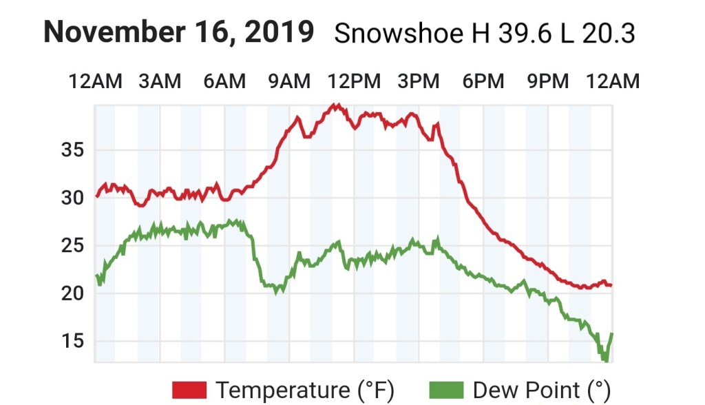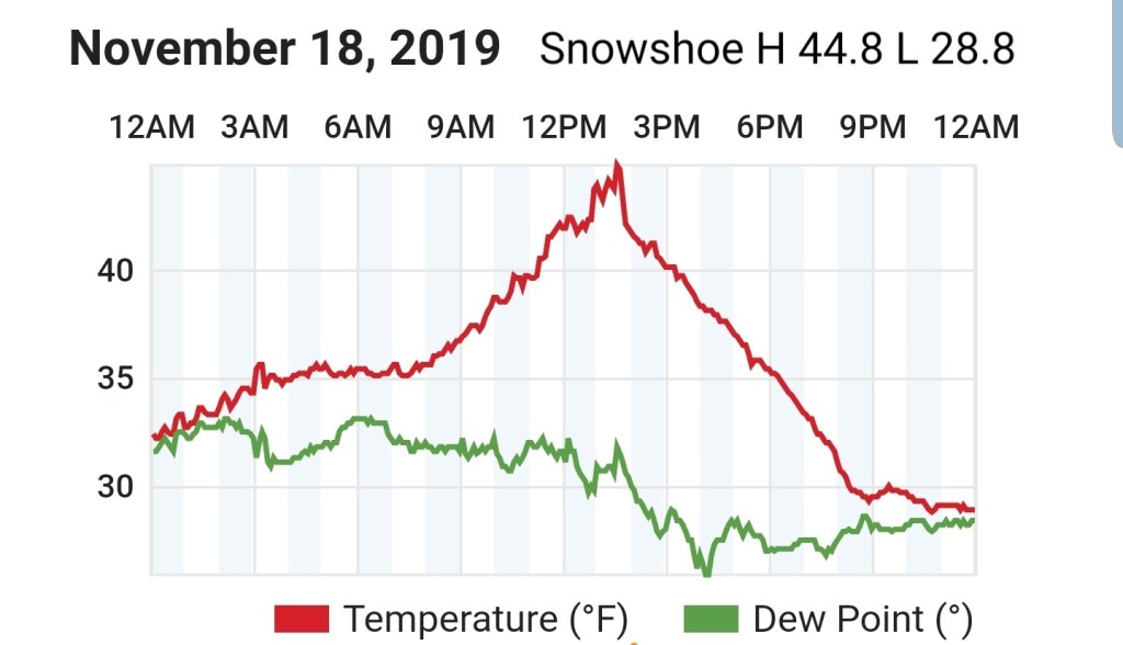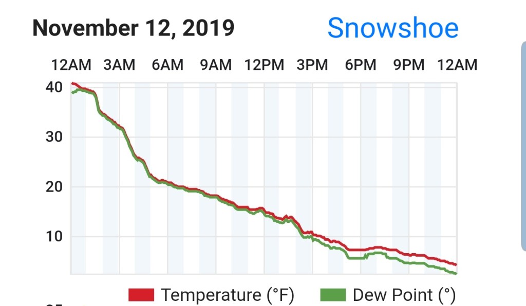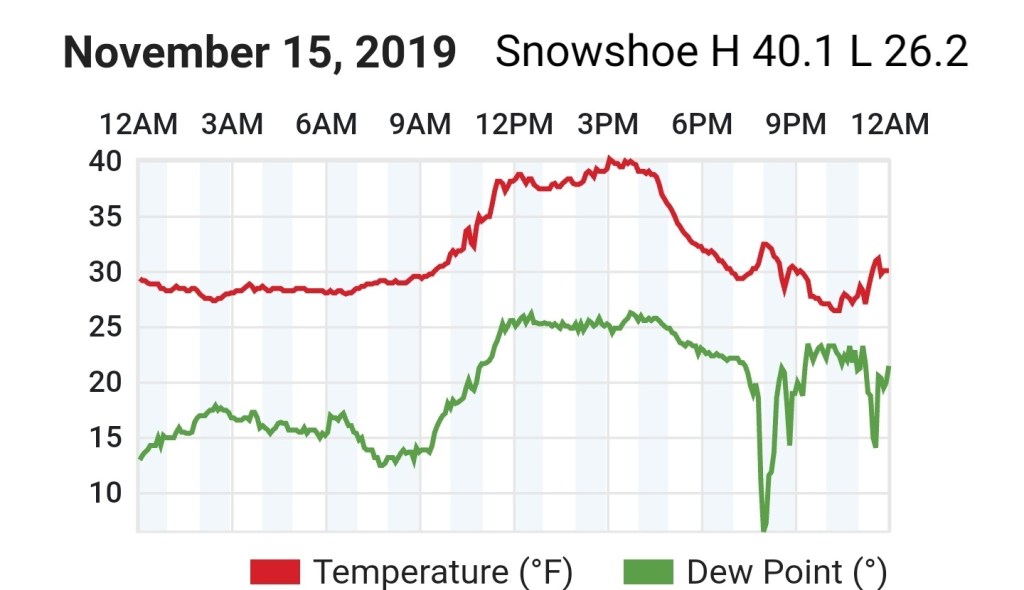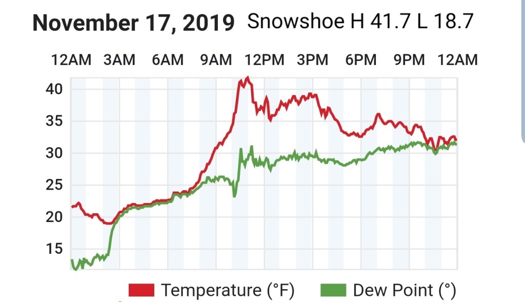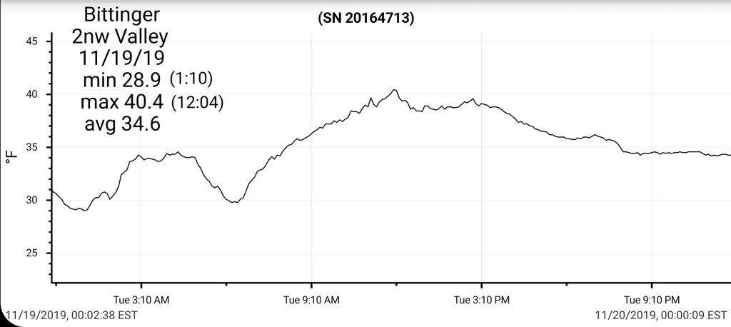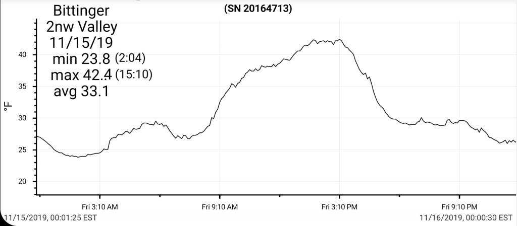 Early evening and often the case with an incoming cold front with precip, conditions go calm in the Valley, skies- if clear or partly cloudy temps will obviously drop greater, but temps usually fall off fast, then rise fast ahead of the front as winds increase. Case in point- the Valley last night.