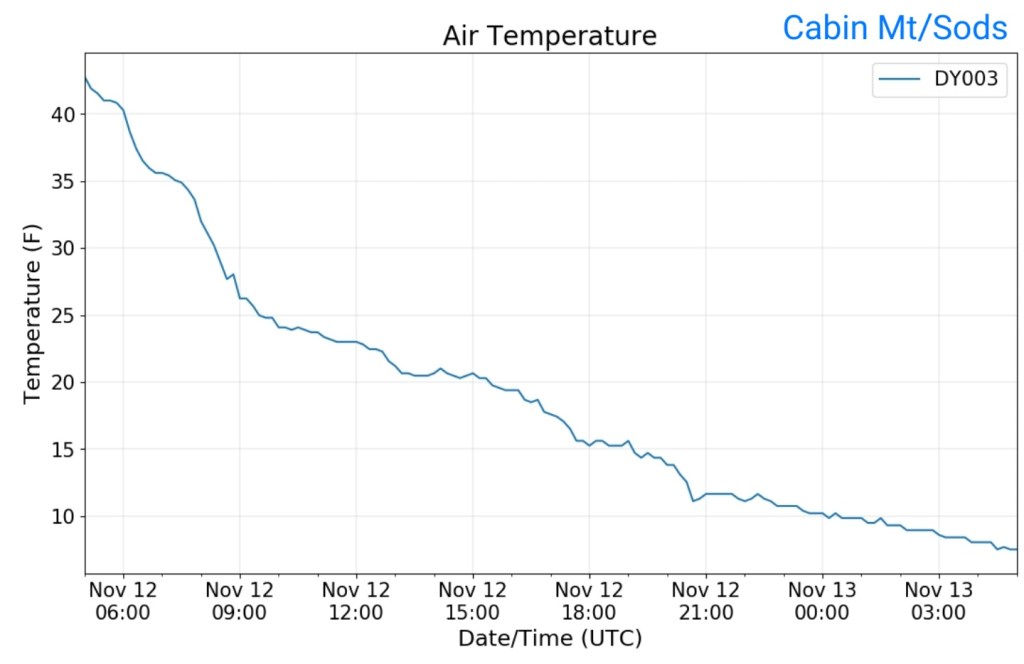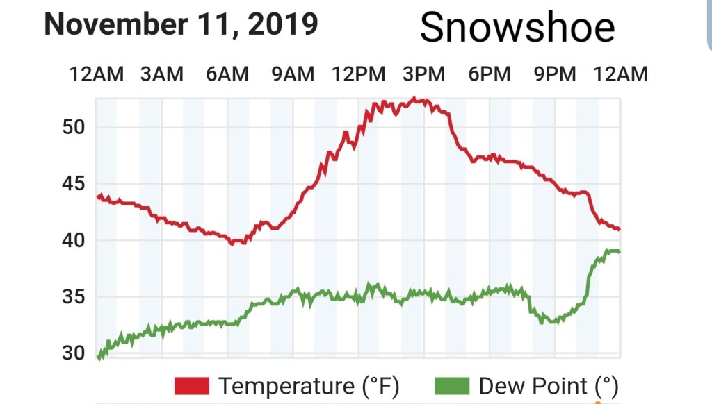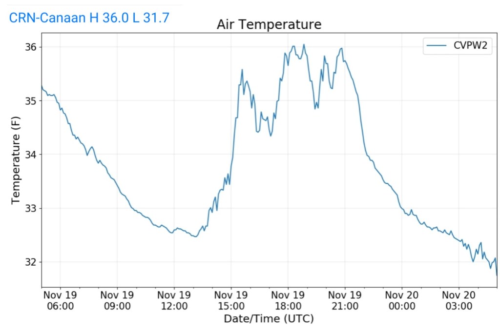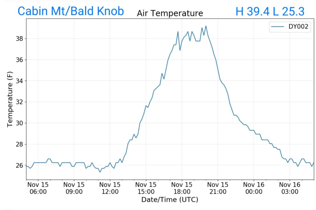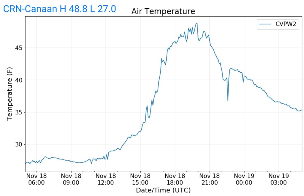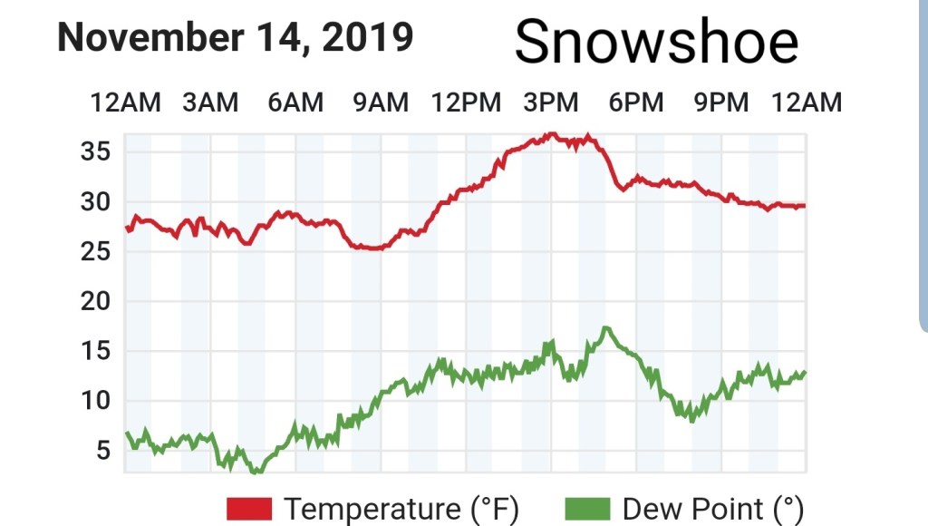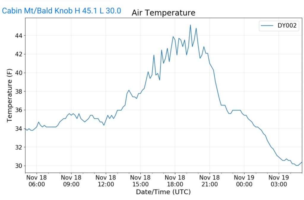Early evening and often the case with an incoming cold front with precip, conditions go calm in the Valley, skies- if clear or partly cloudy temps will obviously drop greater, but temps usually fall off fast, then rise fast ahead of the front as winds increase. Case in point- the Valley last night.
