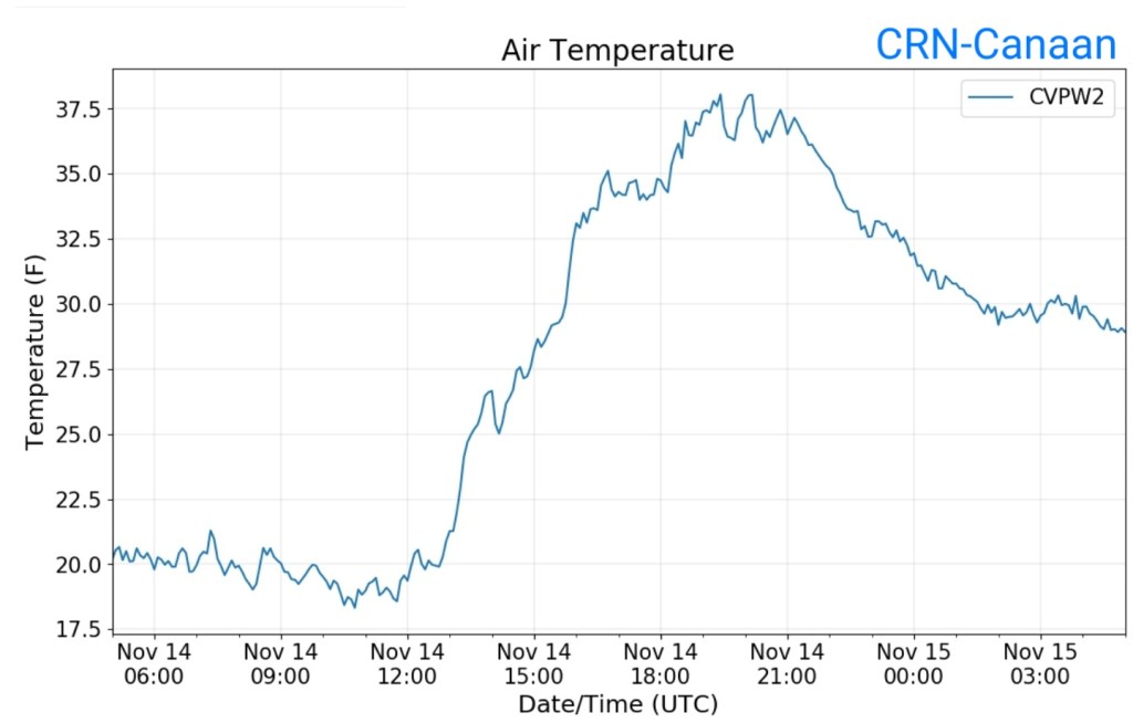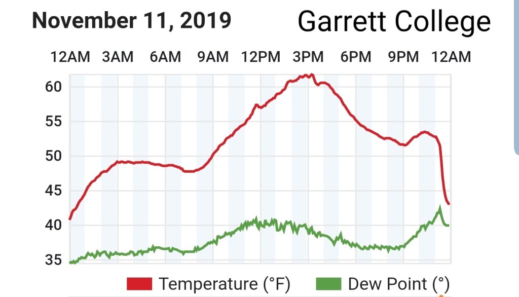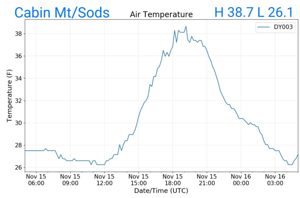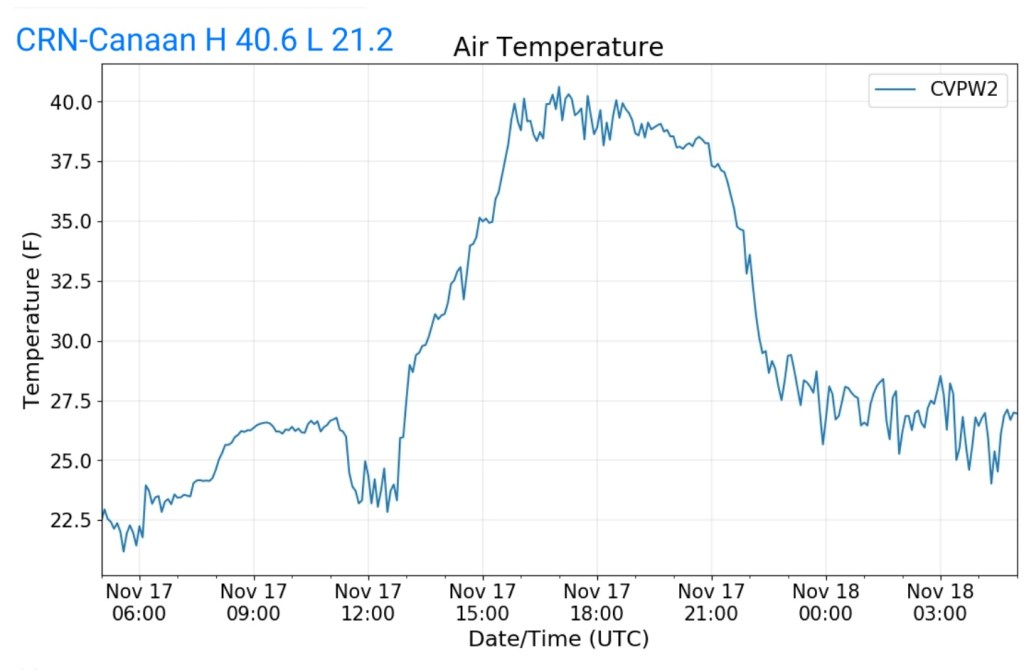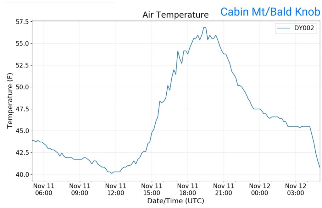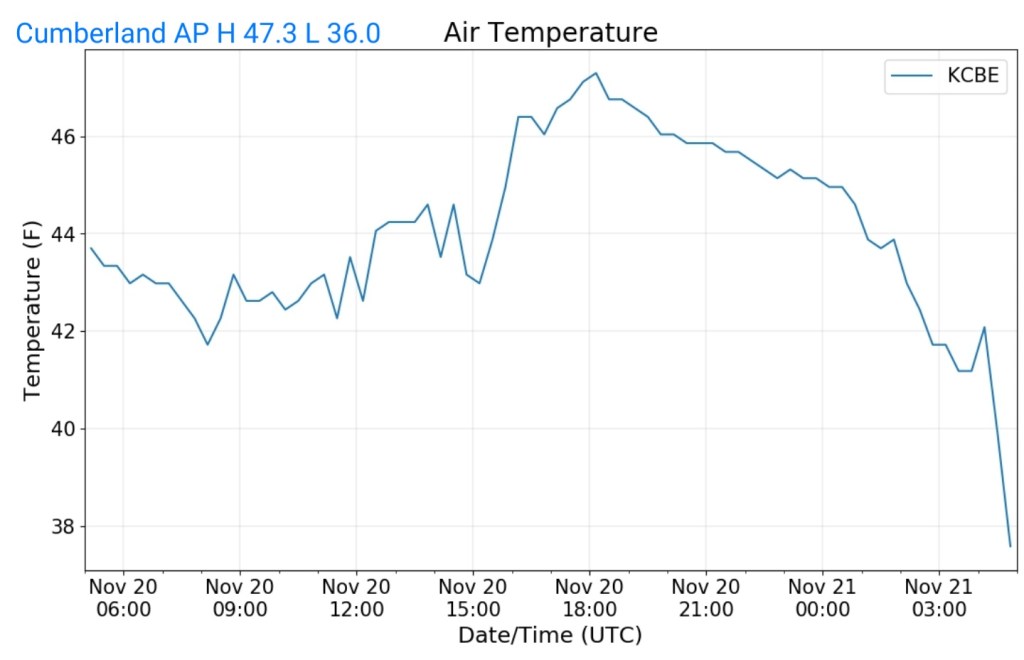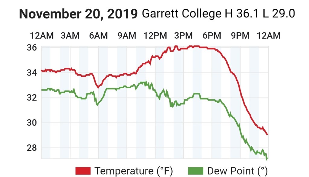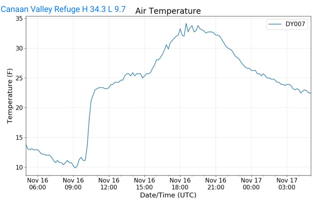 Early evening and often the case with an incoming cold front with precip, conditions go calm in the Valley, skies- if clear or partly cloudy temps will obviously drop greater, but temps usually fall off fast, then rise fast ahead of the front as winds increase. Case in point- the Valley last night.