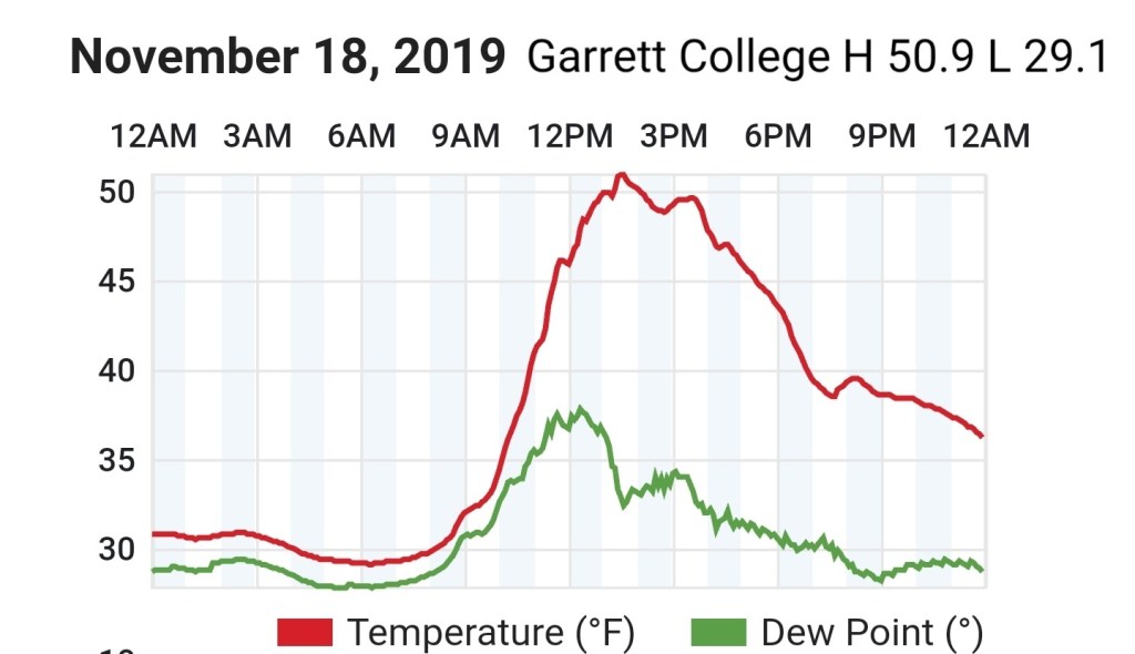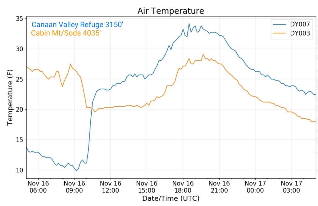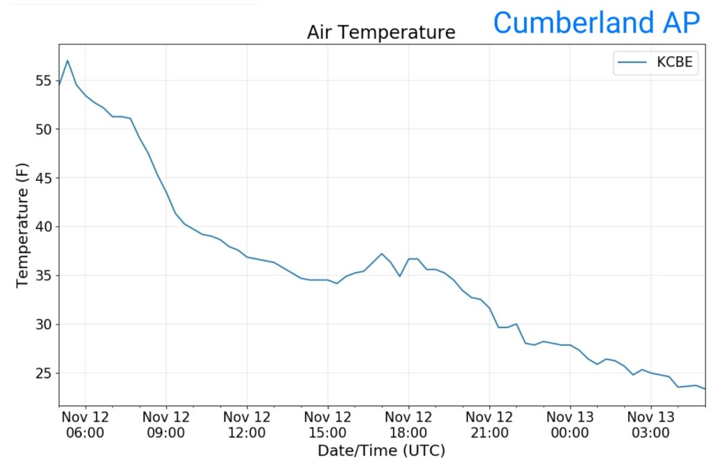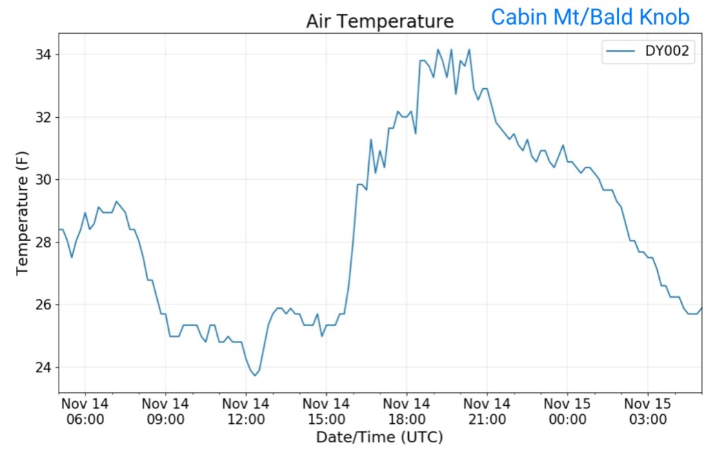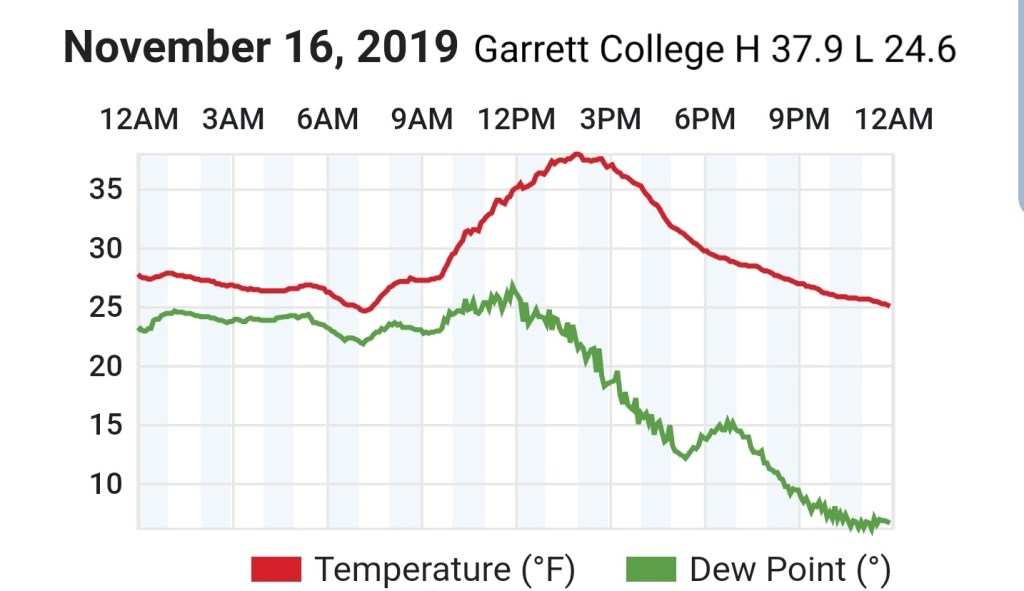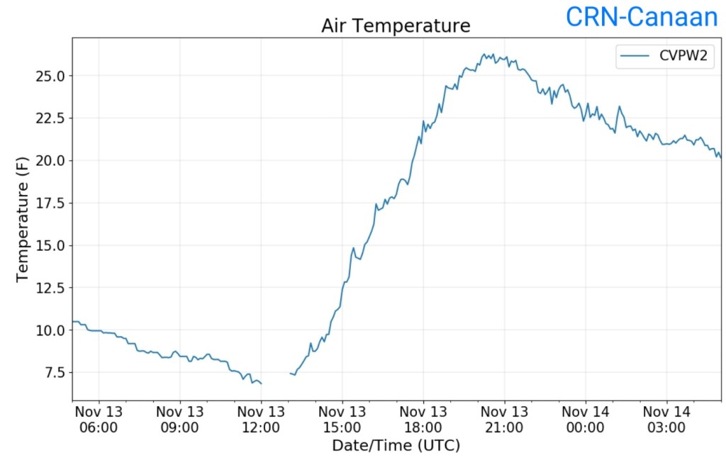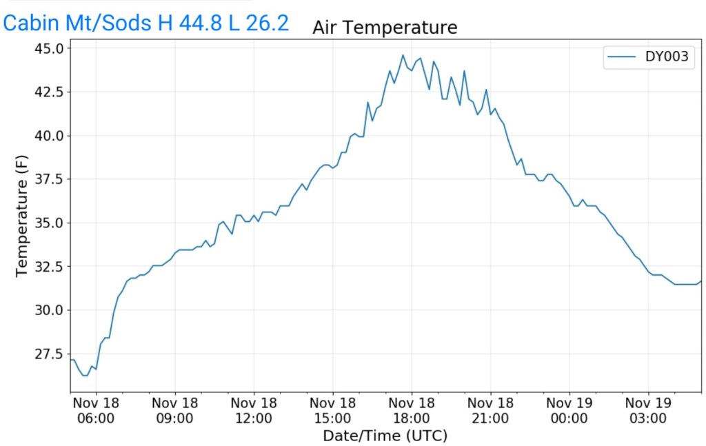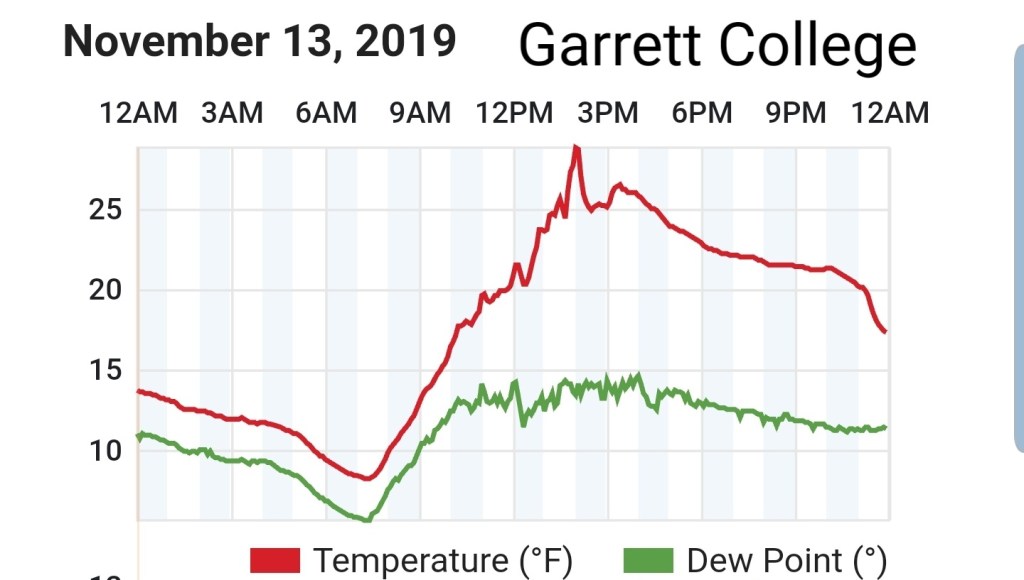Early evening and often the case with an incoming cold front with precip, conditions go calm in the Valley, skies- if clear or partly cloudy temps will obviously drop greater, but temps usually fall off fast, then rise fast ahead of the front as winds increase. Case in point- the Valley last night.