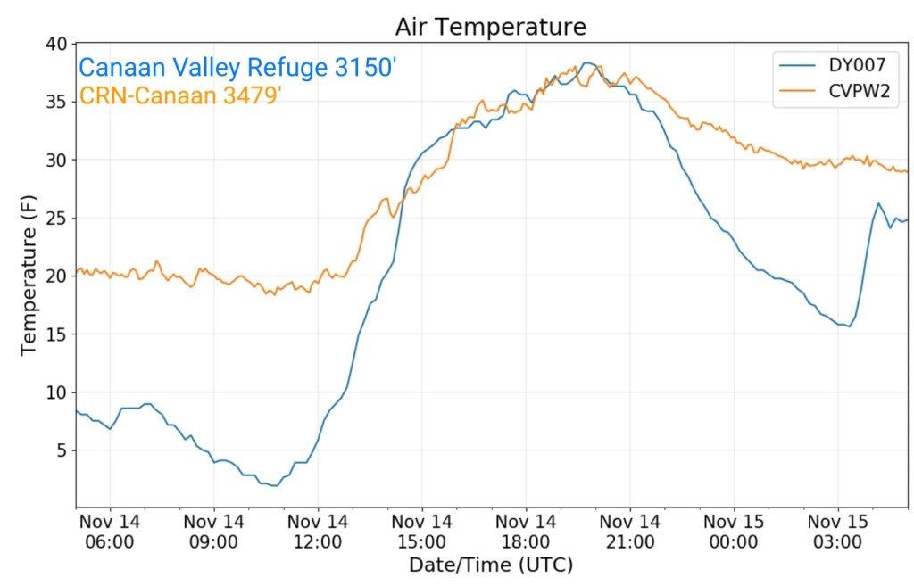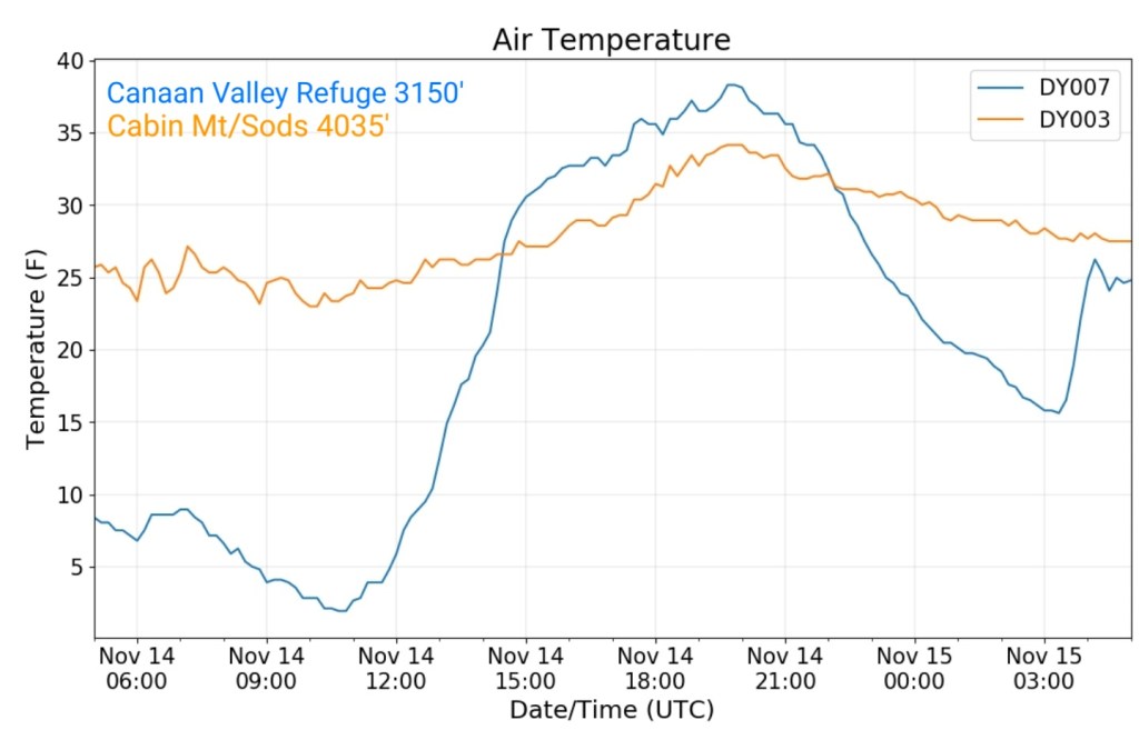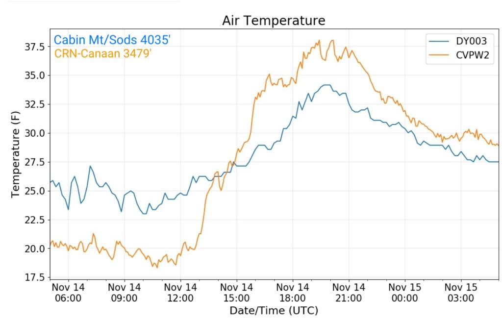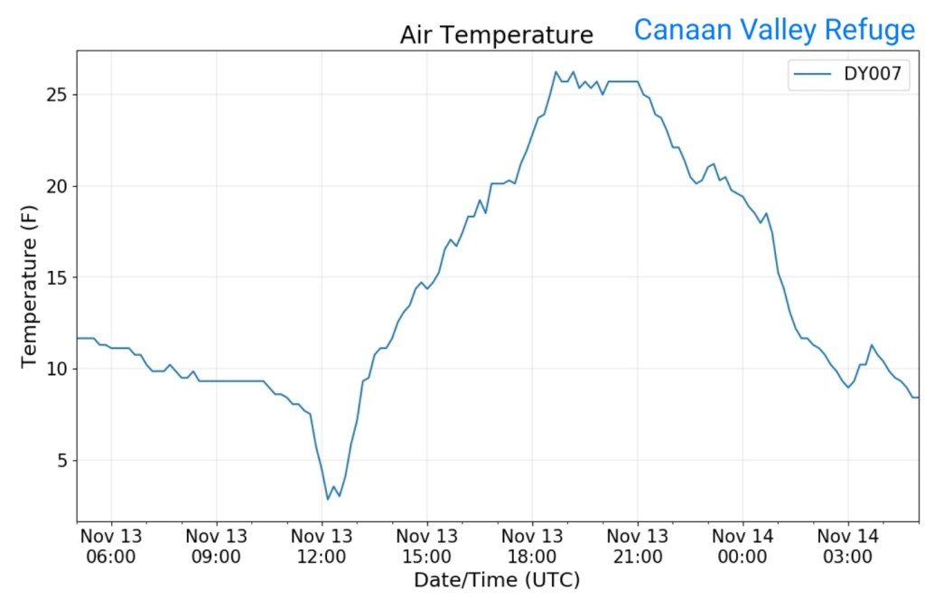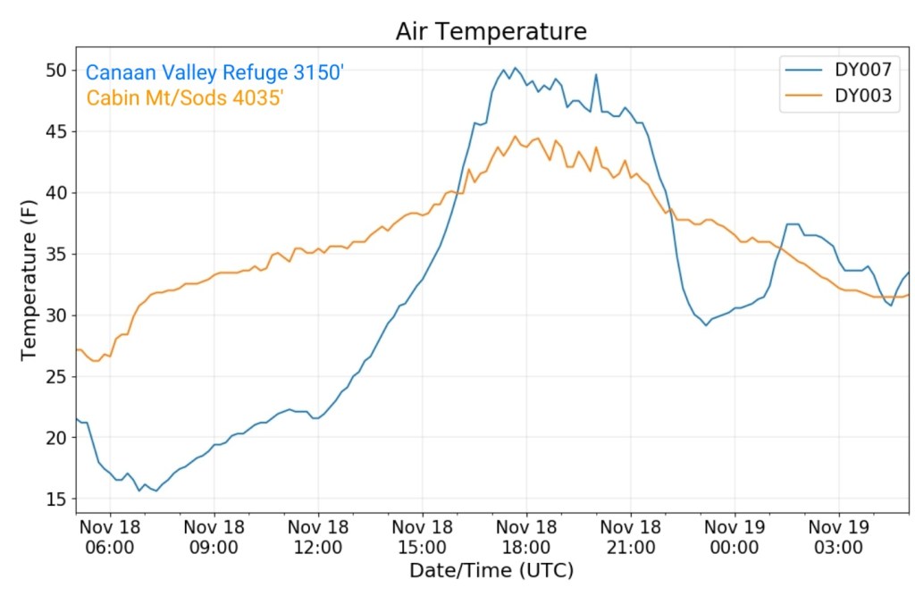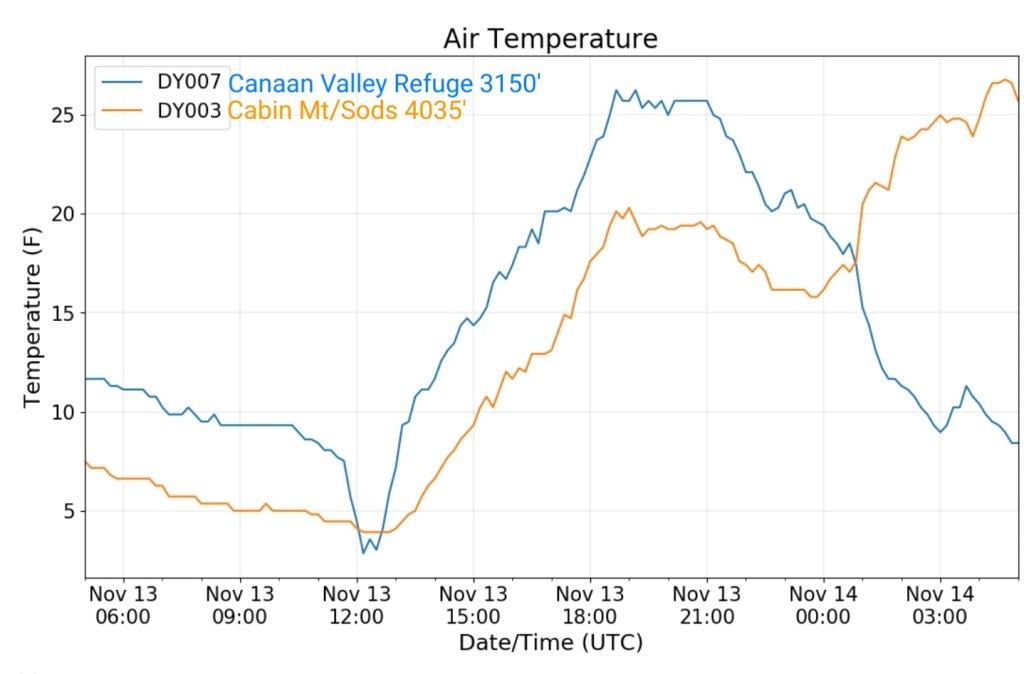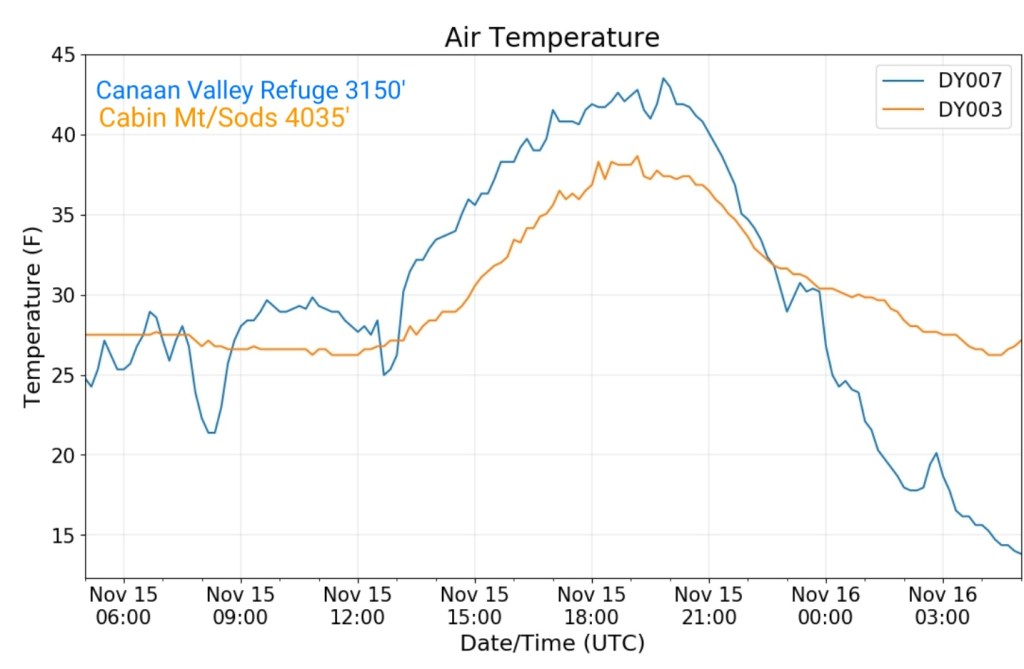 Early evening and often the case with an incoming cold front with precip, conditions go calm in the Valley, skies- if clear or partly cloudy temps will obviously drop greater, but temps usually fall off fast, then rise fast ahead of the front as winds increase. Case in point- the Valley last night.