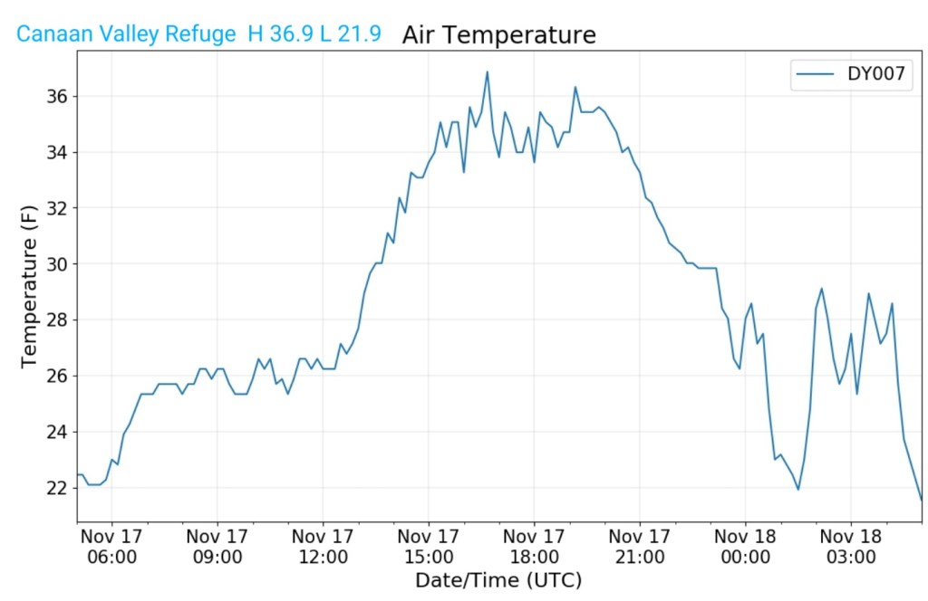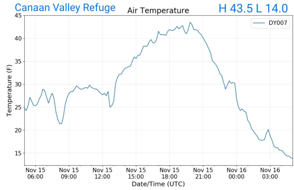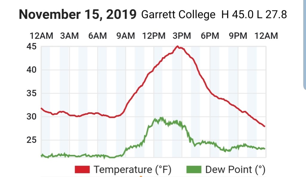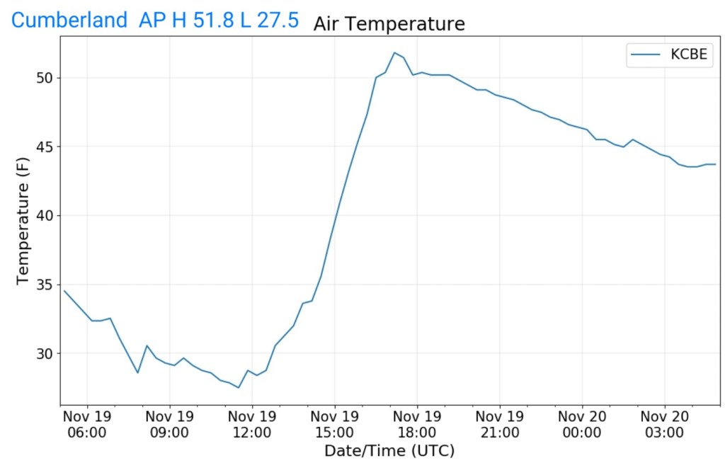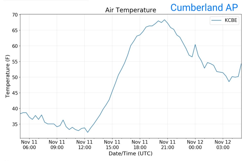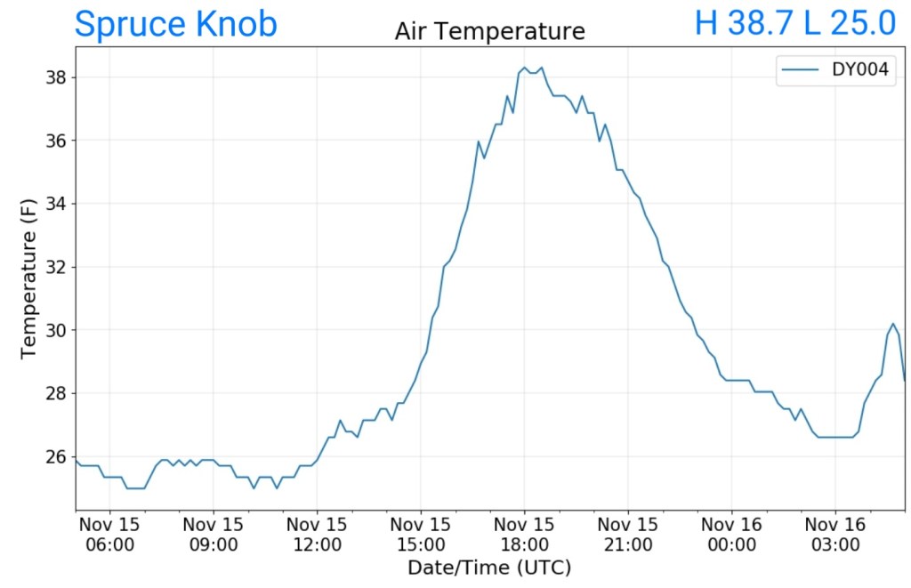 Day began cloudy until daybreak..some areas cleared prior to daybreak allowing temps to fall off more. Light SE flow today kept areas in the north and eastern Alleghenies colder.