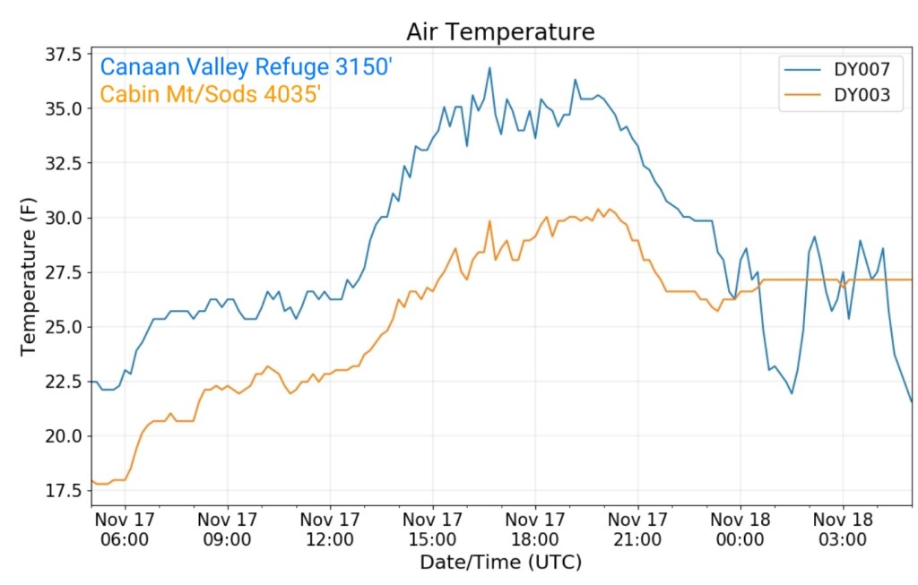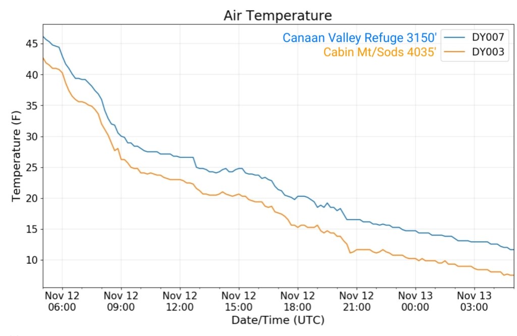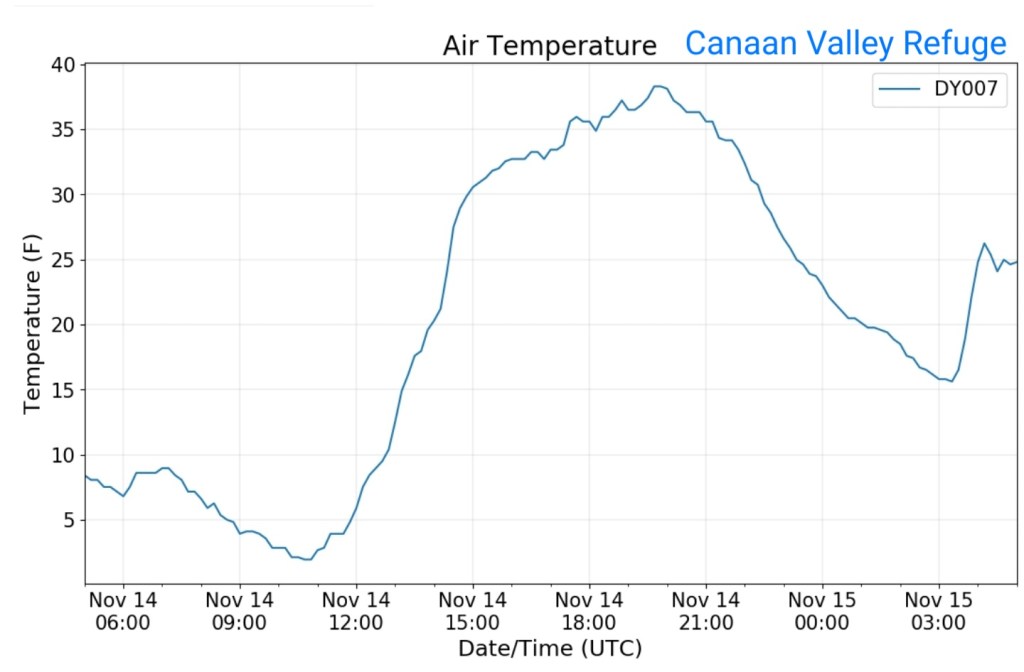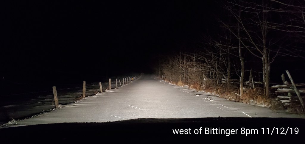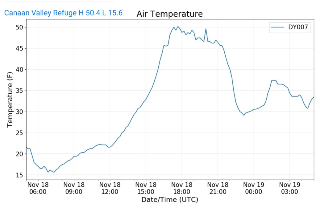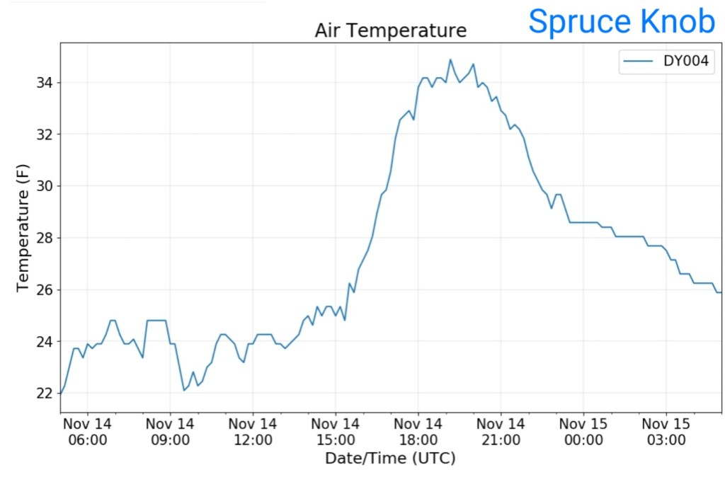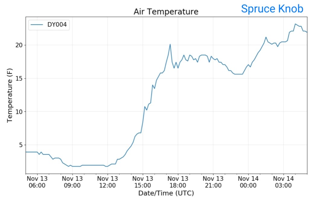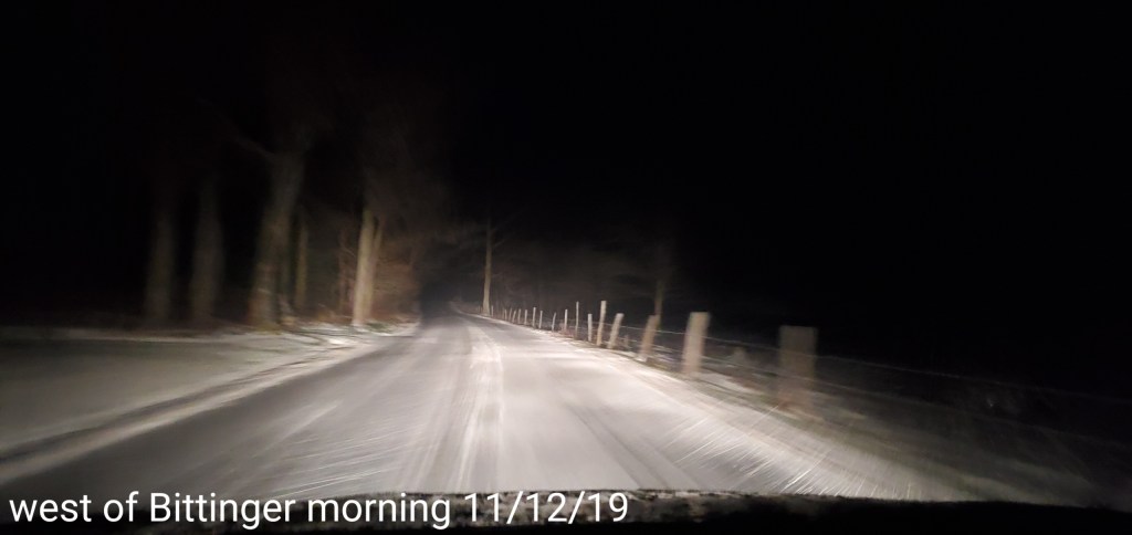 East flow, north central Garrett, points east, and down along the Allegheny Front to the Sods and east saw lots of cloud cover. Some rime across the high Wv on east facing slopes. Sods, Spruce especially. With a dusting of snow, which I believe was just suspended moisture that froze and fell..