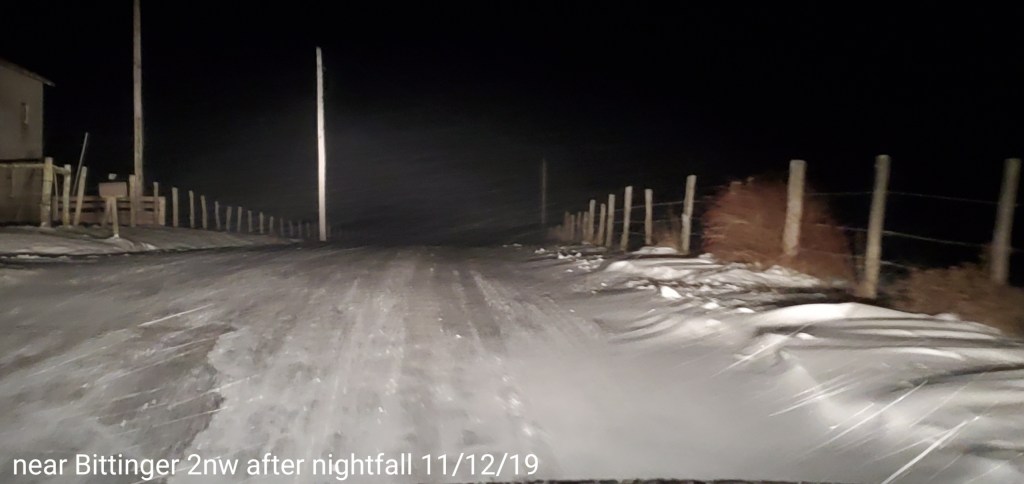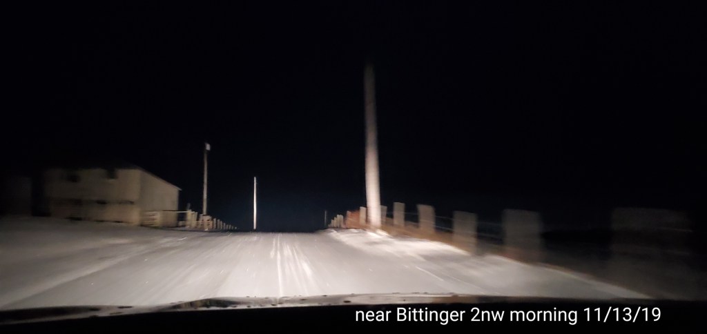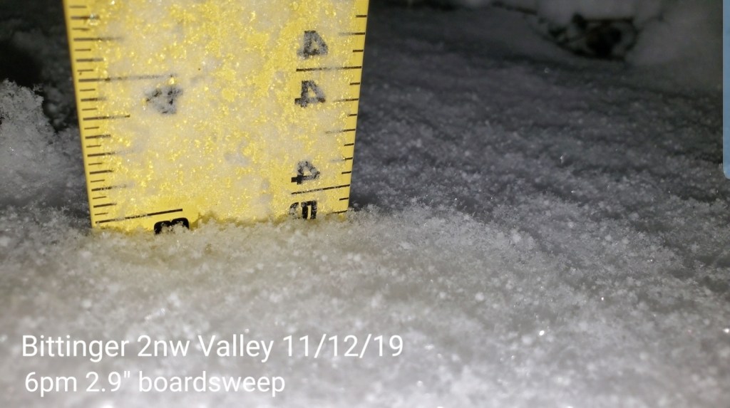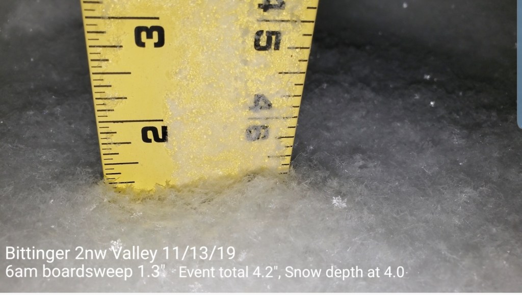 Bittinger 2nw Valley- picked up 1.3″ overnight of absolute fluff. Event total of 4.2″. A morning snowdepth of 4.0″ and a 6pm snow depth of 2.8 with cold temps today, so that gives an idea of how much fluff this was, as in- mostly air with the flakes softly landing and stacking on top each other without settling. This brings the season to date total of 4.5″