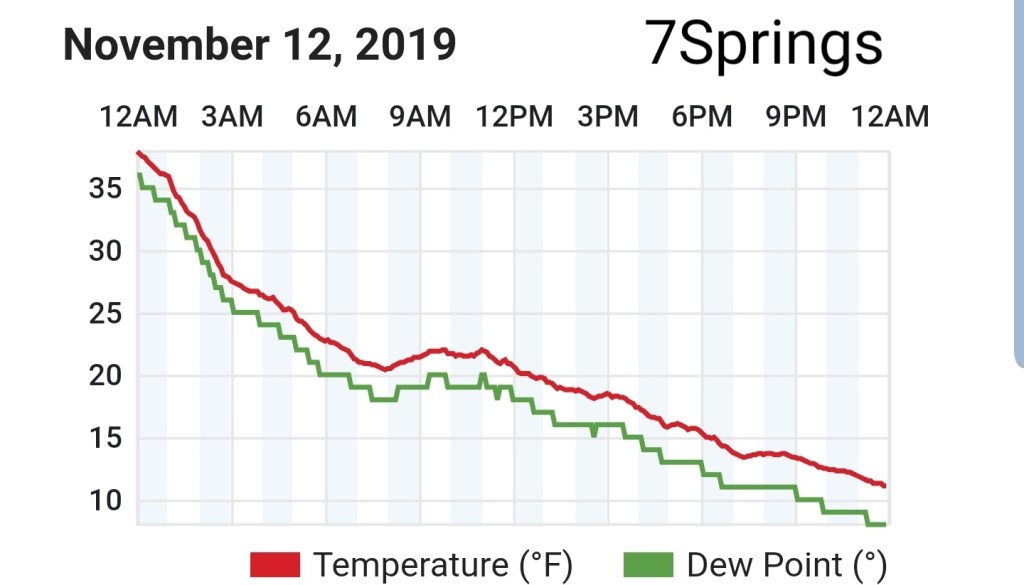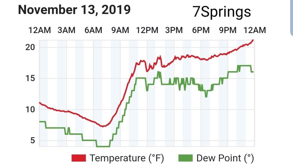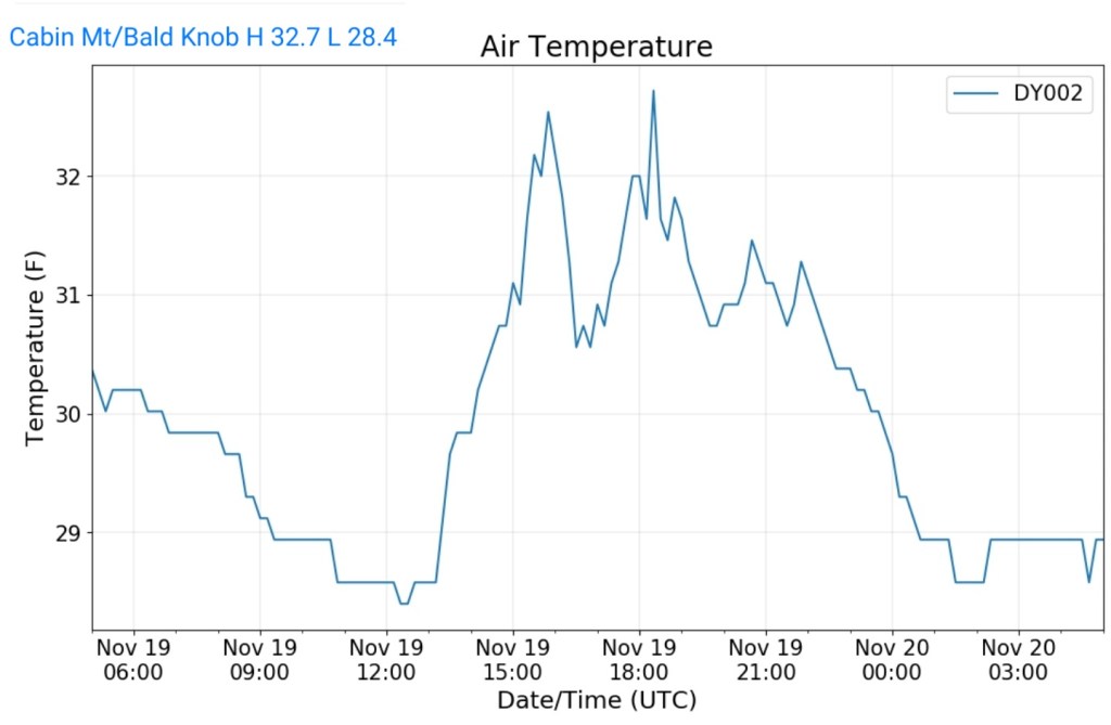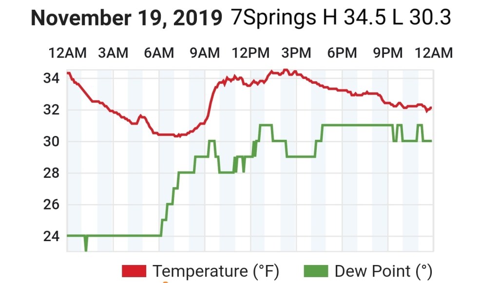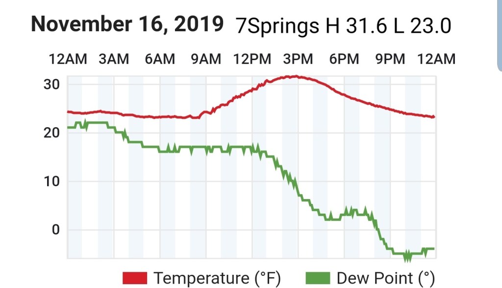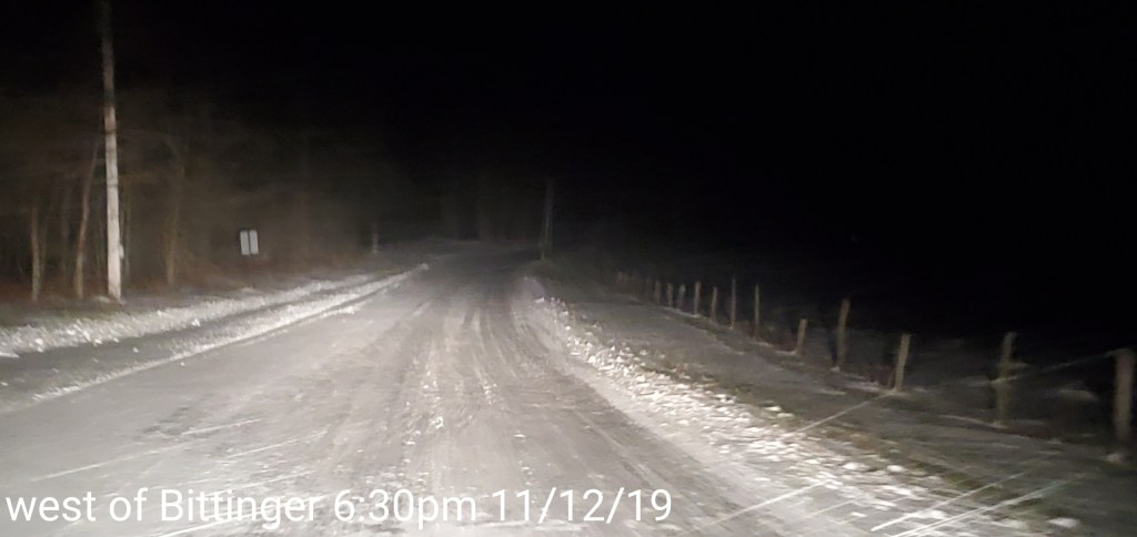 Mainly cloudy, some light precip after nightfall, some high Wv ground time, some localized light snow, localized patchy drizzle and pockets of freezing drizzle. The freezing line reached about 3000′ elevation, however some areas saw pockets of light fine snow with temps +32 and had a light dusting, while some areas saw temps under 32 with freezing drizzle. All extremely light.
