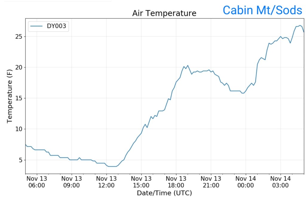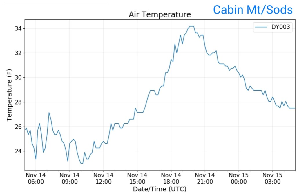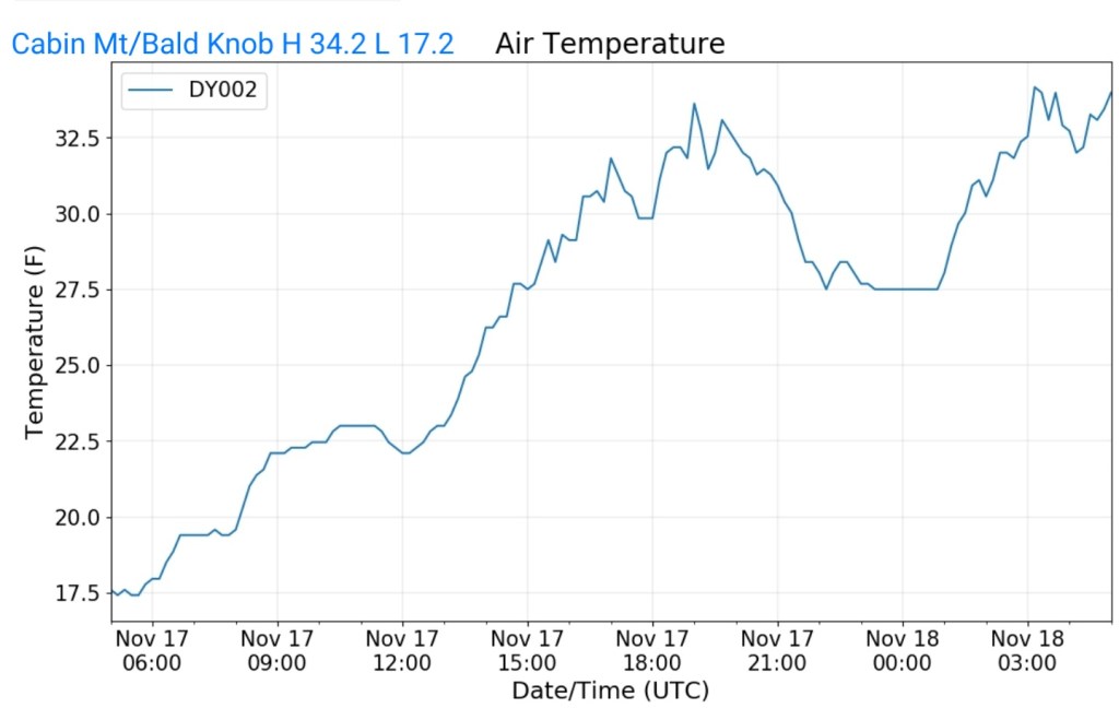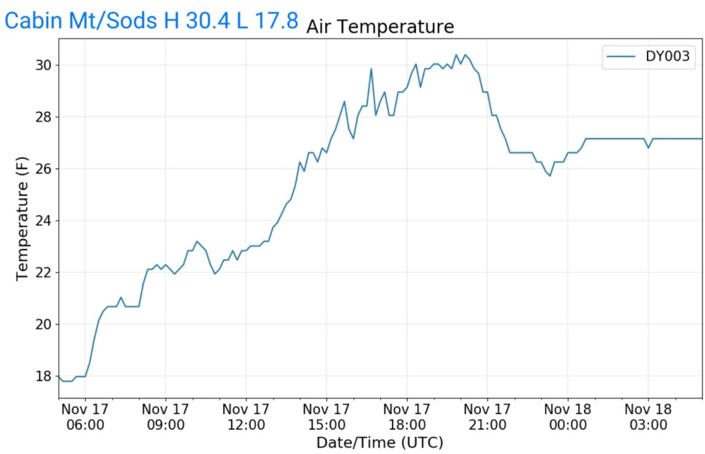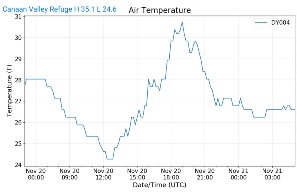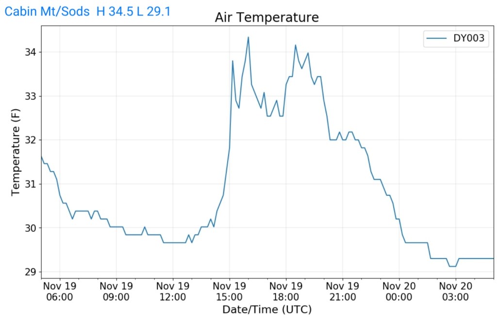 Mainly cloudy, some light precip after nightfall, some high Wv ground time, some localized light snow, localized patchy drizzle and pockets of freezing drizzle. The freezing line reached about 3000′ elevation, however some areas saw pockets of light fine snow with temps +32 and had a light dusting, while some areas saw temps under 32 with freezing drizzle. All extremely light.