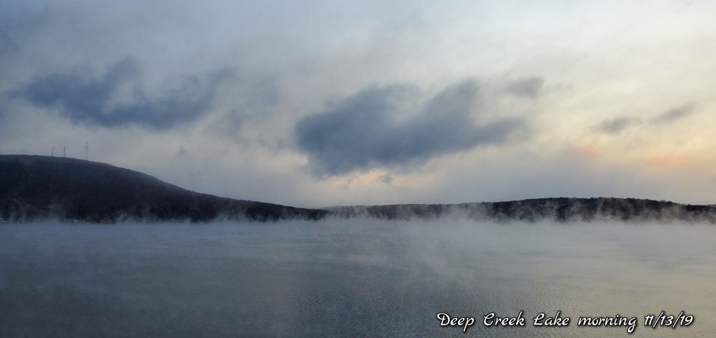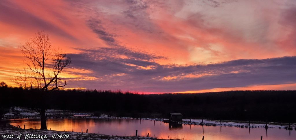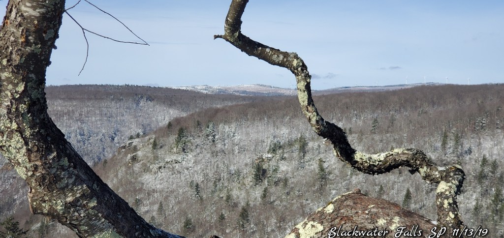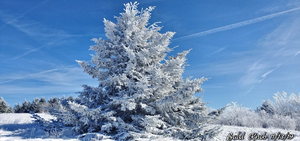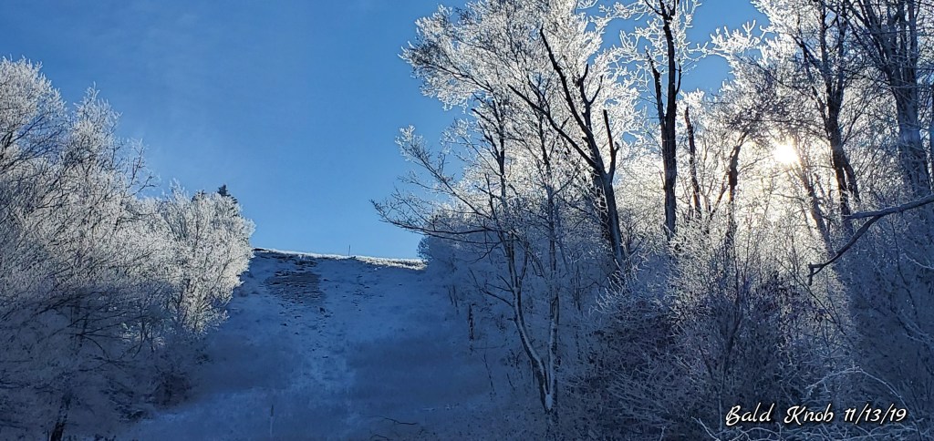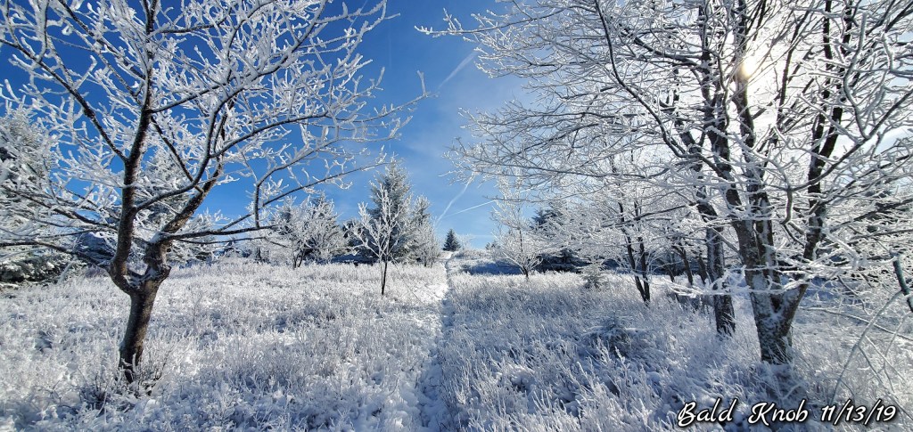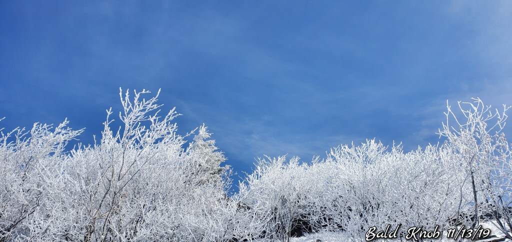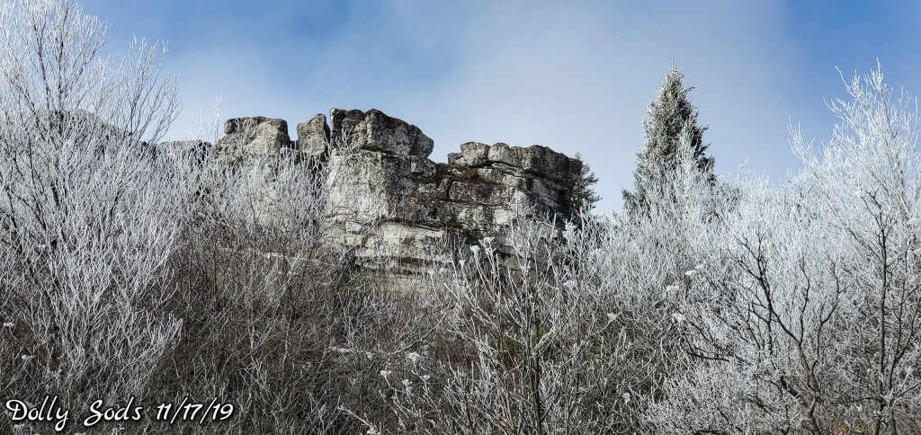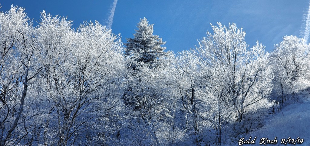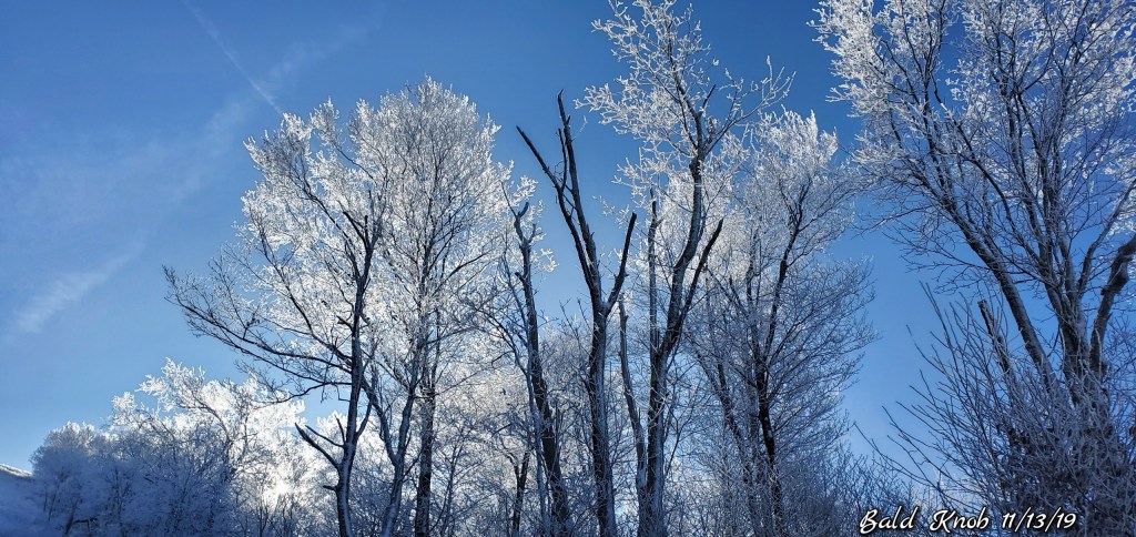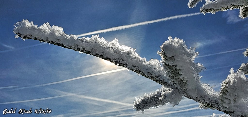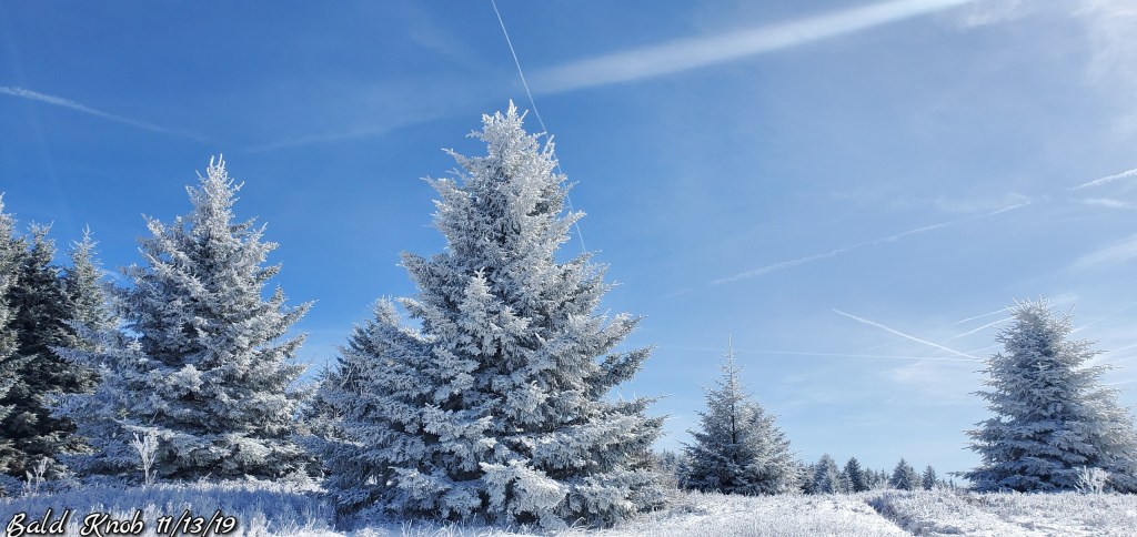The east flow. Low clouds and fog held across the northern areas of the Allegheny Front with intervals of some some. Trees were rimed in from the east..