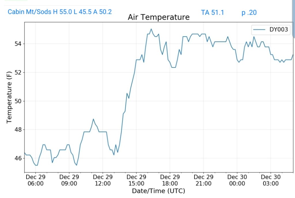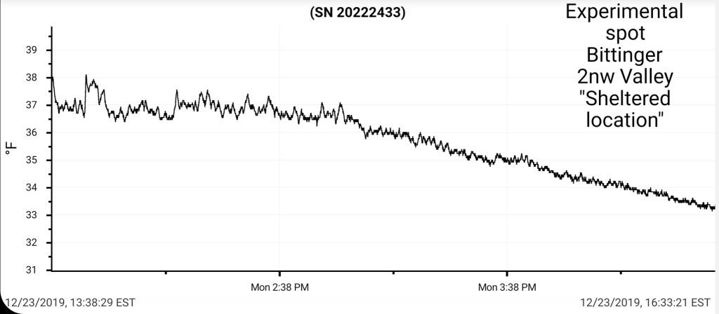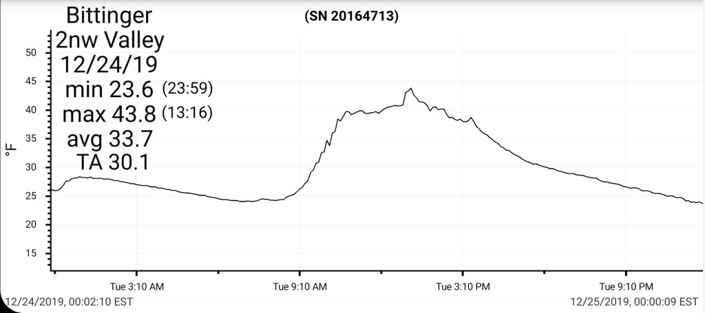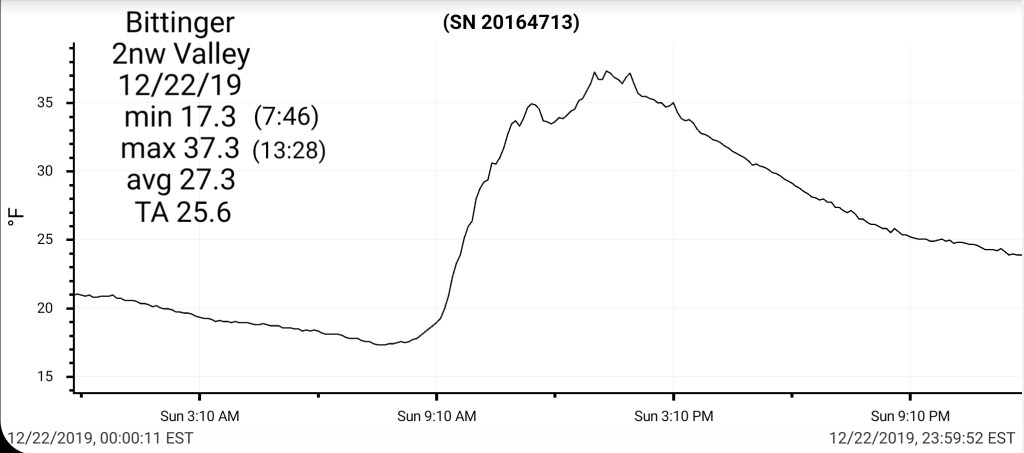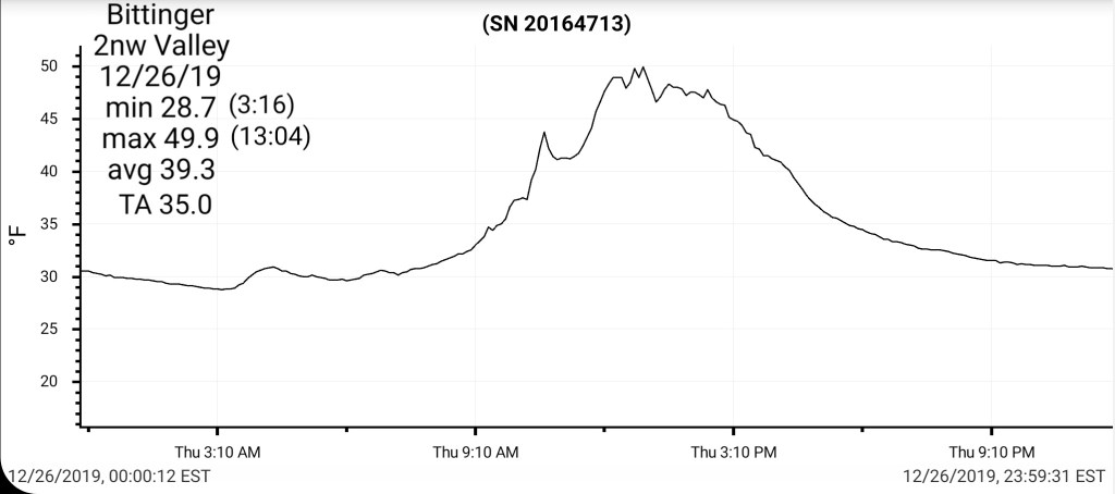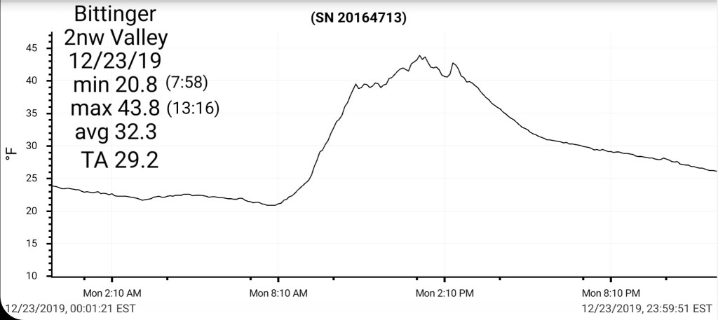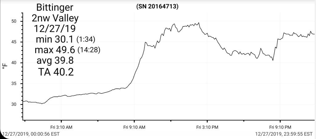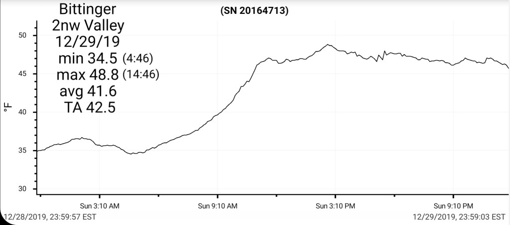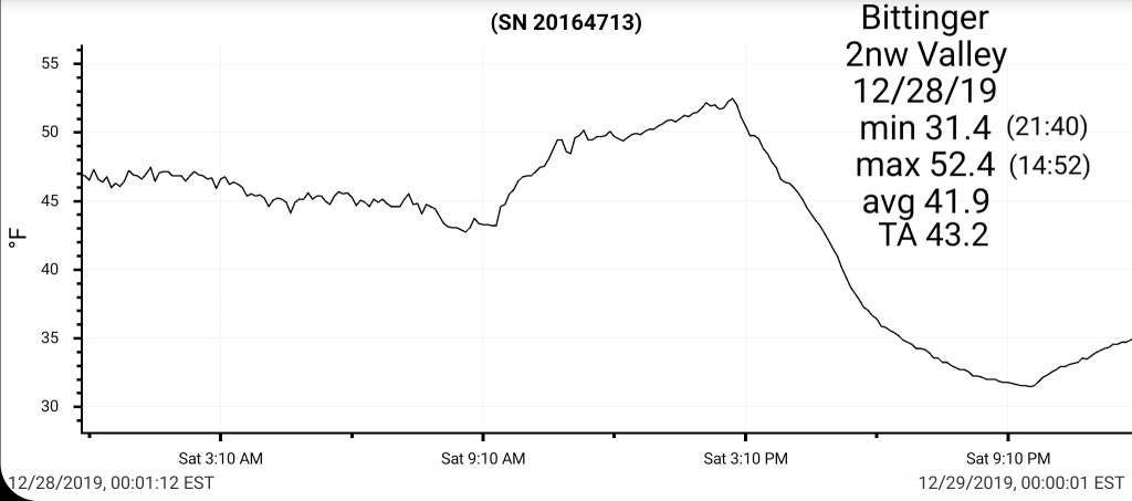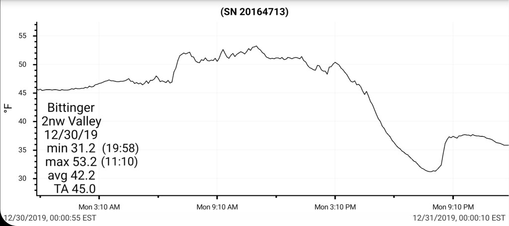 An example of afternoon temps in a more sheltered low area that really works like the supermarket coolers/freezers. This is while most areas were in the 50s