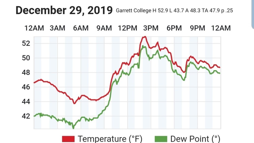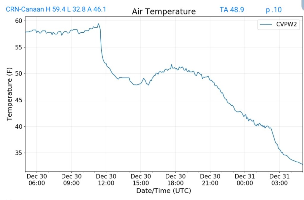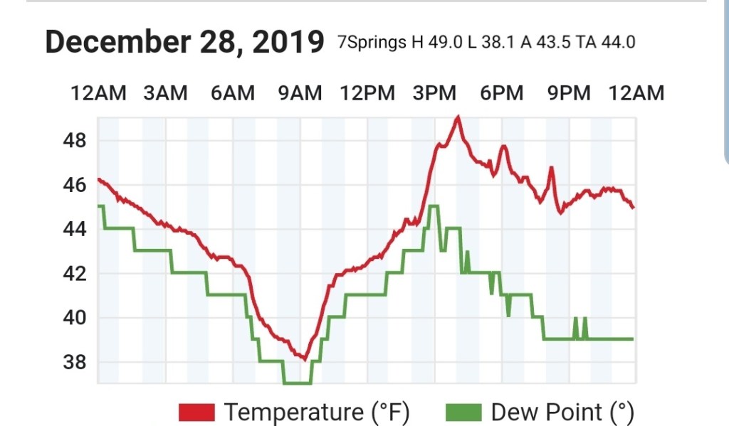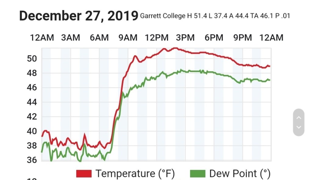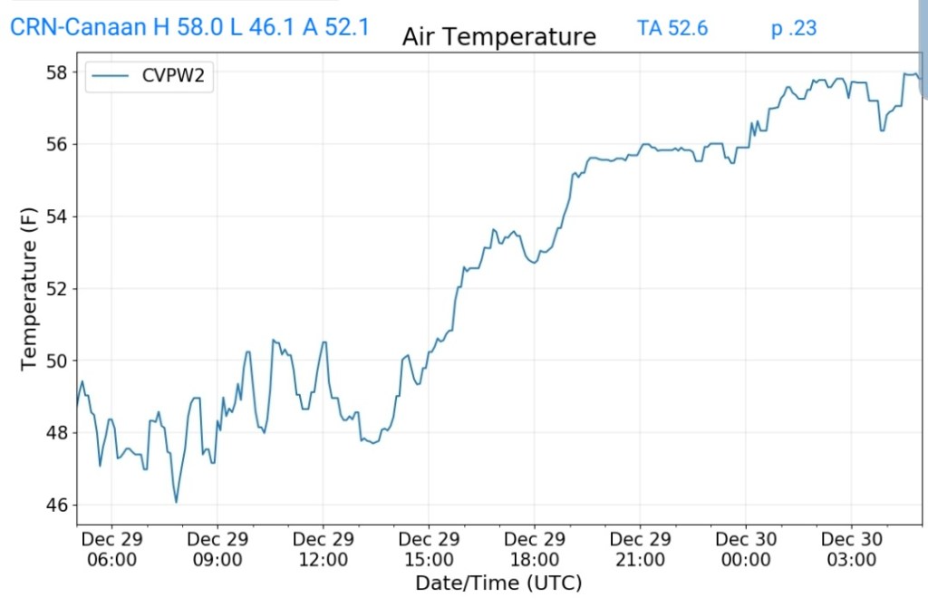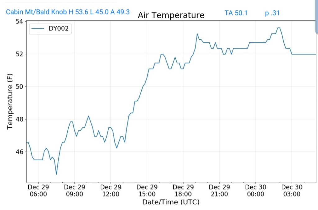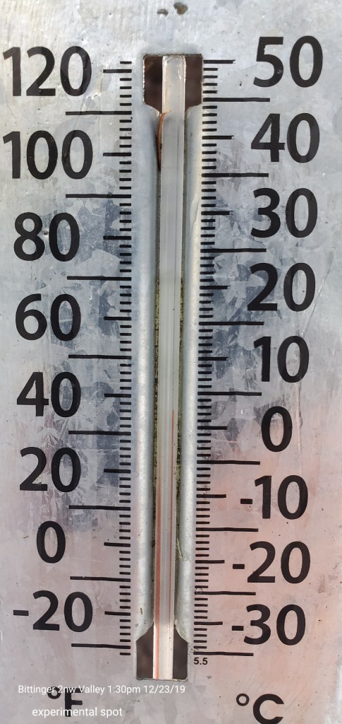 An example of afternoon temps in a more sheltered low area that really works like the supermarket coolers/freezers. This is while most areas were in the 50s