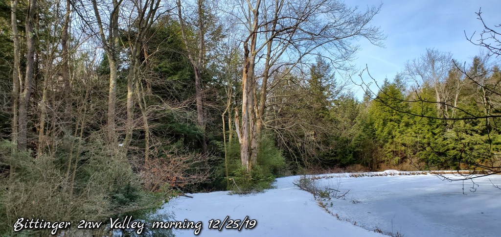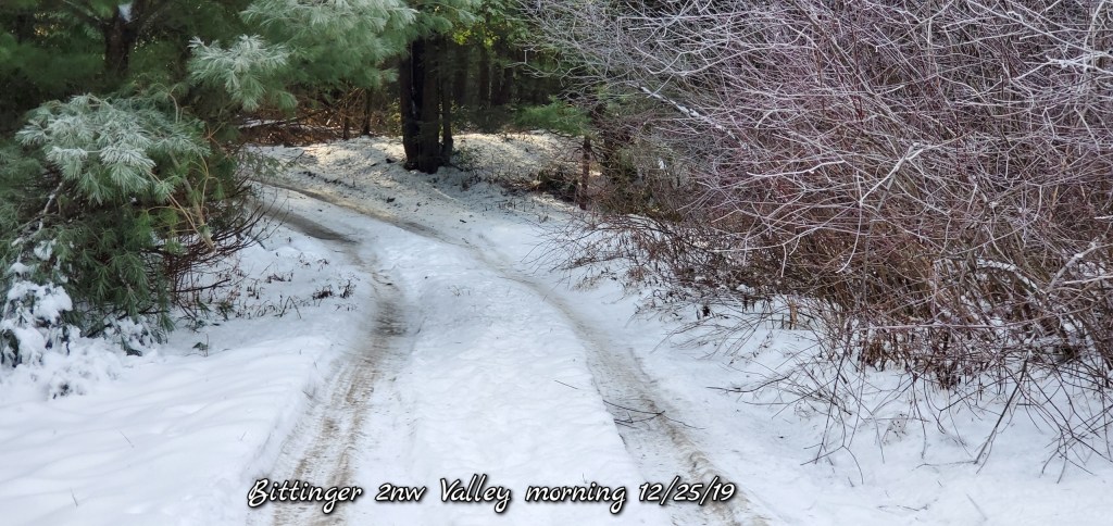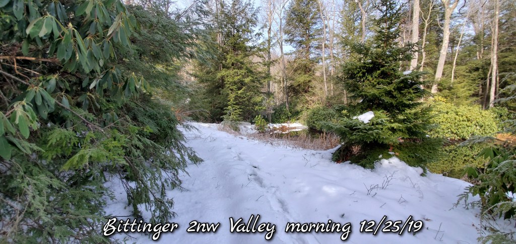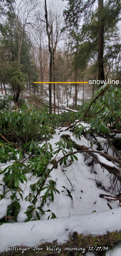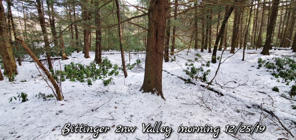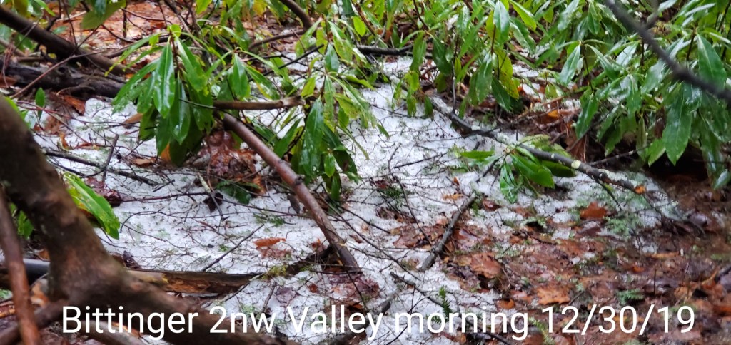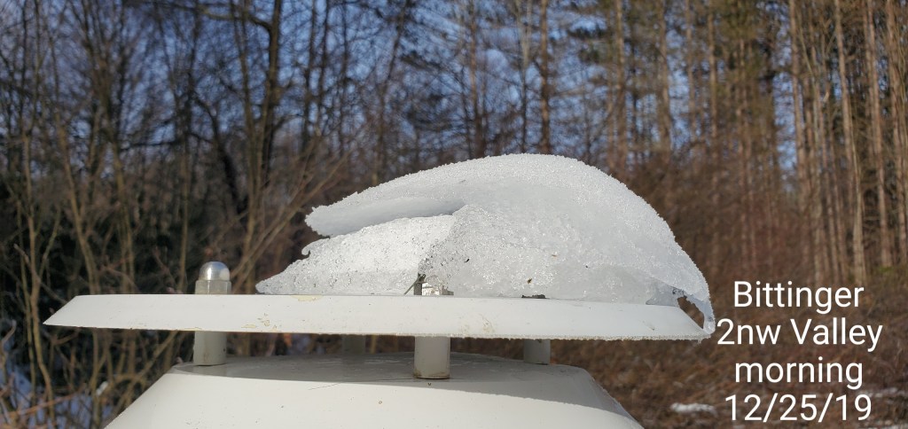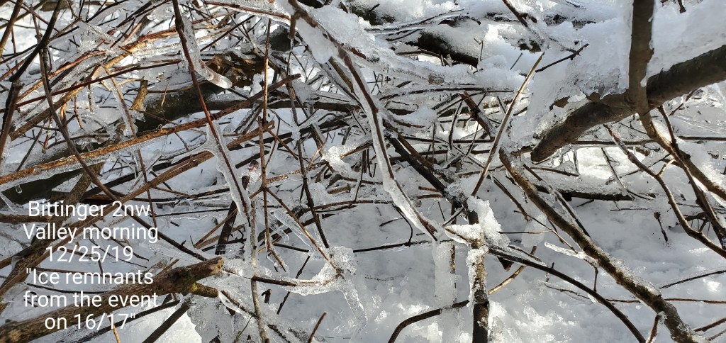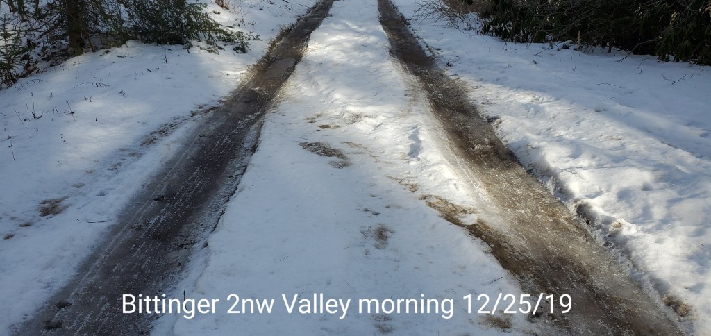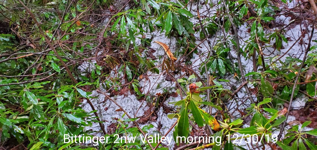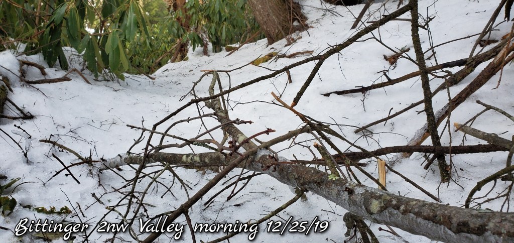 This is an area, that holds cold for the east flow ice events, and west enough to do well on upslope events. Also a sheltered valley that holds cold well. Evident by the temps and remaining snow(lots of pics below)that gave a white Christmas to this area. At 9am, a 3″ hardpack remained.