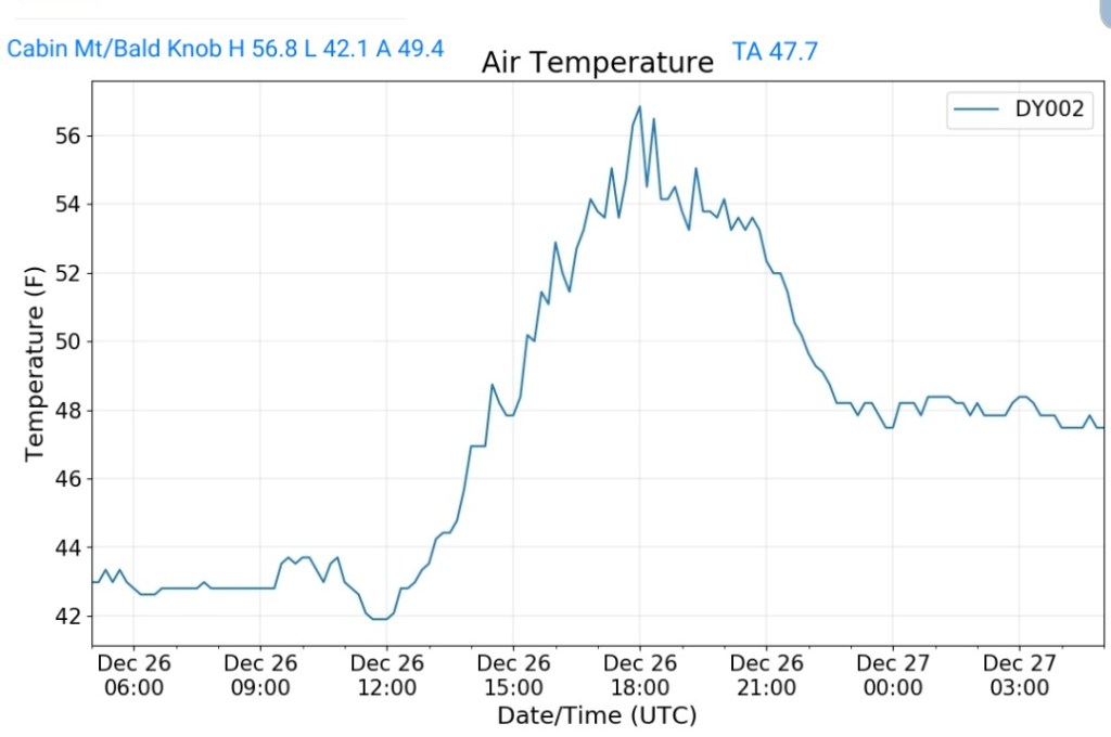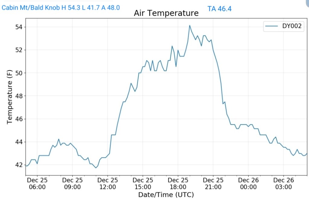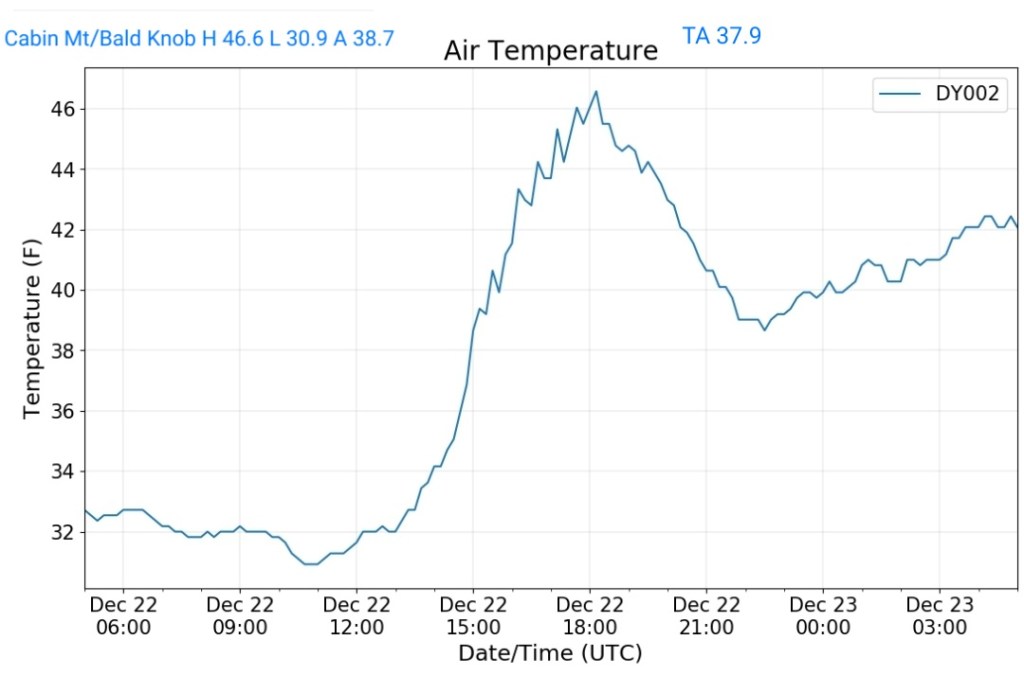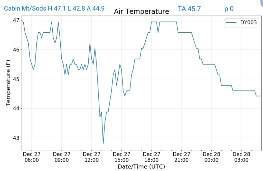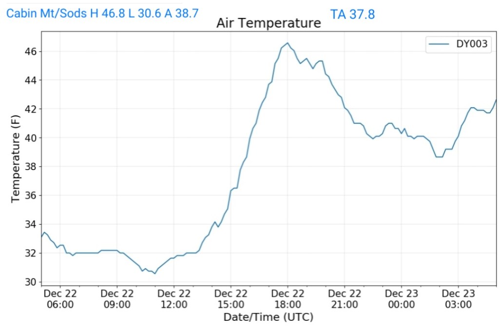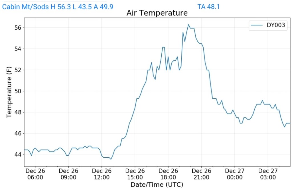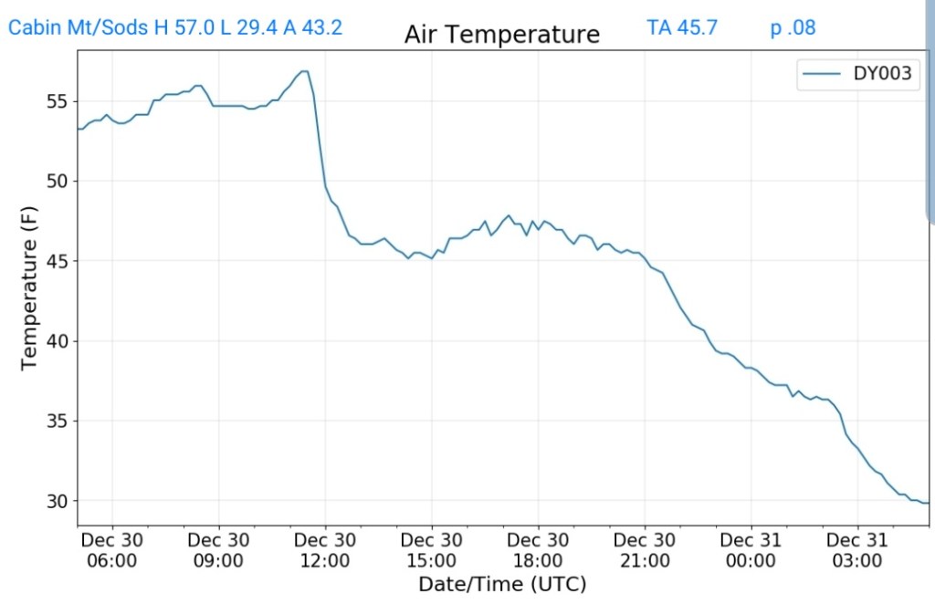 Clouds thinning to a high overcast and thinning by evening. Stars visible. A brief but rapid Valley cooling occured before cloud cover and light winds returned overnight.