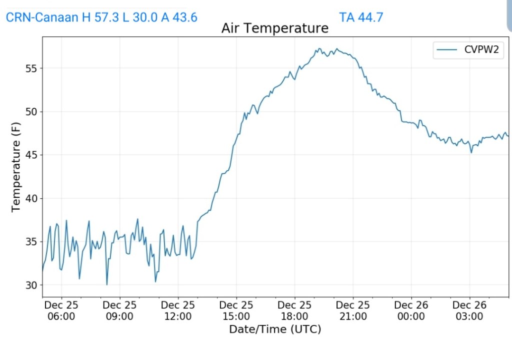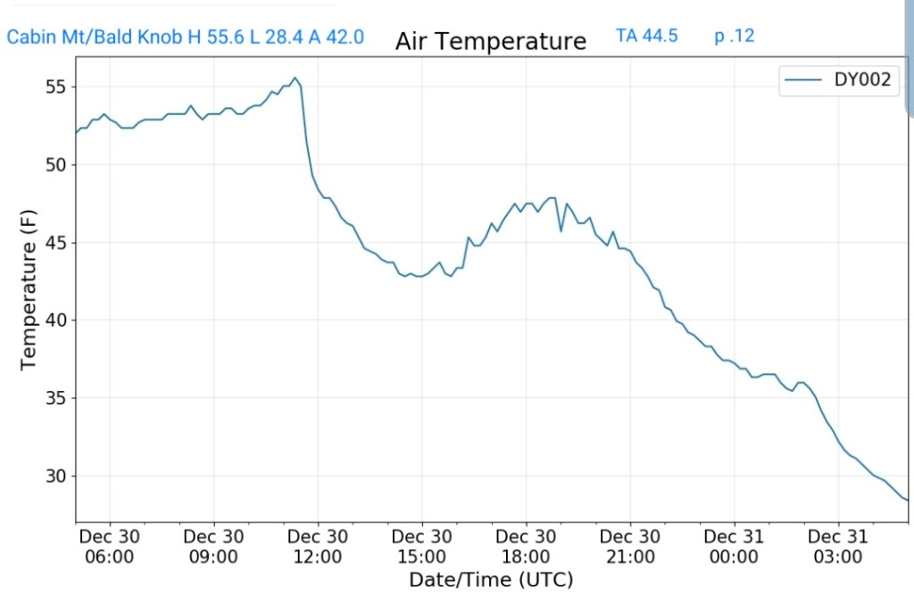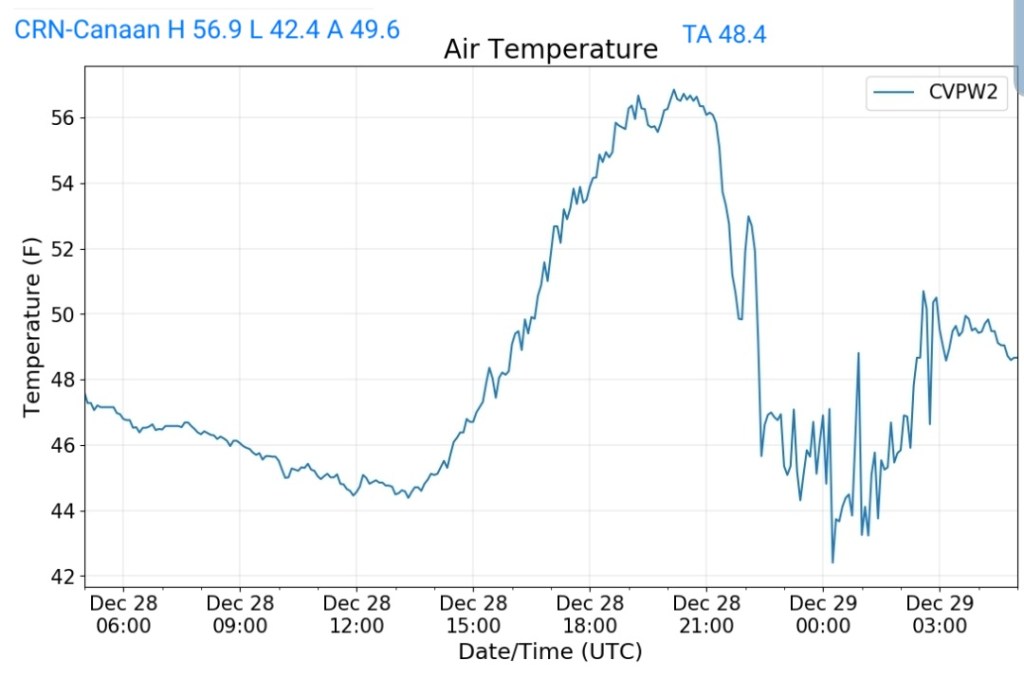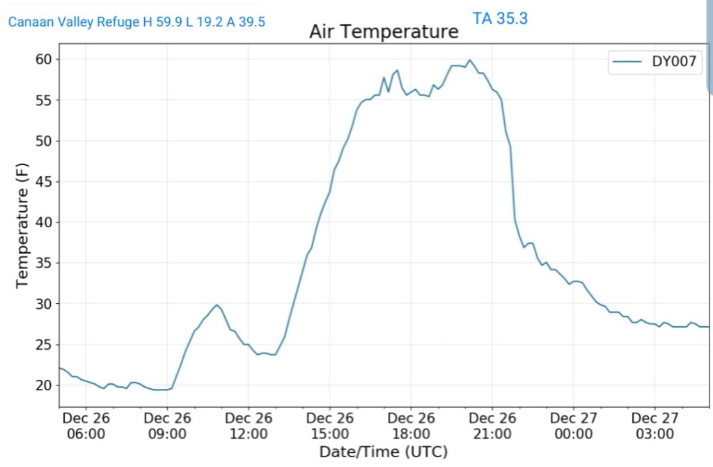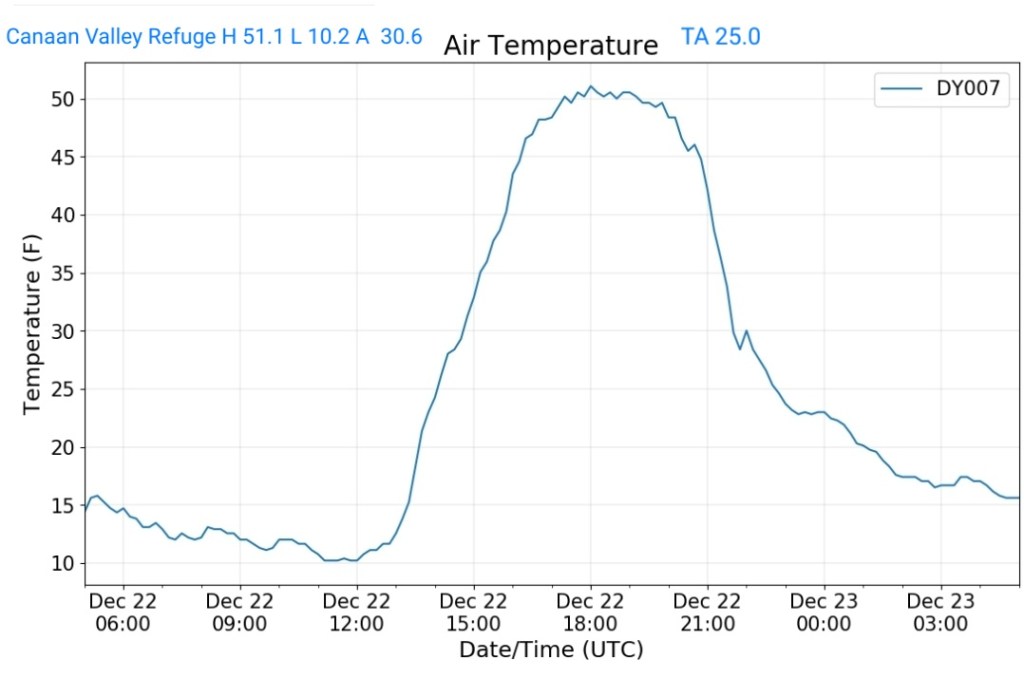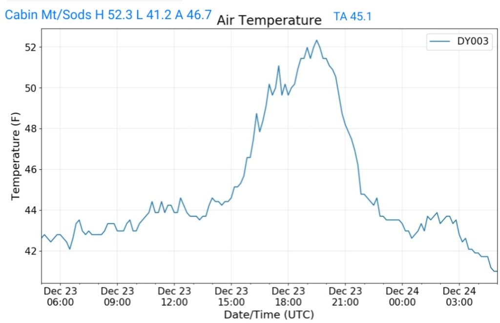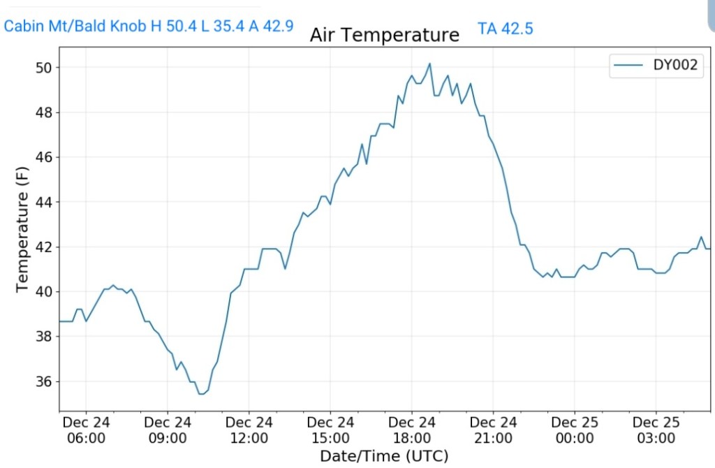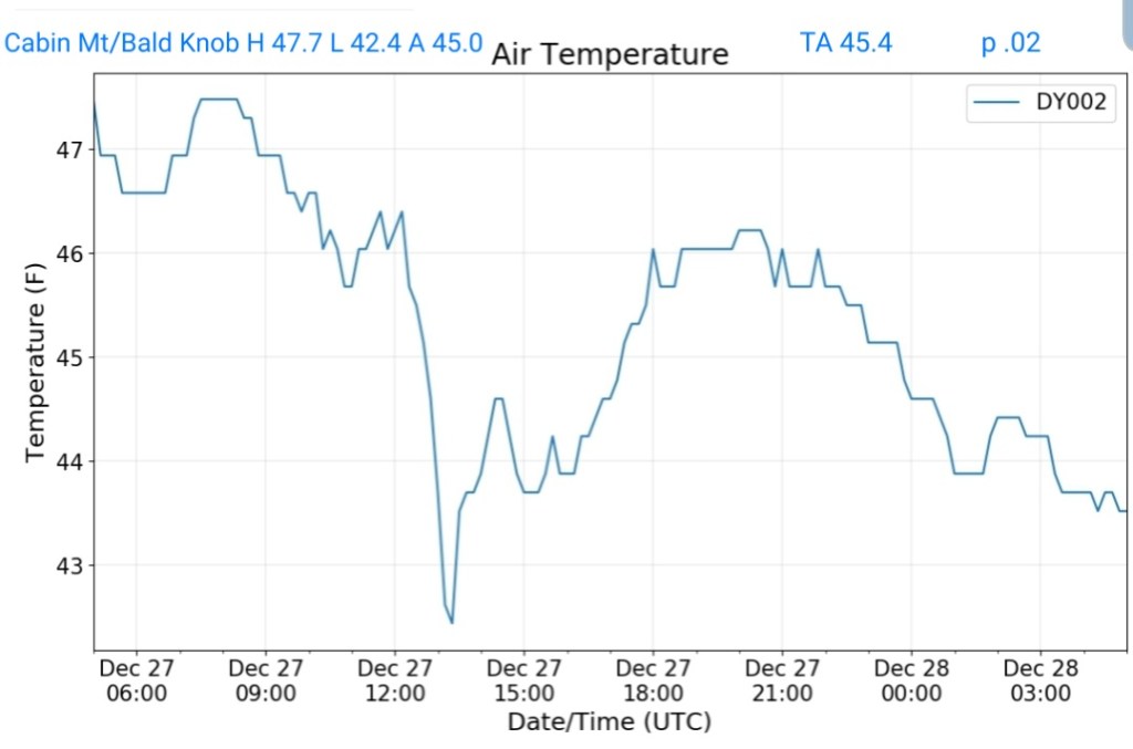 Clouds thinning to a high overcast and thinning by evening. Stars visible. A brief but rapid Valley cooling occured before cloud cover and light winds returned overnight.
