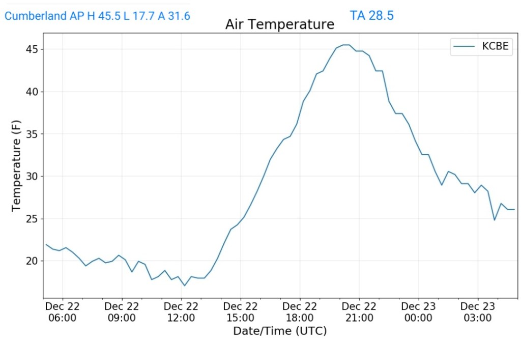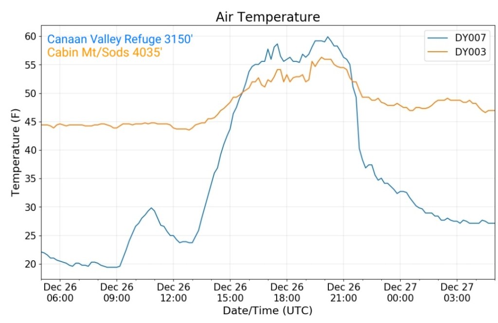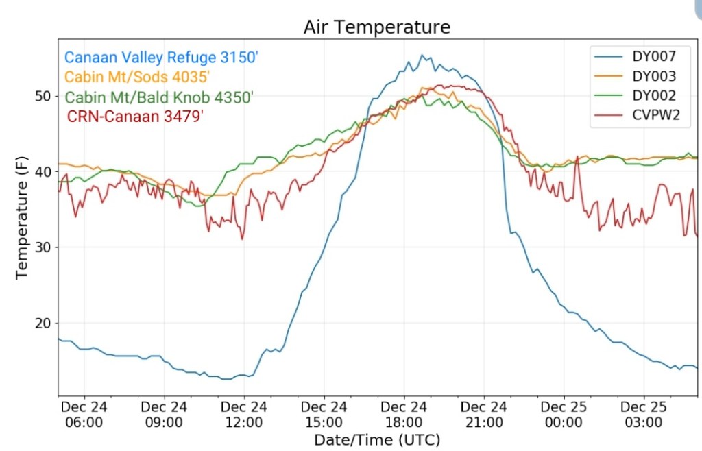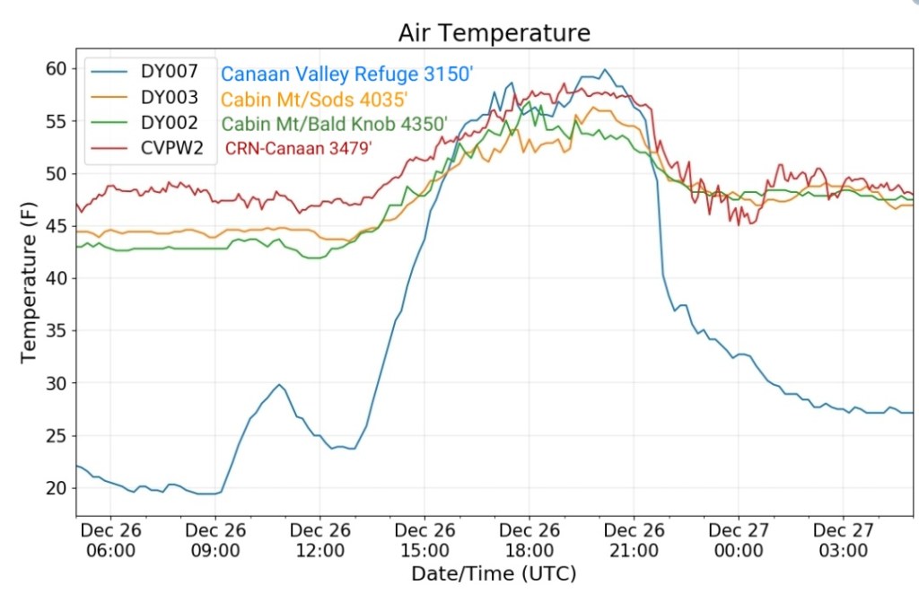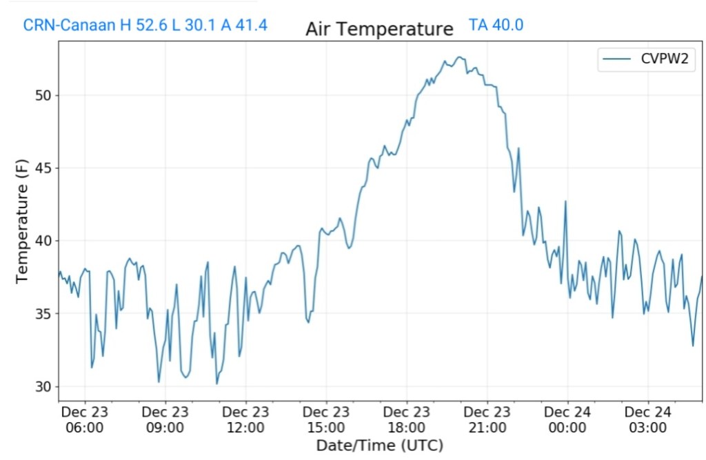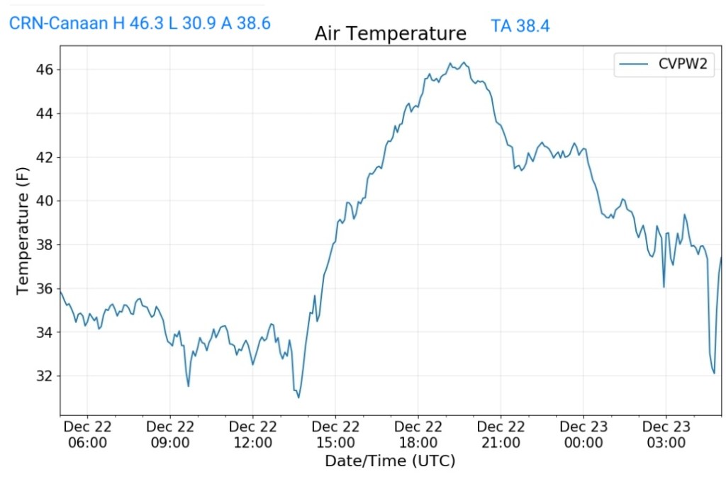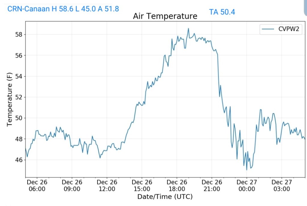 Clouds thinning to a high overcast and thinning by evening. Stars visible. A brief but rapid Valley cooling occured before cloud cover and light winds returned overnight.