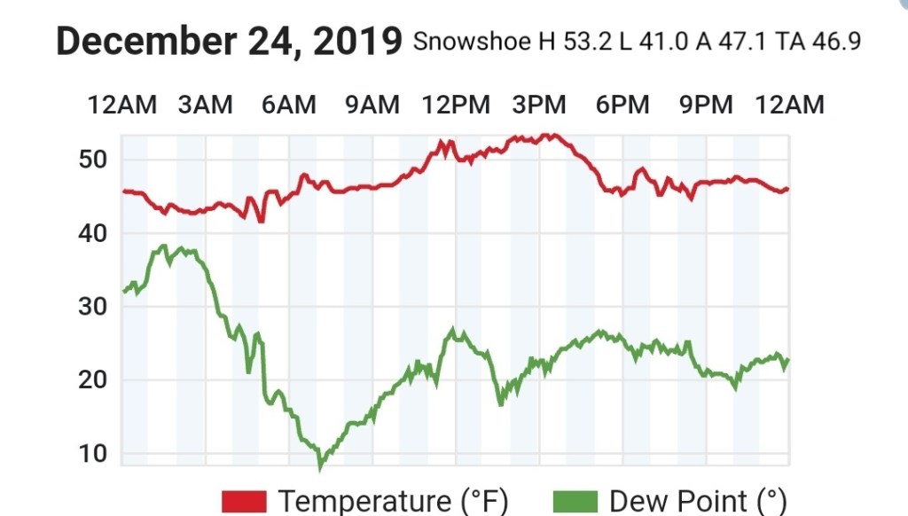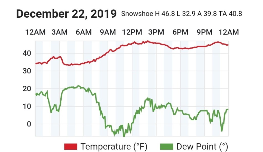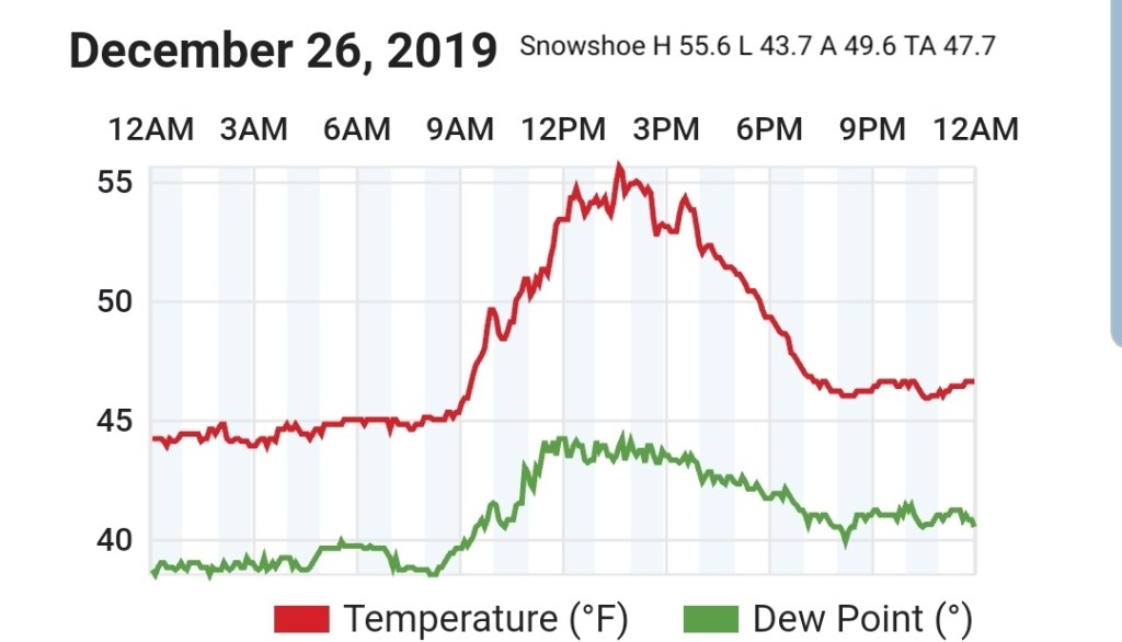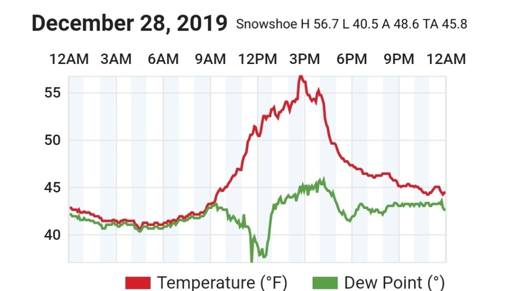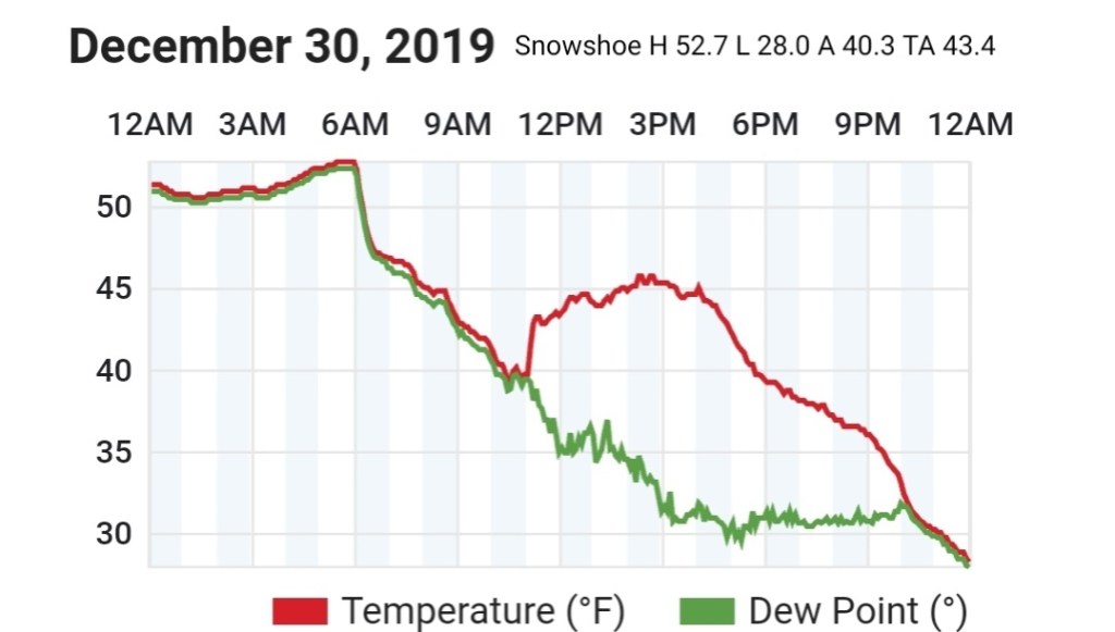 ok, timeout for the next image. A terrific example of how this works. Again, light winds are key, in which we have seen up until this afternoon. Low dewpoints also aid in snow preservation, which was the case up until this afternoon. So picture a 50° dry airmass, low sun angle. It doesn’t melt snow fast. A steep hillside, covered in snow. No wind to scour away the cold coming off the snowpack sinking to the lowest point, in this case the Valley bottom. The temps up high do melt the snow slowly, while the Valley sees little to no melt with the low dewpoints. As dewpoints increase, the cold air still sinks to the Valley as cold air does, however it’s less successful in preserving it’s own pack. Temps however remain much colder than up higher. As the pack leaves up high, and melts off, the snow line works it’s way down the hillside. The cold air to come off the pack becomes less and less, the Valley still holds cooler, but less so and with dewpoints and lights winds in play, the effect becomes less and less and the Valley begins to melt off. Which was the case, especially after nightfall when the winds held up. Here is a pic that is a great example of this