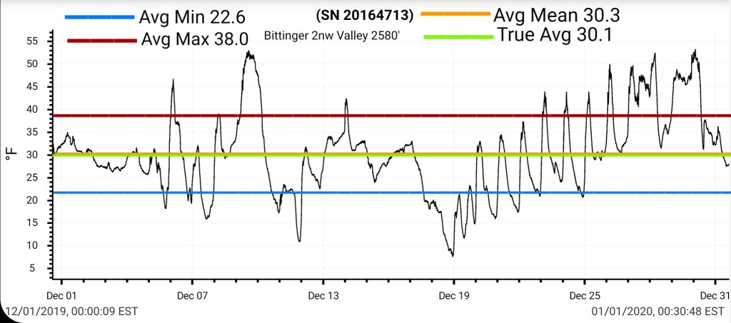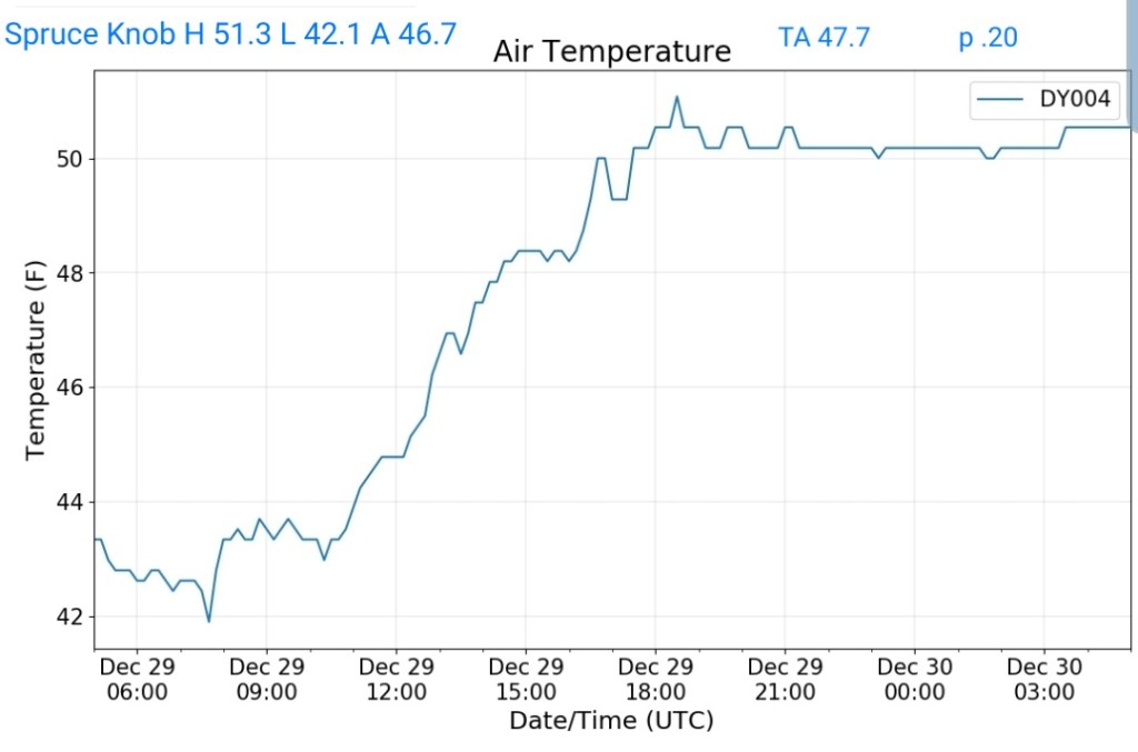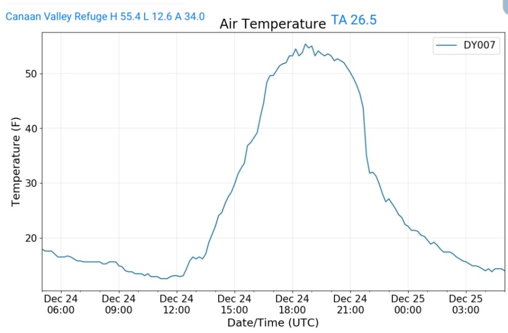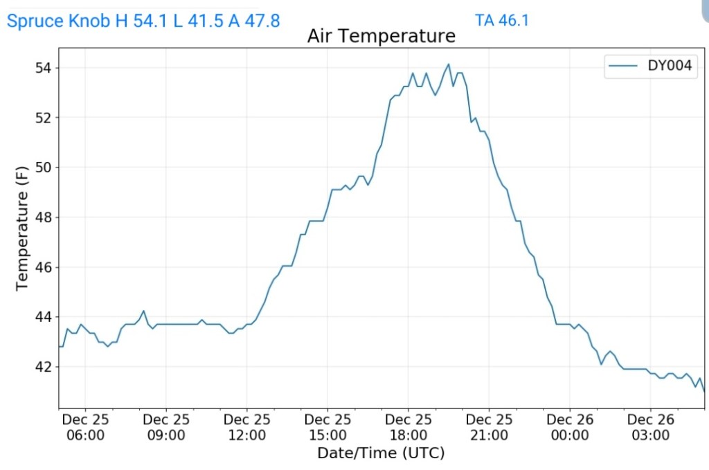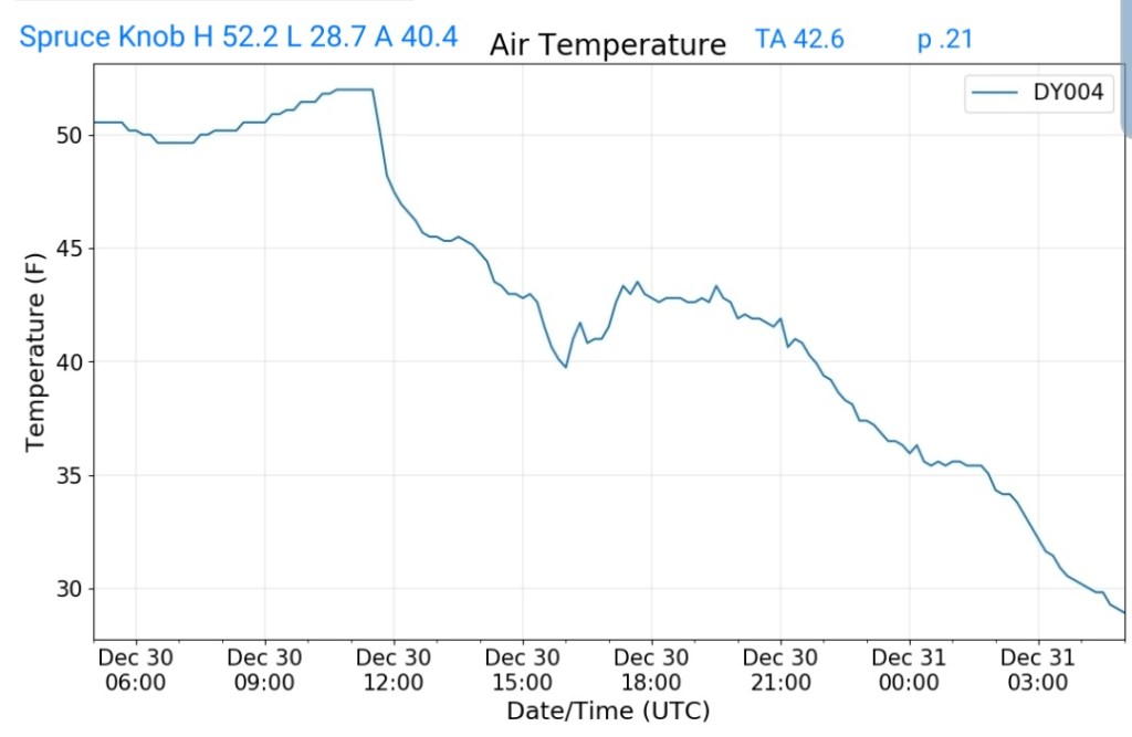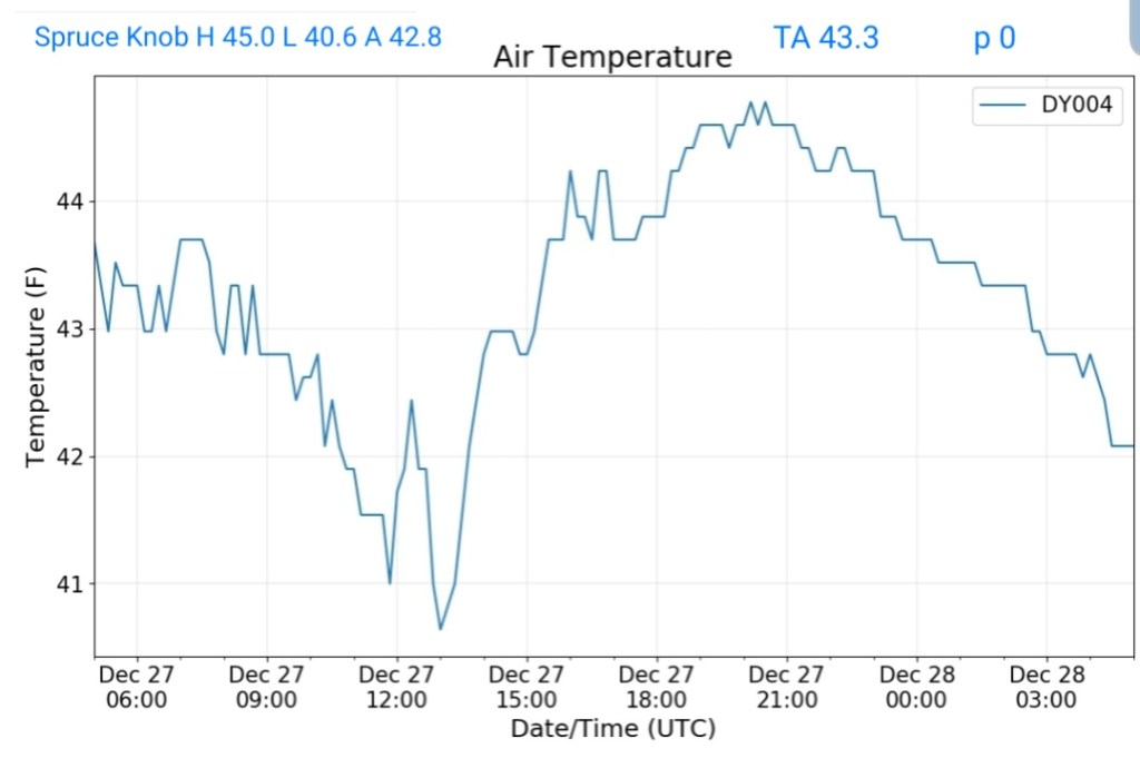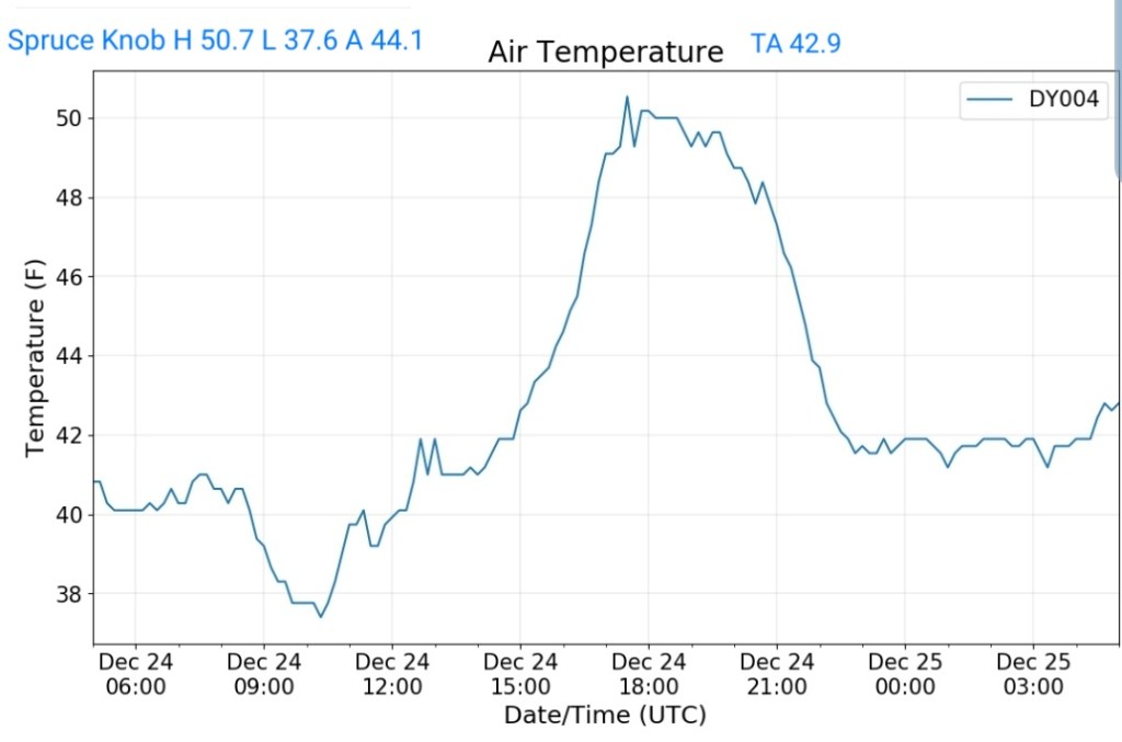 In some of the fascinating microclimates, a decent snow cover remains today. Example here near Bittinger, in Garrett County, just today at 2550′. This is a product of a sheltered valley holding cold in much the same way as a supermarket cooler works. The low dew points, calm winds, short days, these type areas do well in holding cold. Case in point below: