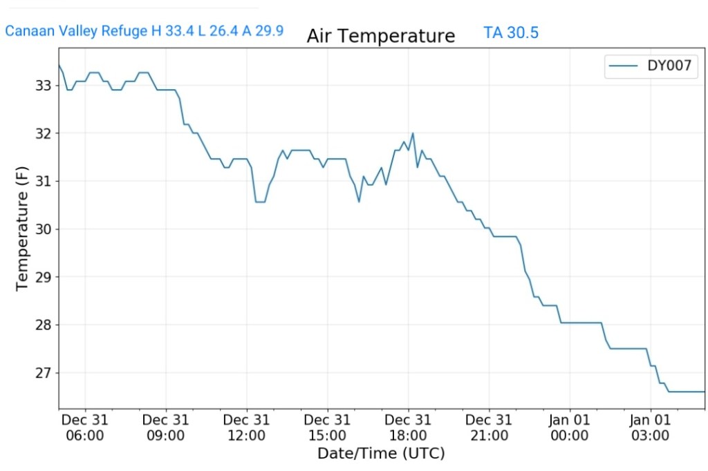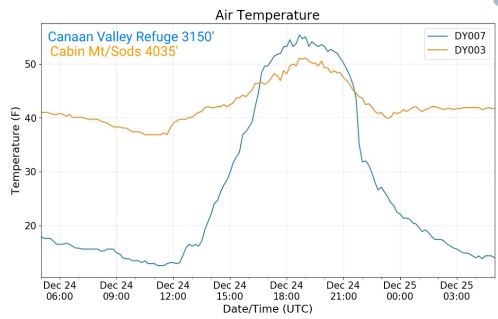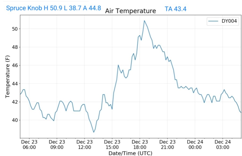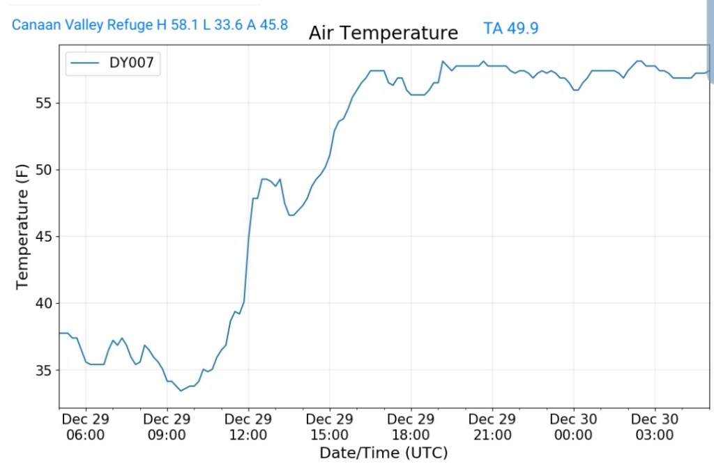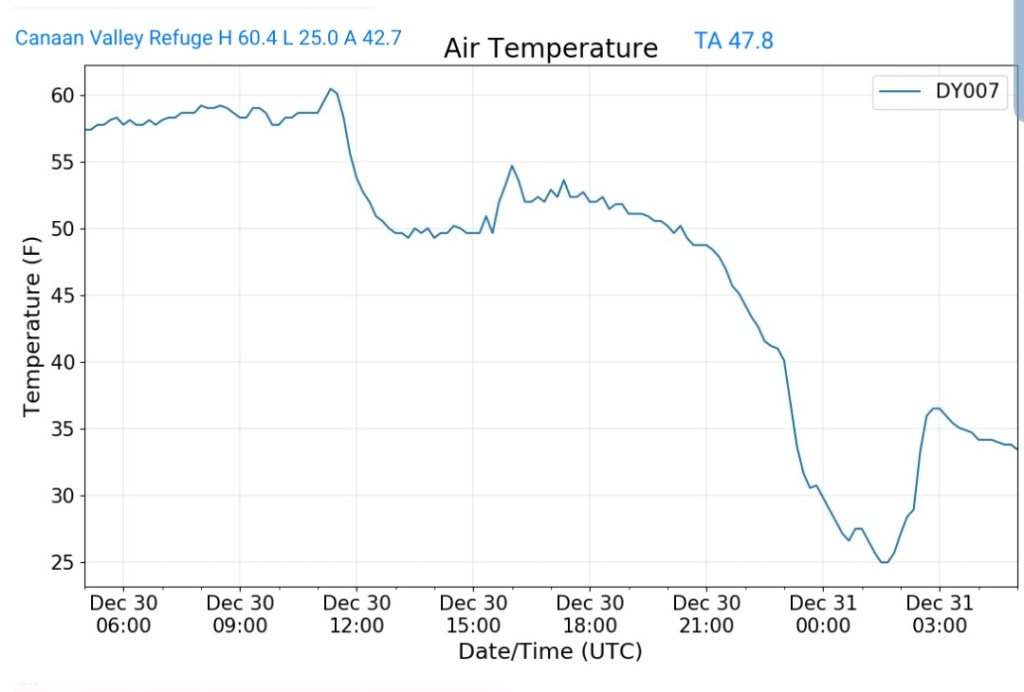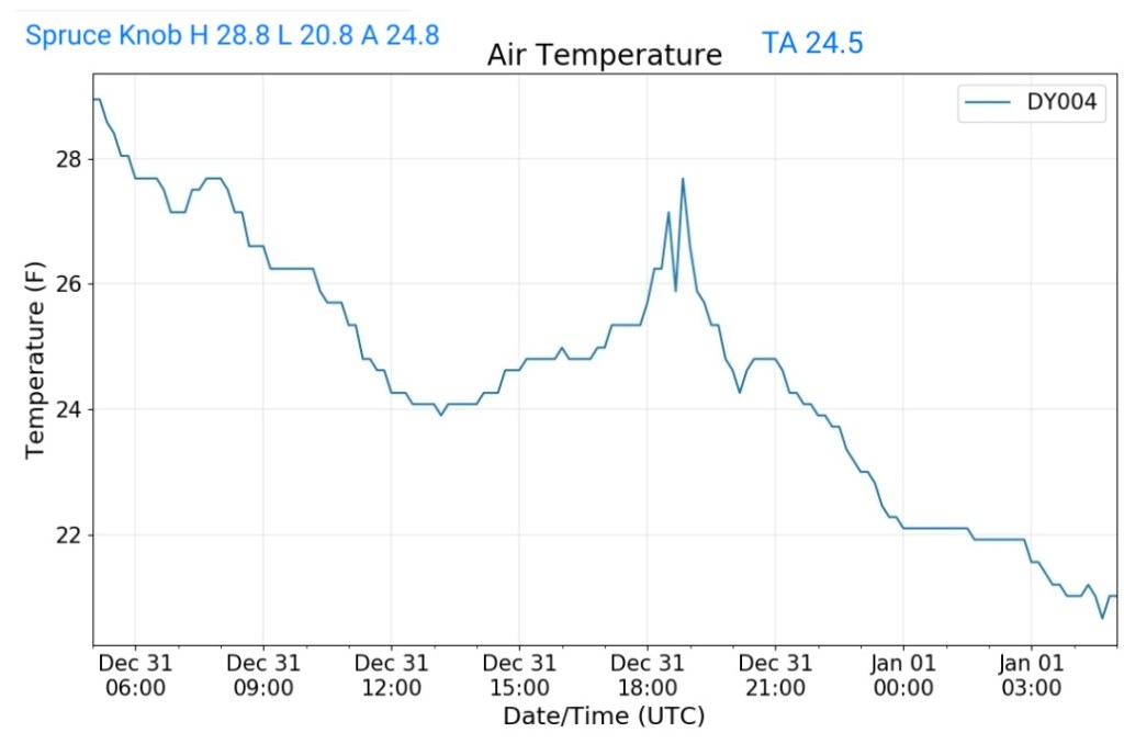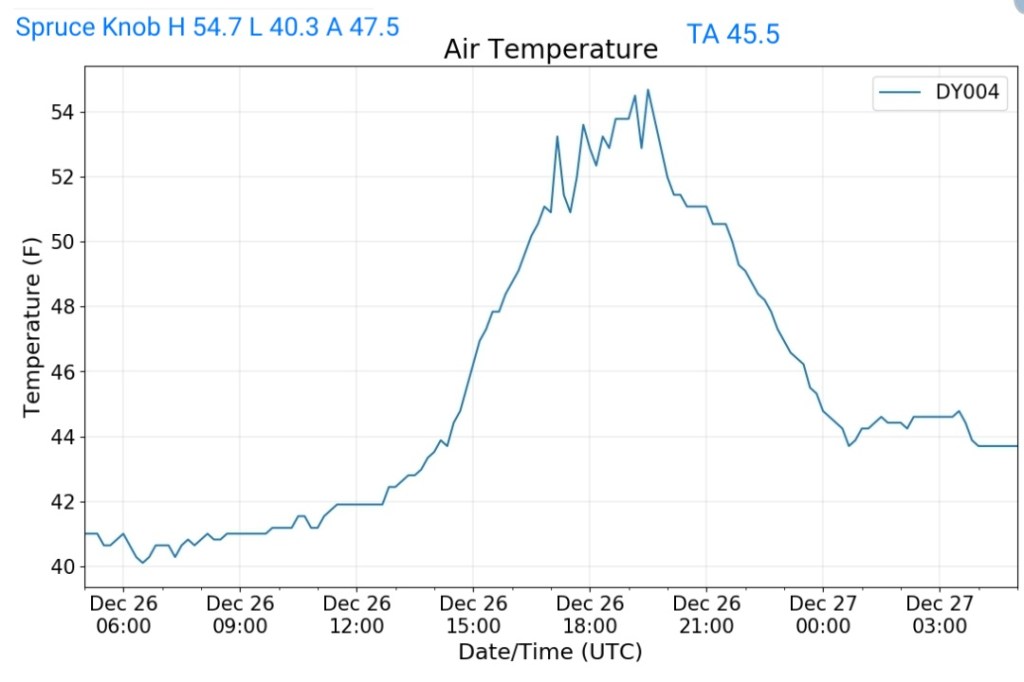 In some of the fascinating microclimates, a decent snow cover remains today. Example here near Bittinger, in Garrett County, just today at 2550′. This is a product of a sheltered valley holding cold in much the same way as a supermarket cooler works. The low dew points, calm winds, short days, these type areas do well in holding cold. Case in point below: