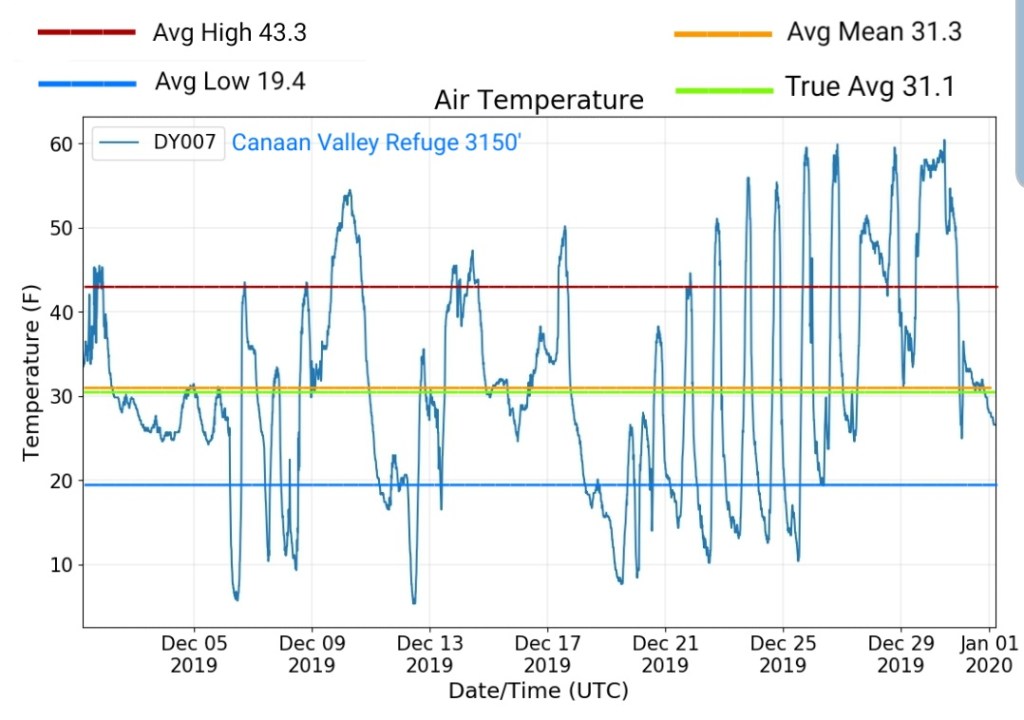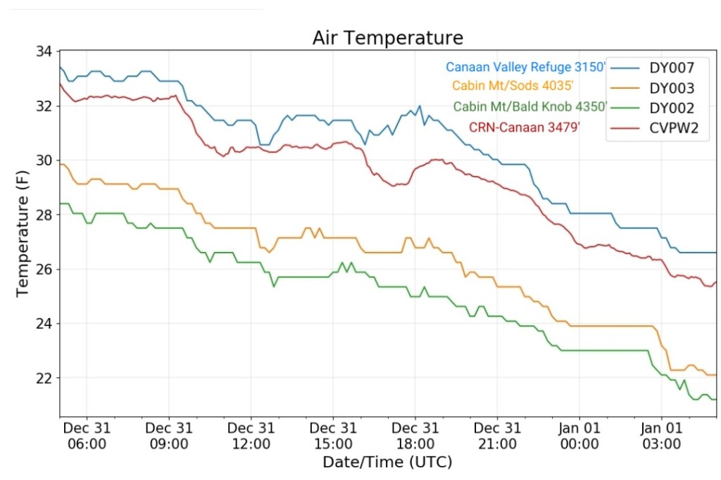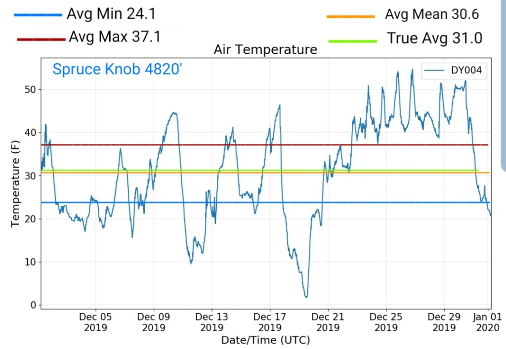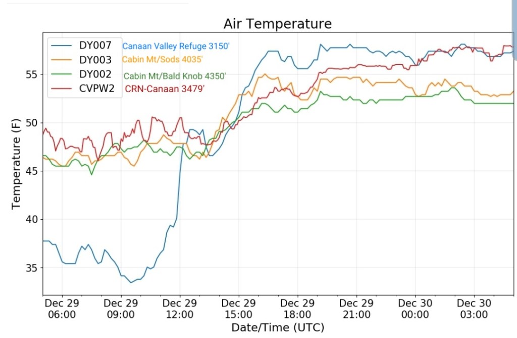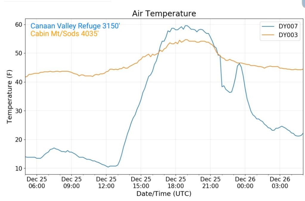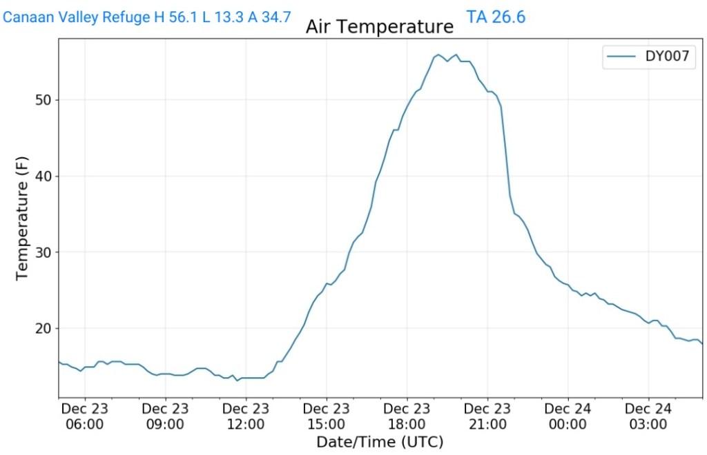In some of the fascinating microclimates, a decent snow cover remains today. Example here near Bittinger, in Garrett County, just today at 2550′. This is a product of a sheltered valley holding cold in much the same way as a supermarket cooler works. The low dew points, calm winds, short days, these type areas do well in holding cold. Case in point below:
