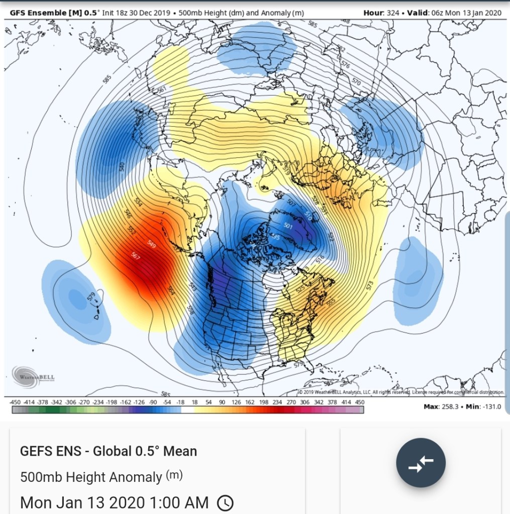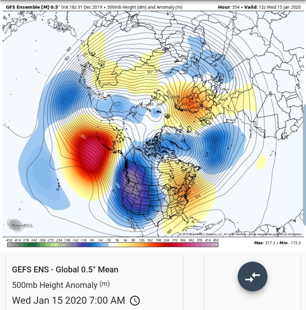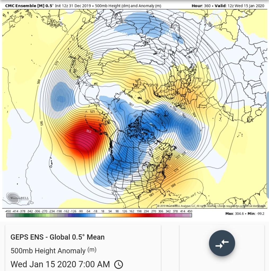 After that time, there is a lot of high pressure and very cold air in western Canada, unfortunately it does not look like it will push east, but instead sink into the west as the trough again pulls back west and allows the Southeast Ridge to flex it muscles and strengthen and we go back to square 1. Modeling supports that. Trough rebuilds west of Hawaii- Trough pulls back into the western U.S