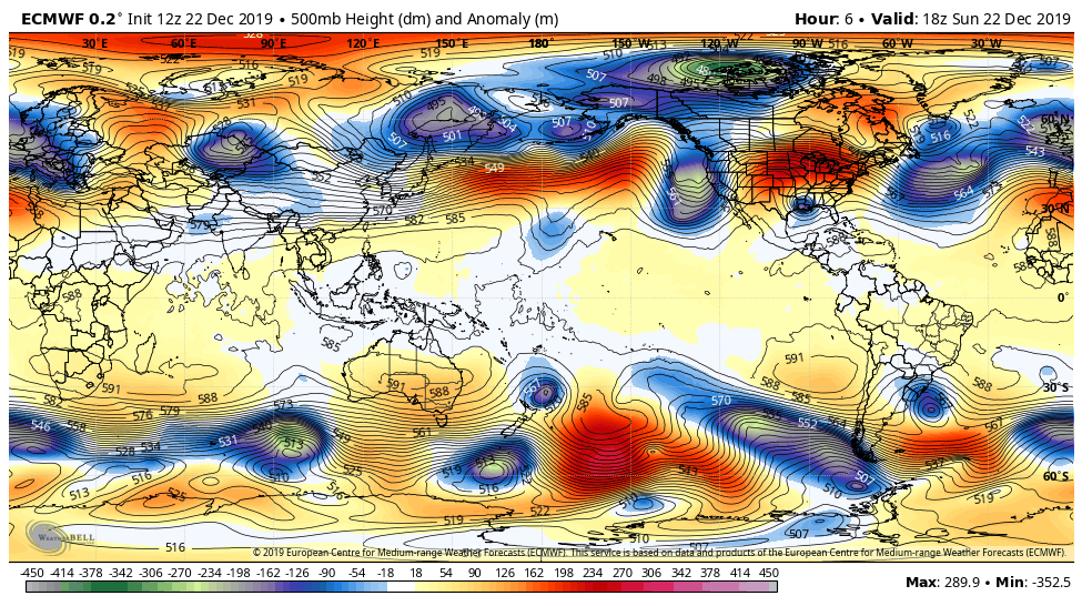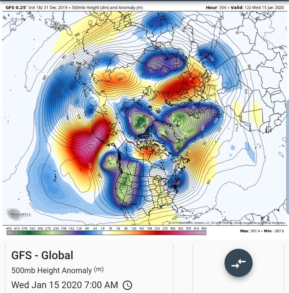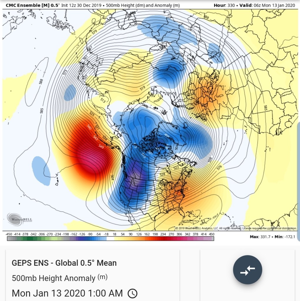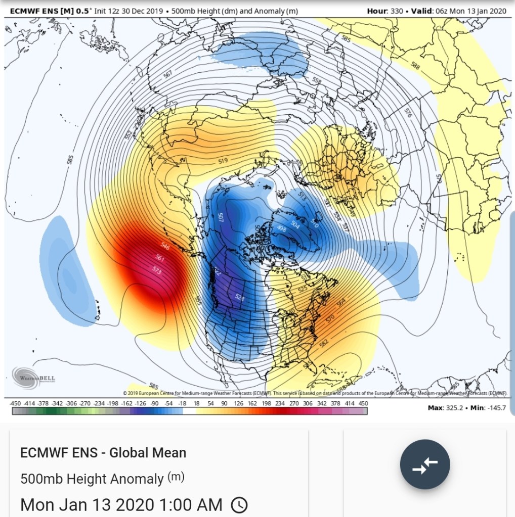 After that time, there is a lot of high pressure and very cold air in western Canada, unfortunately it does not look like it will push east, but instead sink into the west as the trough again pulls back west and allows the Southeast Ridge to flex it muscles and strengthen and we go back to square 1. Modeling supports that. Trough rebuilds west of Hawaii- Trough pulls back into the western U.S
