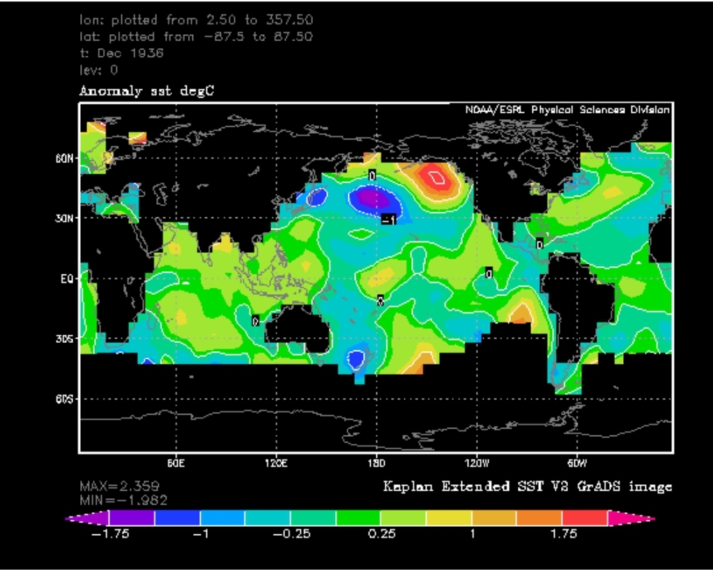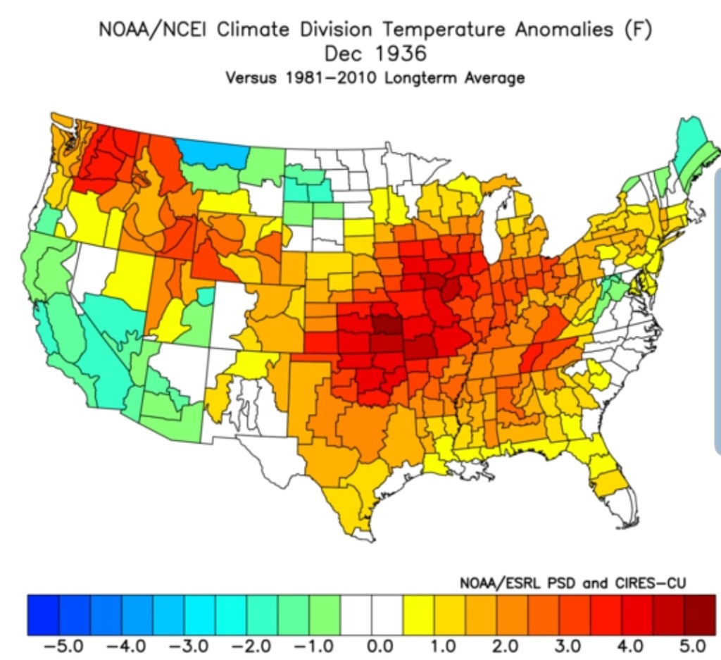 Of late, the low elevations have been colder than the high ground. While many think this is unheard of, it is not at all uncommon in this pattern. It’s in fact, typical when this pattern occurs. Just to pull out one year as an example that had a very similar setup, December 1936. The SST(sea surface temperature) anomalies had a pattern very like this current December. Let’s look at that