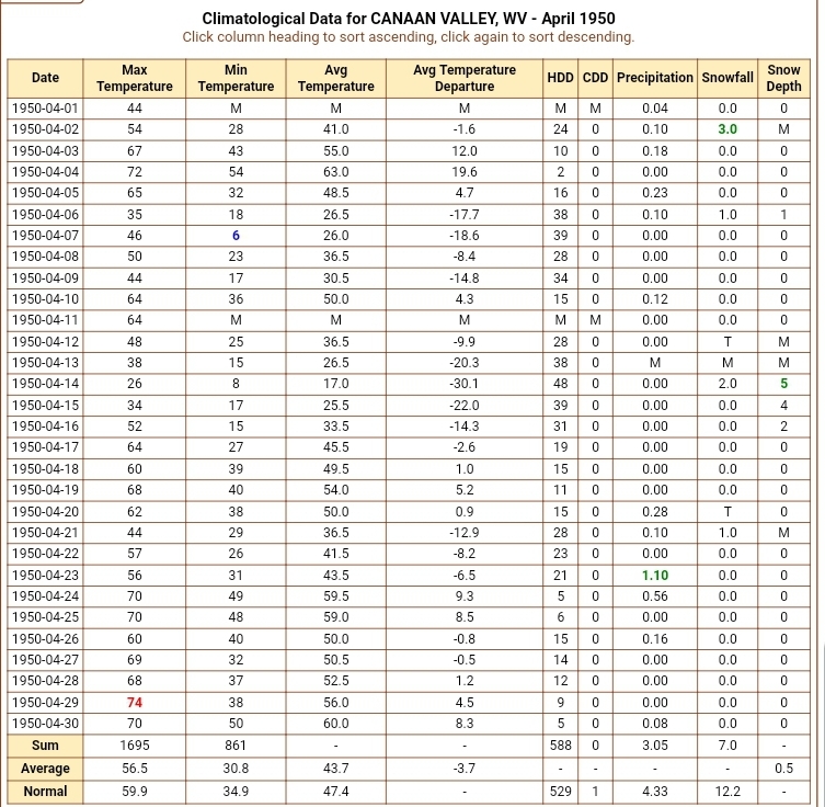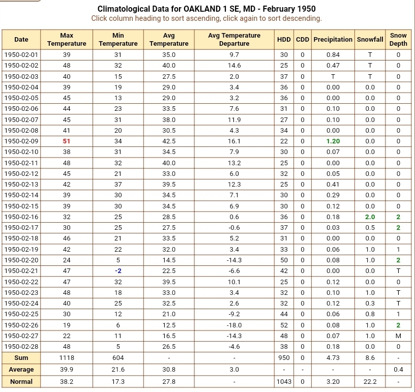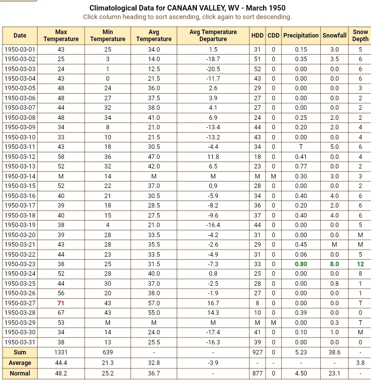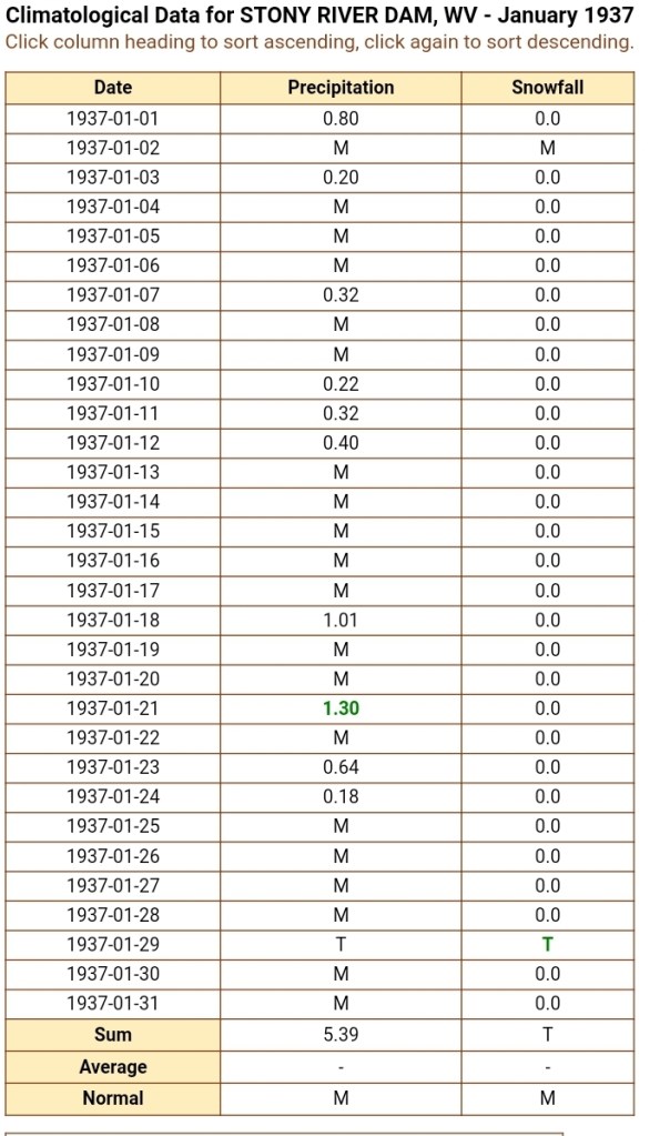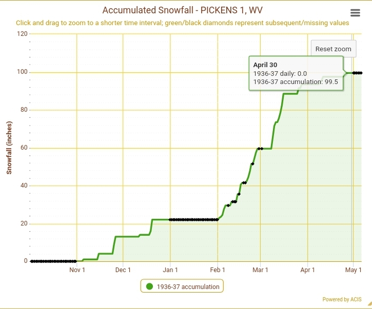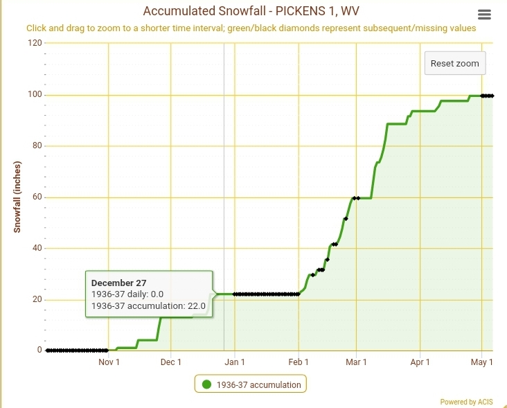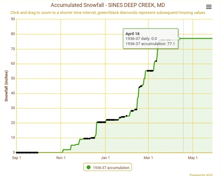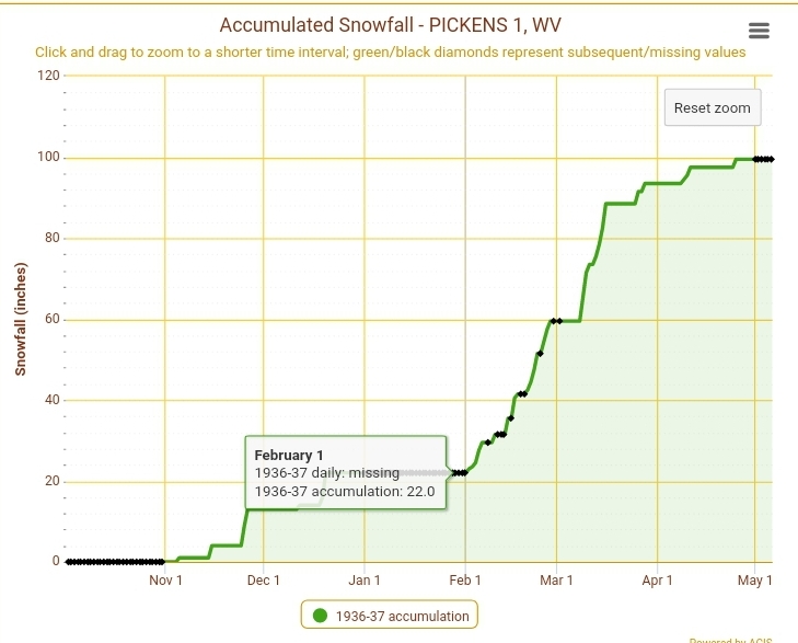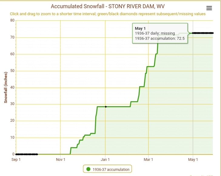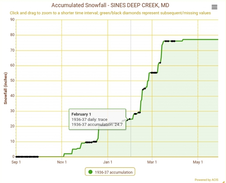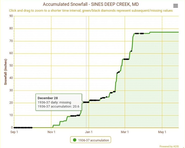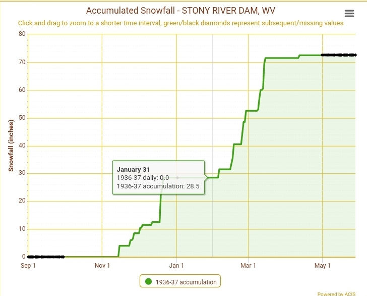Canaan did not have an official coop in 1937, but reports are, no measurable snow occured during that month. A station did occur at Stony River Dam, and it does have missing data, only a trace there was recorded. This is the least snowiest winter month in our areas recorded history