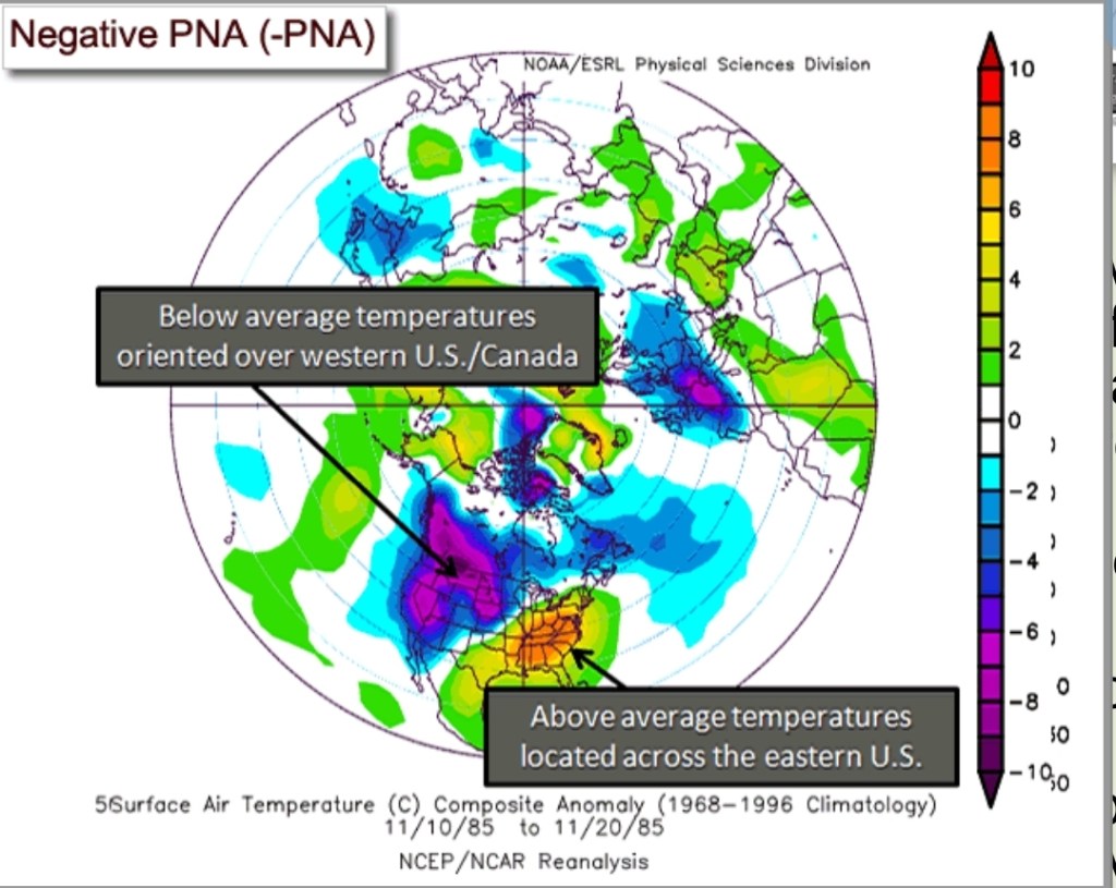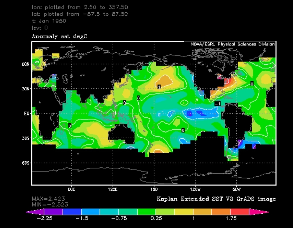 Present day, the northeast Pacific warm pool is further east, but with a tongue of cooler water aimed towards California. Warmth in the Gulf up the eastern seaboard.