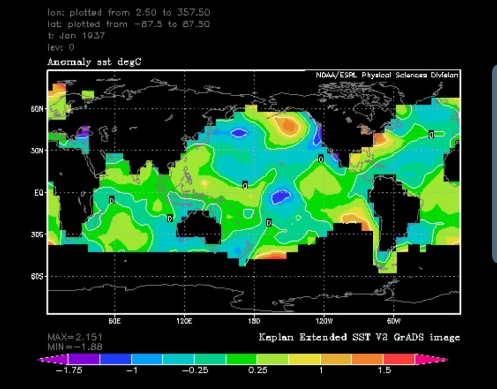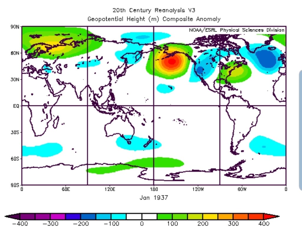 1937 Reanalysis 500mb Height anomalies. Strong positives off Alaska, trough west of Hawaii, trough western U.S, eastern ridging…