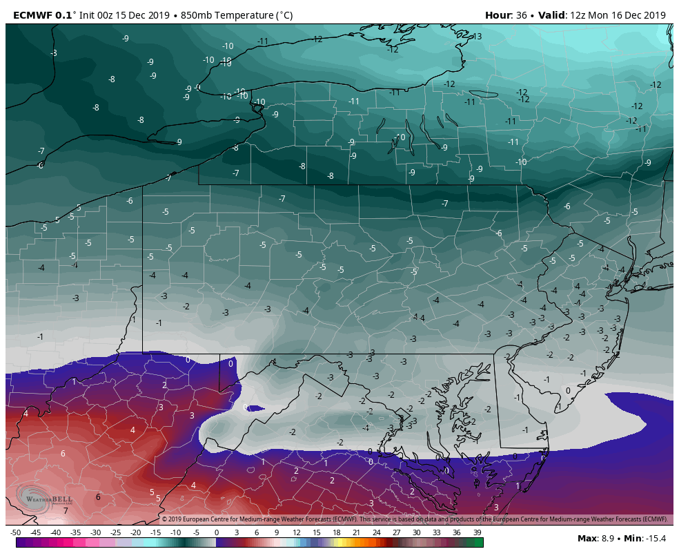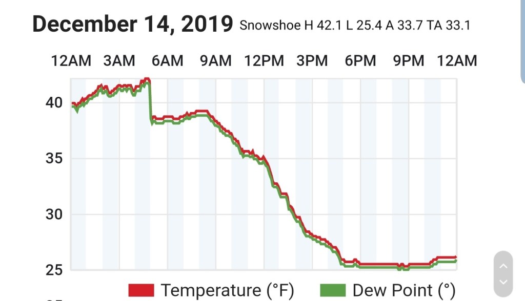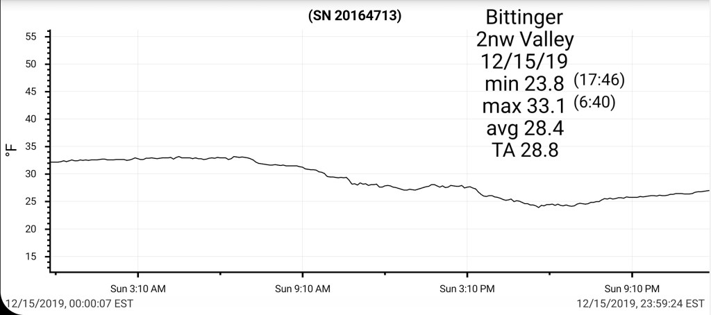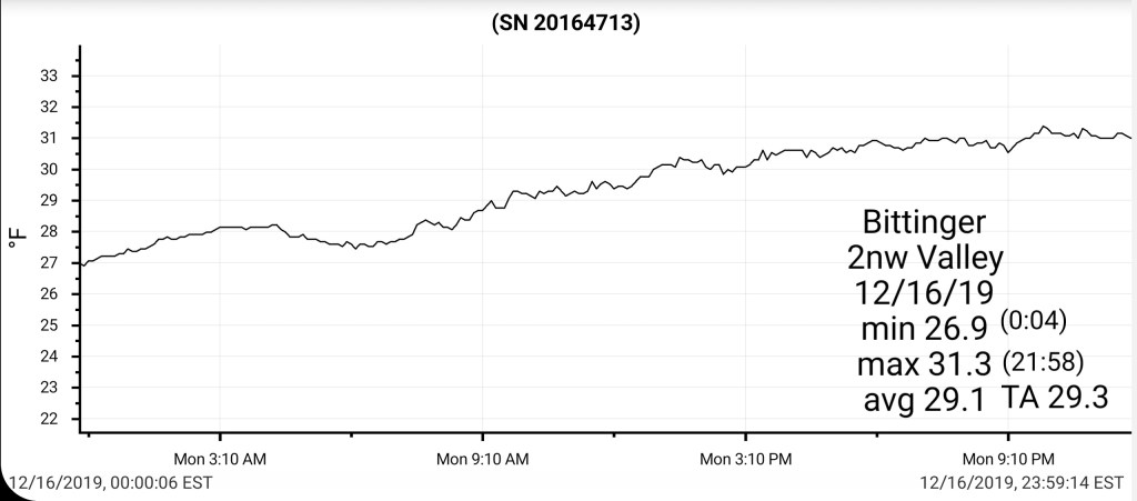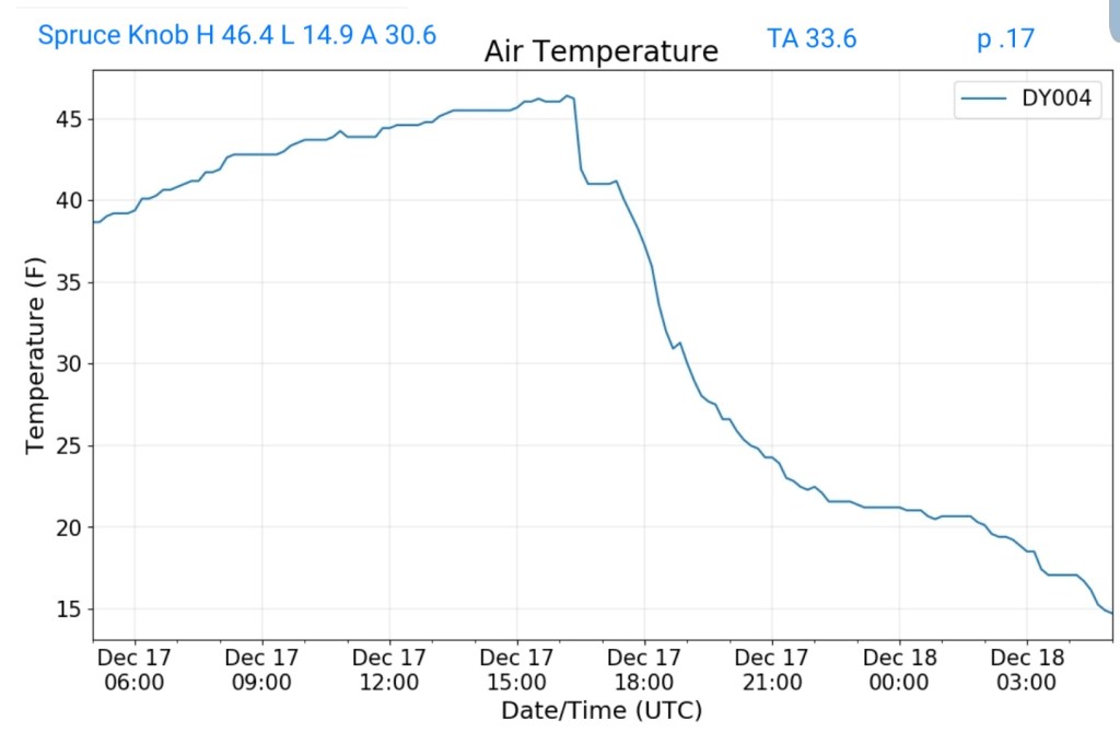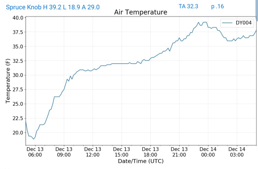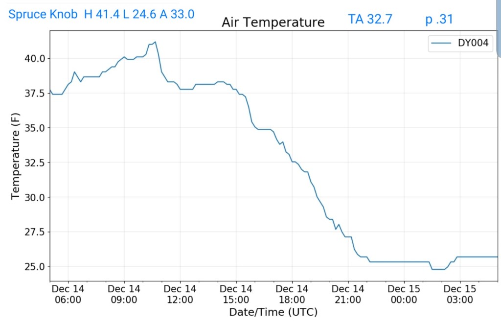 Saturday night- as of now, a steady period of snow looks likely, with periods of varied intensity into Sunday with a tapering down through the day. Temps on Sunday holding 20s, Wv high ground, upper 20s lower 30s to 2500′ lower to mid 30s below 2500. Forecast mentioning rain mixing in during the day on Sunday are very very unlikely. 850temps(near 5000′, roughly near the highest Wv areas) are modeled -5c to -8c. When its precipitating across the high ground, temps at 5000′ of 17f to 23f, you are not changing to liquid. There is no diurnal and even less so on December 15th.