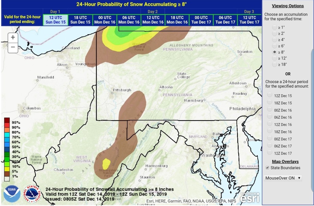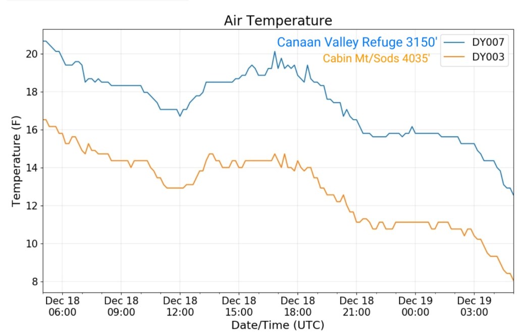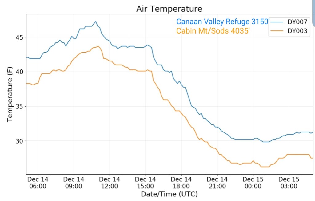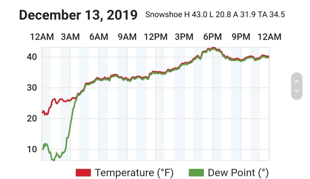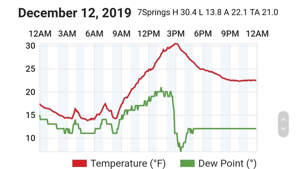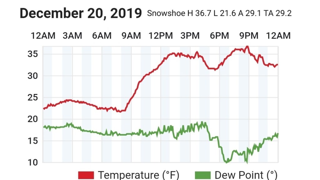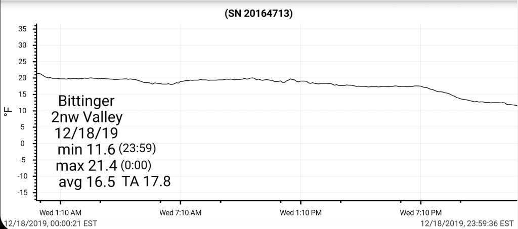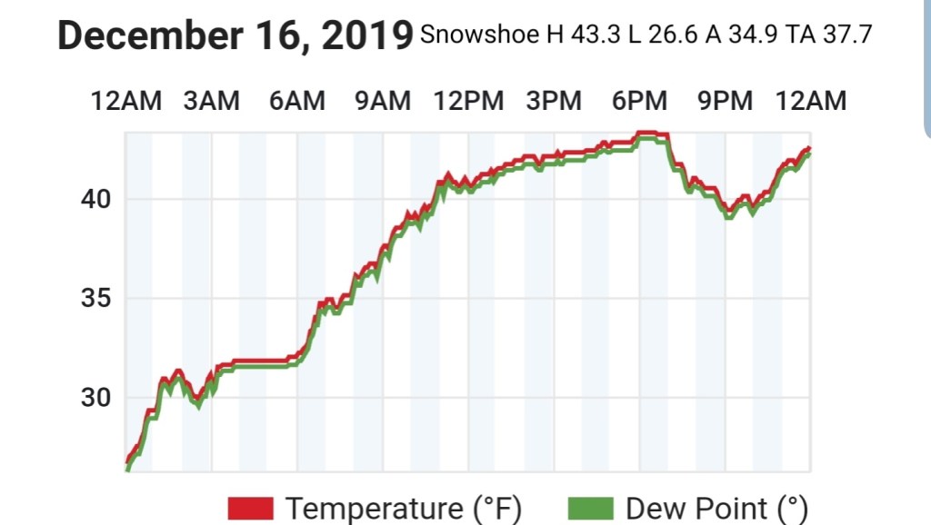Saturday night- as of now, a steady period of snow looks likely, with periods of varied intensity into Sunday with a tapering down through the day. Temps on Sunday holding 20s, Wv high ground, upper 20s lower 30s to 2500′ lower to mid 30s below 2500. Forecast mentioning rain mixing in during the day on Sunday are very very unlikely. 850temps(near 5000′, roughly near the highest Wv areas) are modeled -5c to -8c. When its precipitating across the high ground, temps at 5000′ of 17f to 23f, you are not changing to liquid. There is no diurnal and even less so on December 15th.