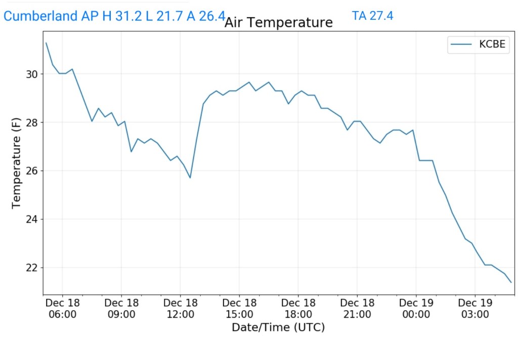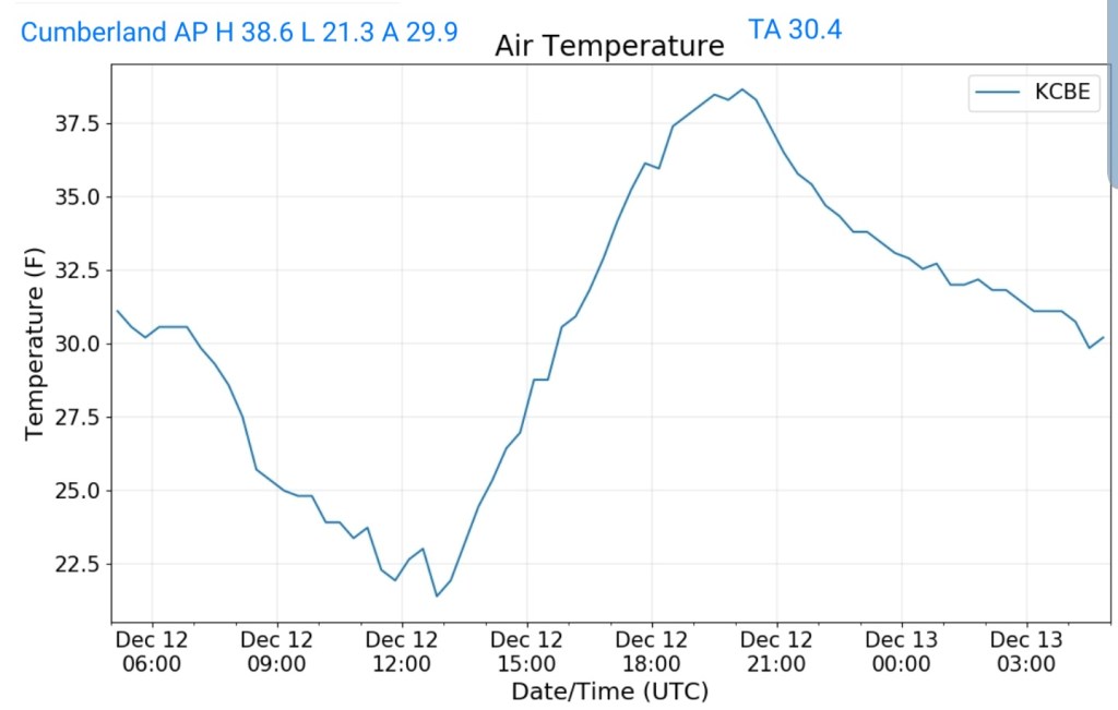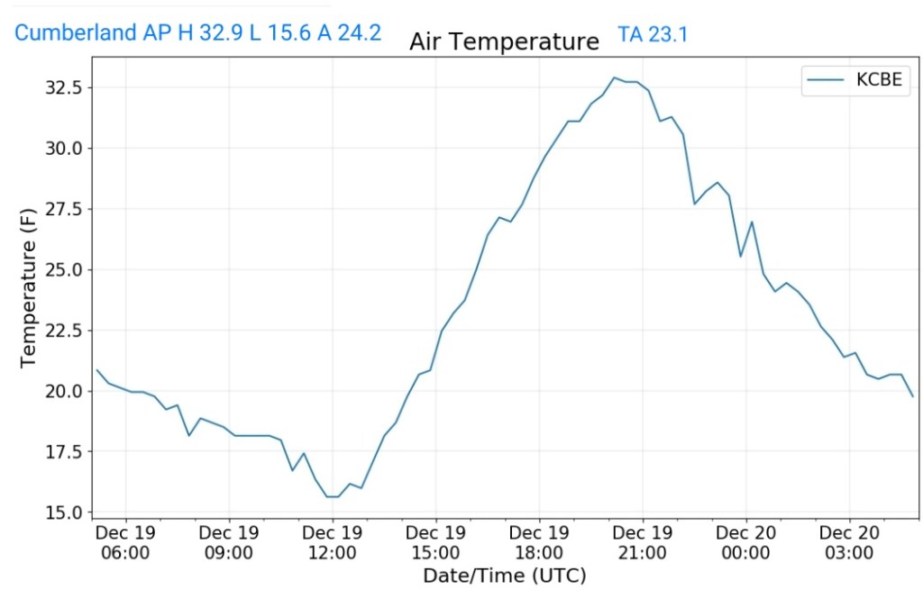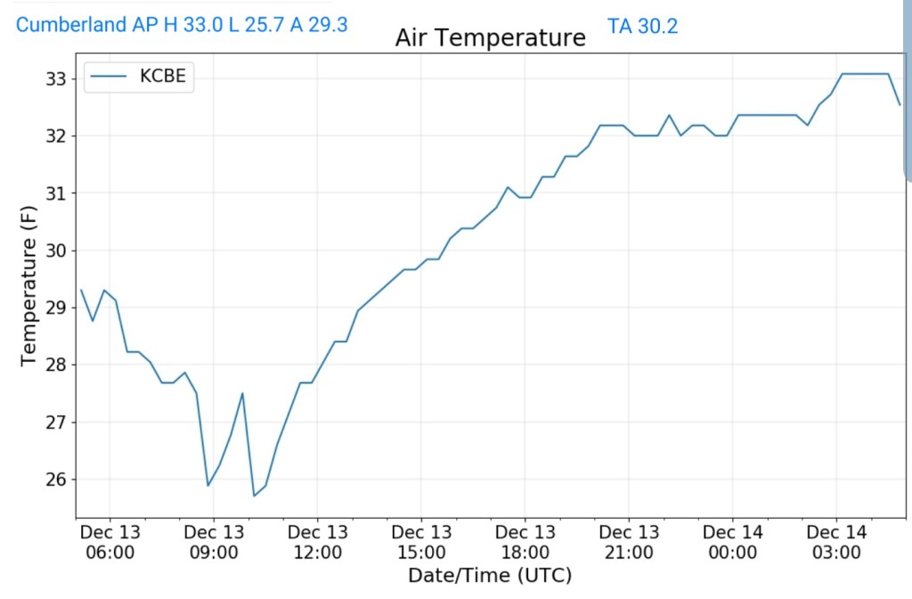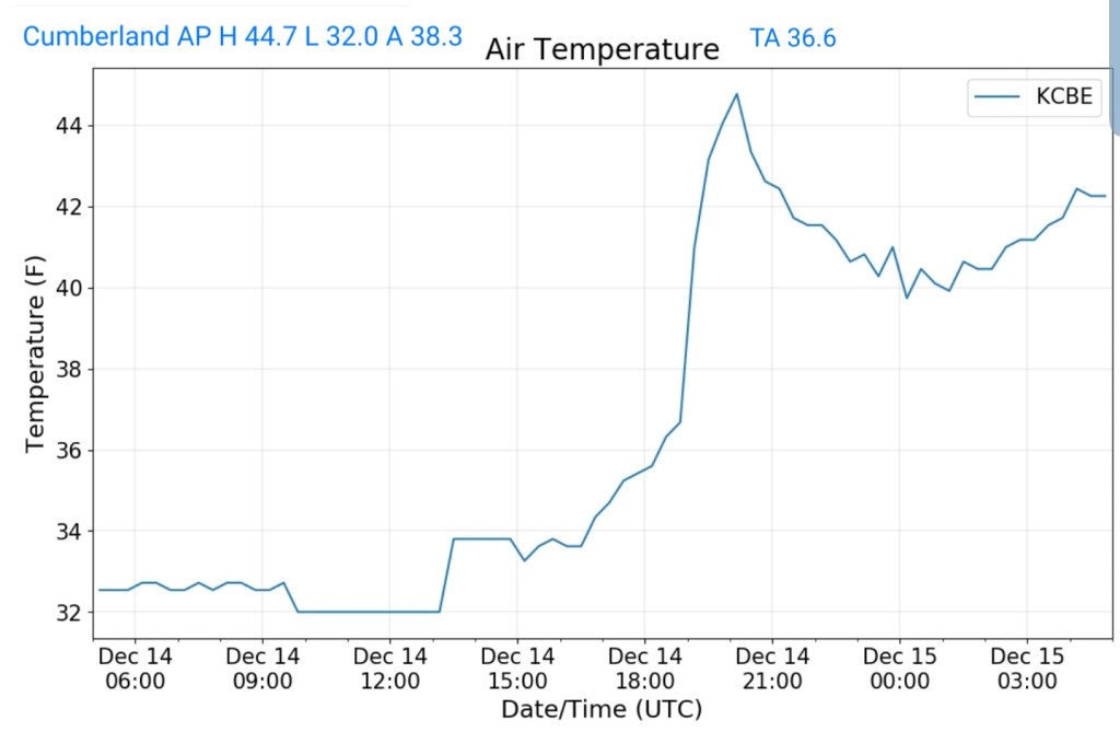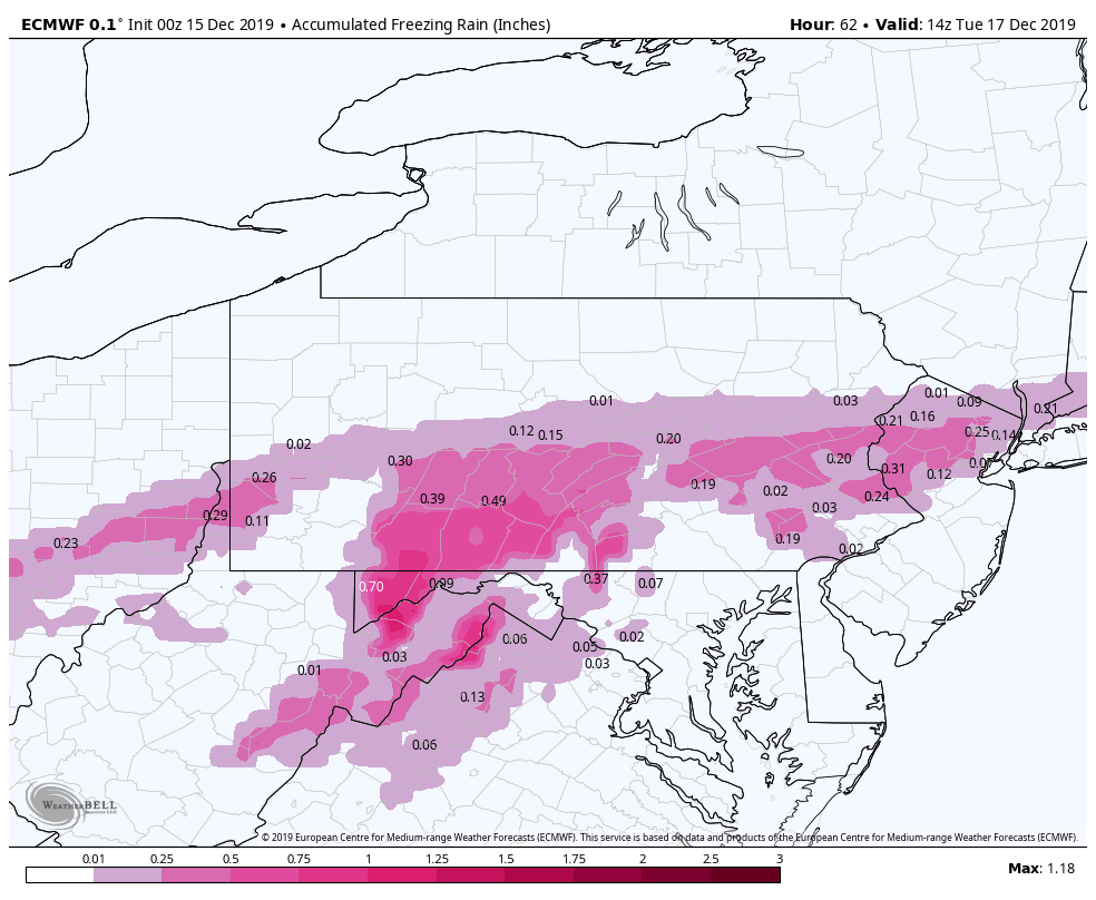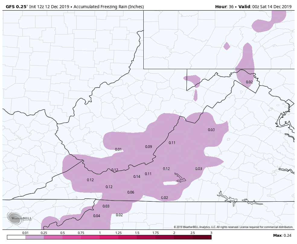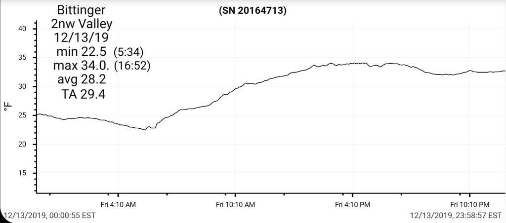 Light precip pushes in to the southern areas in the region in the morning. Main concern is a light freezing rain glazing things over. This pushes north through the day. Overall precip is mostly light. Tomorrow night, any areas in the classic high elevation ice zones(those same spots that’s saw ice on Dec 1) that are typical holdouts for freezing rain, those areas will rise +32 early in the night. The remaining areas to watch for freezing rain turns to the deeper valleys, the Savage River valleys and valleys mainly east of the Allegheny Front. Those pockets may hold below freezing into Saturday morning.