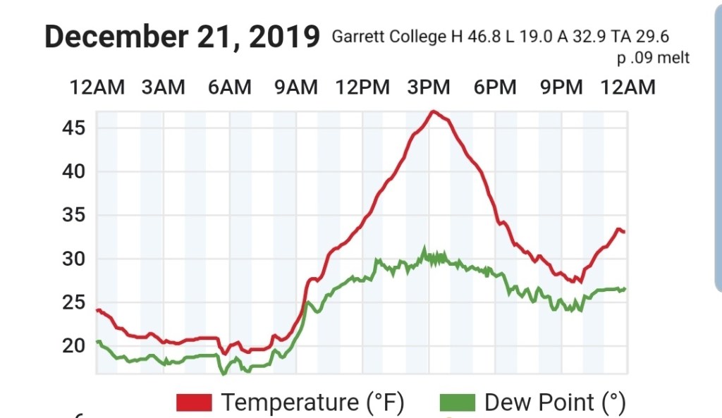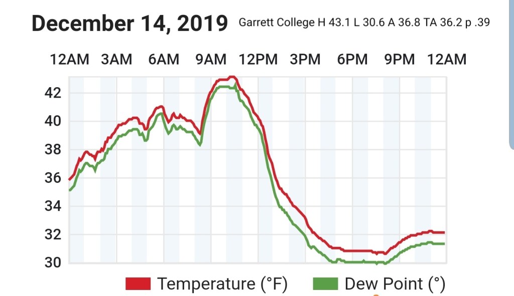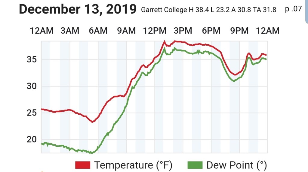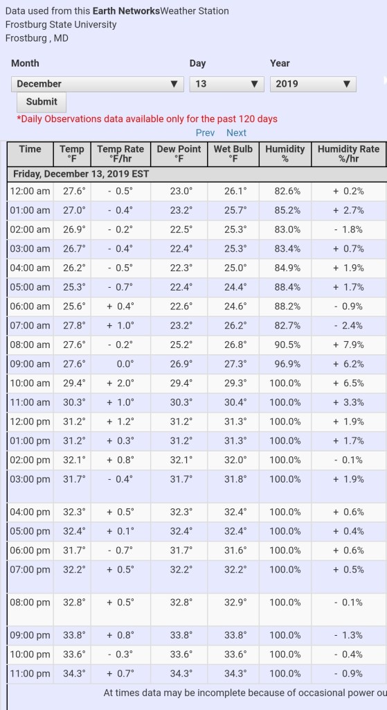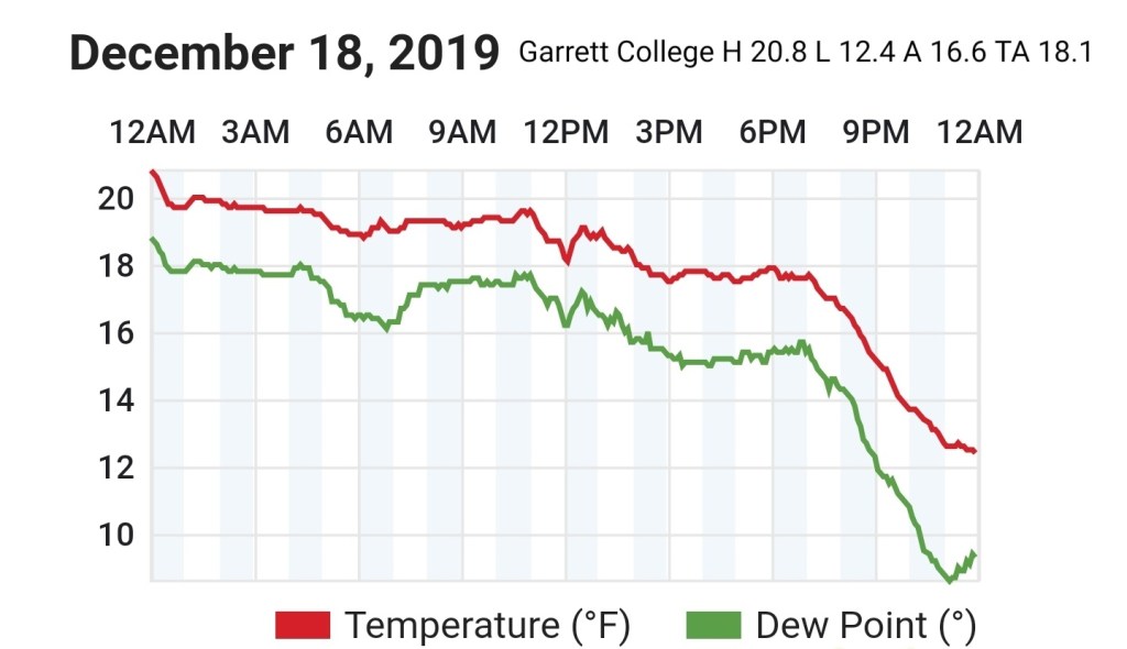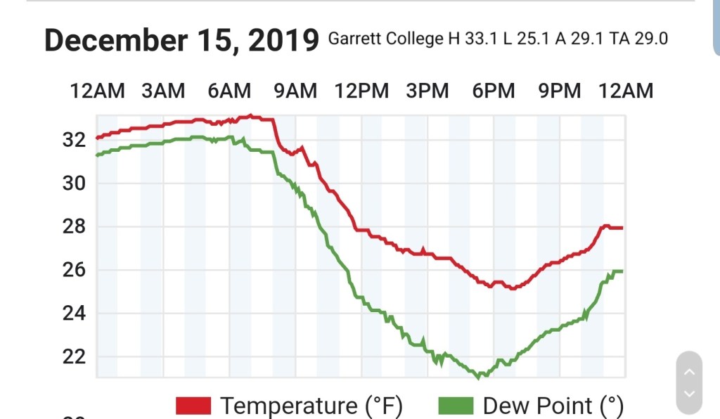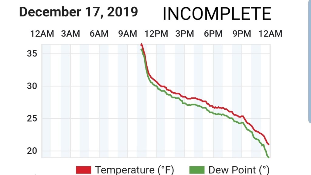 Due to the power outage, data is missing for the first 10 hours today. That leaves today’s data incomplete at GCC. The min temp does stand as the min as that occured after power was restored.