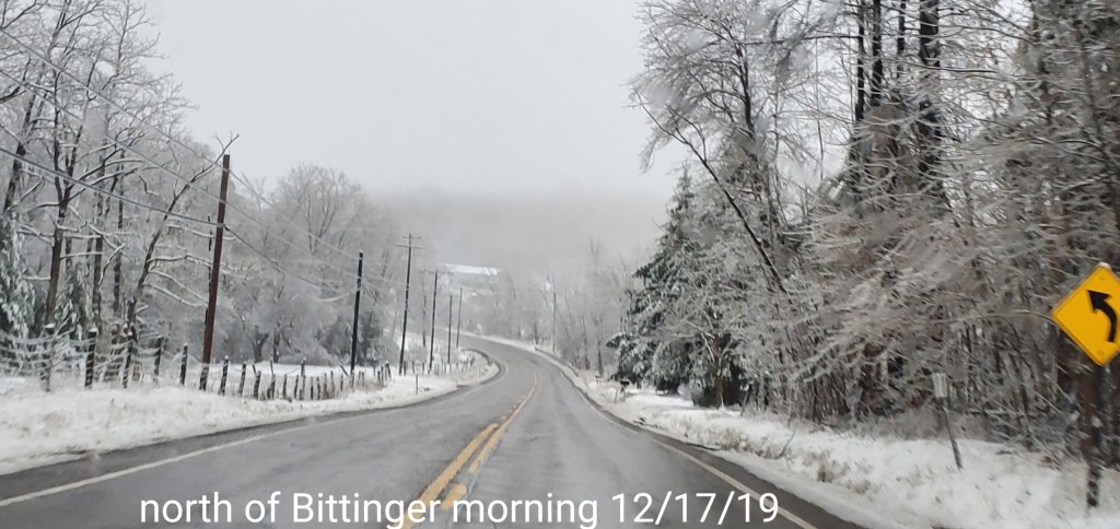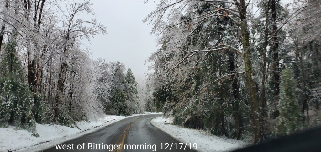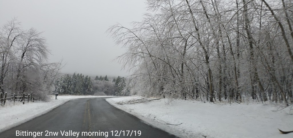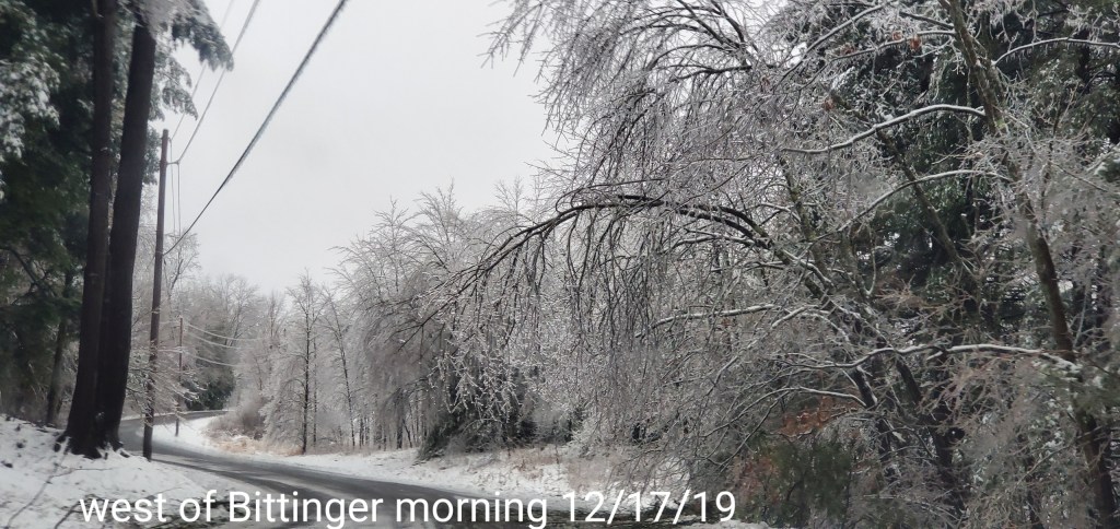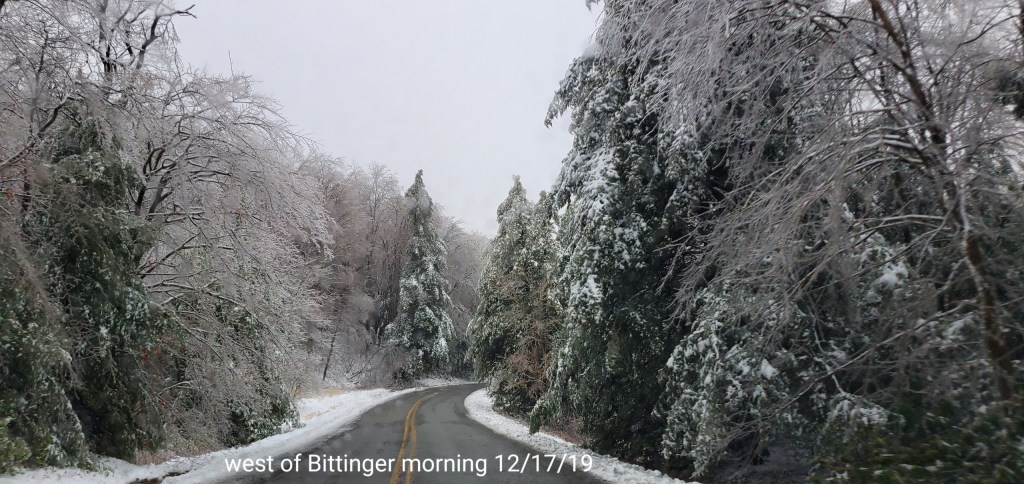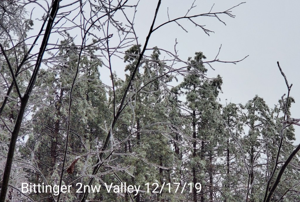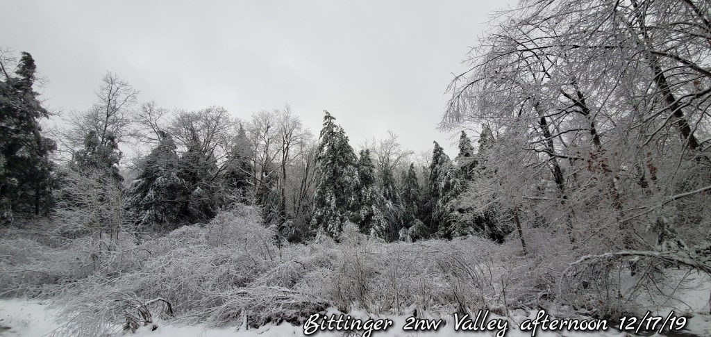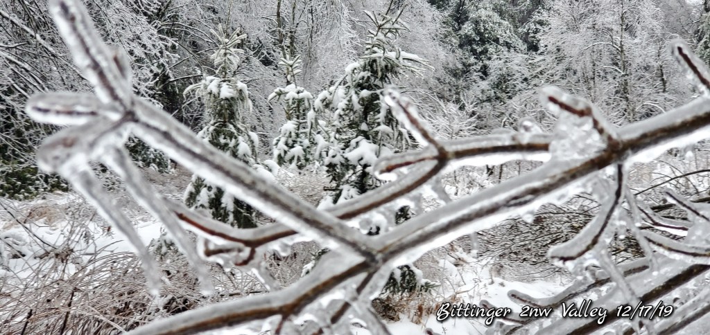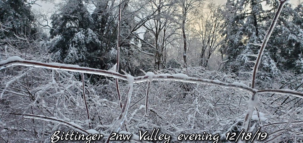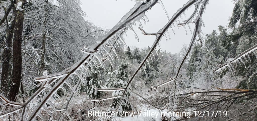 Ice ice baby. Major ice event across the eastern half of Garrett, and in some instances stretched into western Garrett. Overnight as far west as Preston County, before temps moderated there. Trees, limbs began falling 9-10pm and with that, power outages began. Some roadways blocked. All the while, very mild air and a rain out just to the south in Wv. Temps fell to the upper 20s at Mt.Storm early overnight last night, but sat at 50 this morning while below freezing remained in areas in Garrett. A brief surge of milder air came across mid morning, however not enough to scour out the cold in the high valleys in Garrett. The highest elevated areas in the ice zone lost more ice than the lower elevated areas with the brief mild surge that was followed by wind and colder air by midday. Leftover rain today changed to snow early afternoon as the colder air returned. Ice never came off the trees. Some high ground saw a little more melt than valleys in central Garrett with the slightest intrusion of mild air mid morning.