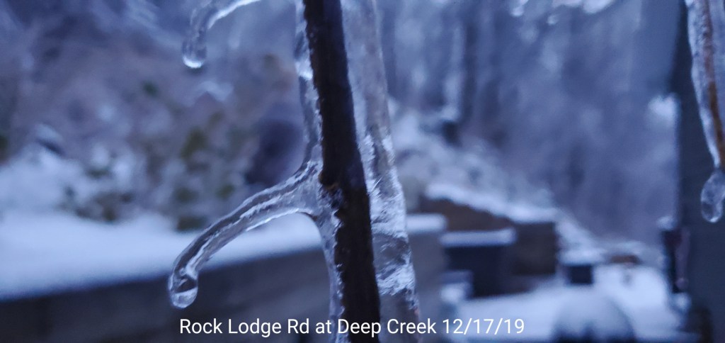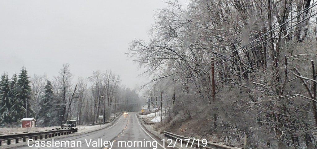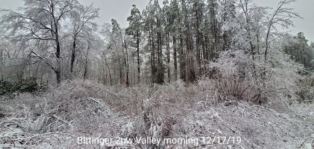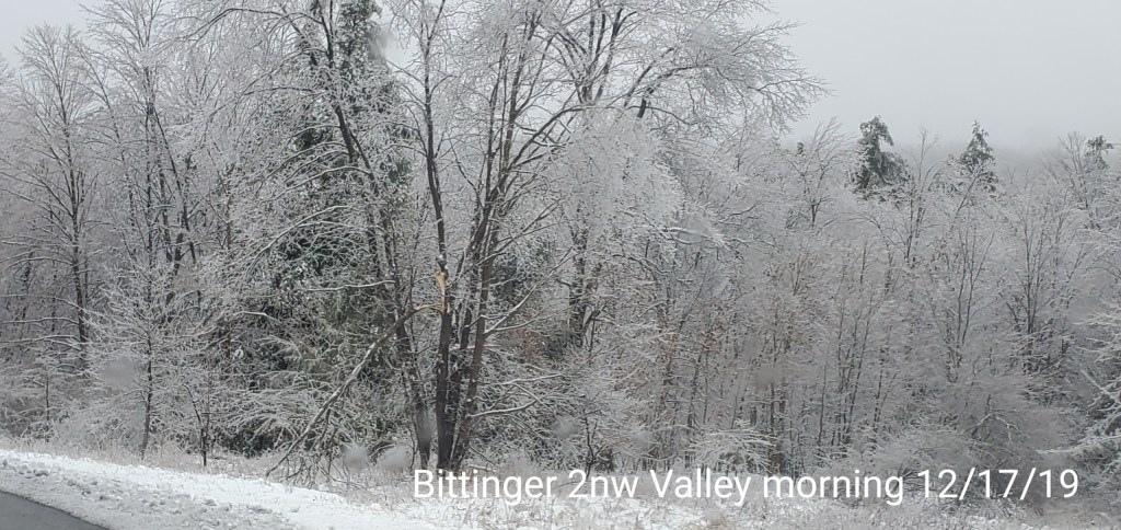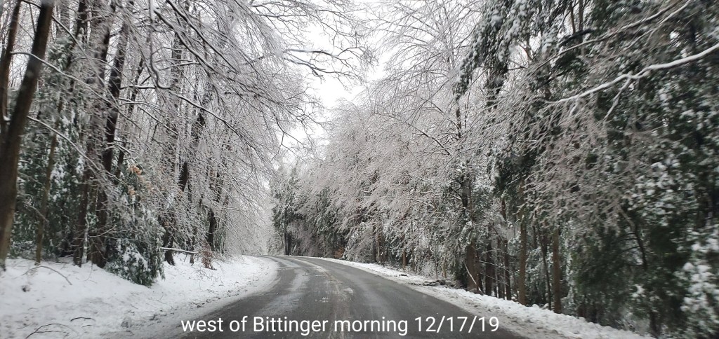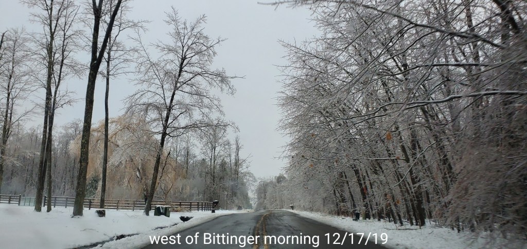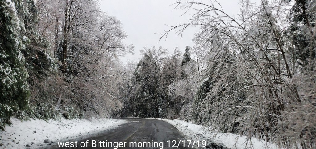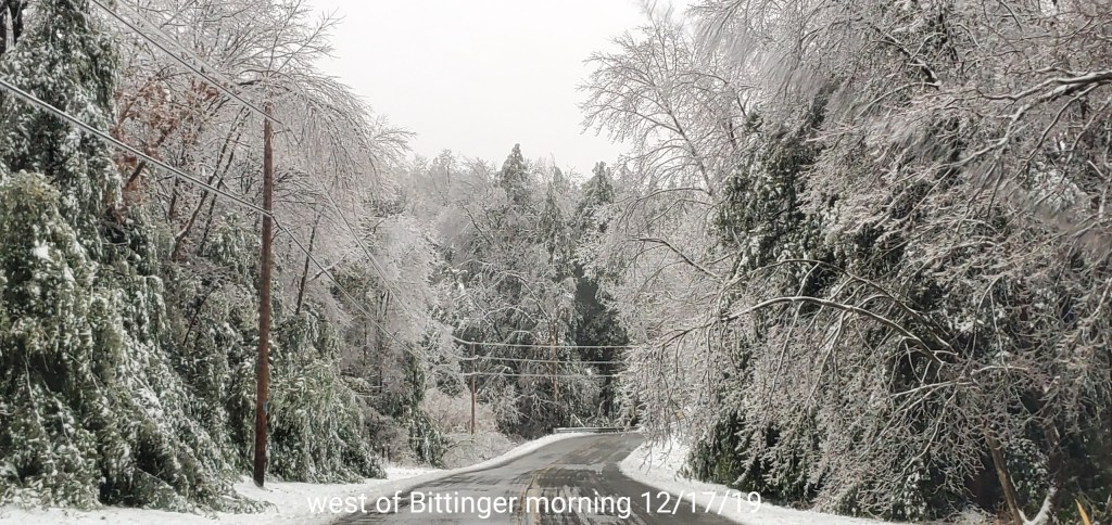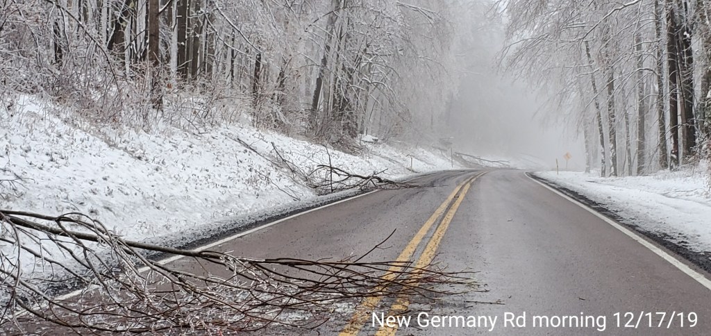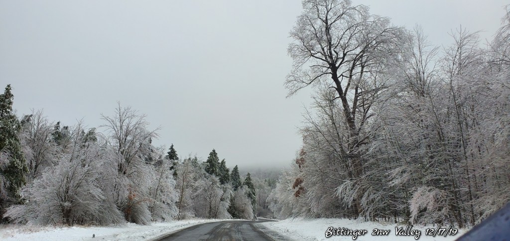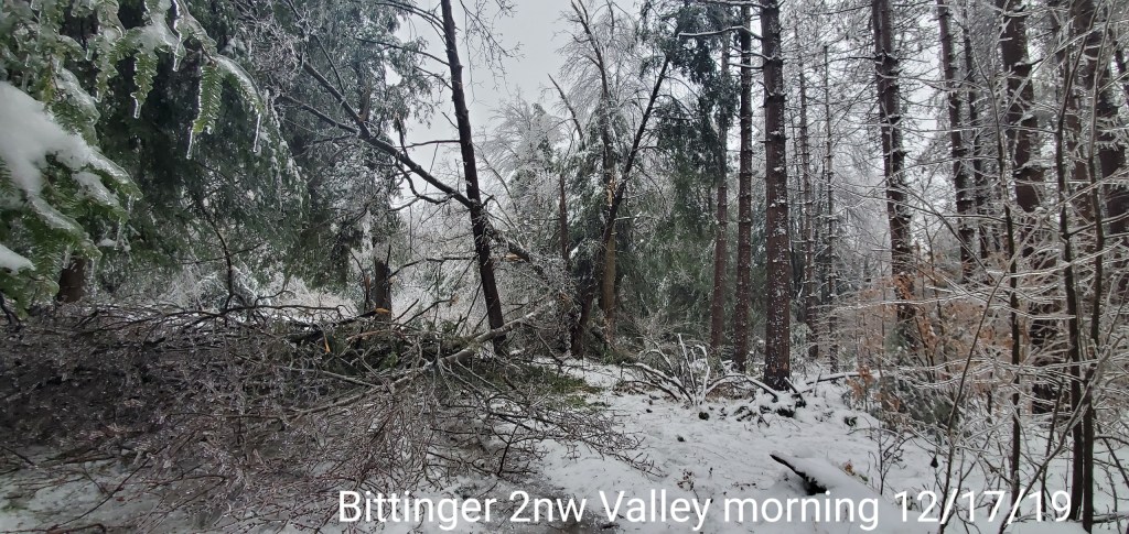 Ice ice baby. Major ice event across the eastern half of Garrett, and in some instances stretched into western Garrett. Overnight as far west as Preston County, before temps moderated there. Trees, limbs began falling 9-10pm and with that, power outages began. Some roadways blocked. All the while, very mild air and a rain out just to the south in Wv. Temps fell to the upper 20s at Mt.Storm early overnight last night, but sat at 50 this morning while below freezing remained in areas in Garrett. A brief surge of milder air came across mid morning, however not enough to scour out the cold in the high valleys in Garrett. The highest elevated areas in the ice zone lost more ice than the lower elevated areas with the brief mild surge that was followed by wind and colder air by midday. Leftover rain today changed to snow early afternoon as the colder air returned. Ice never came off the trees. Some high ground saw a little more melt than valleys in central Garrett with the slightest intrusion of mild air mid morning.