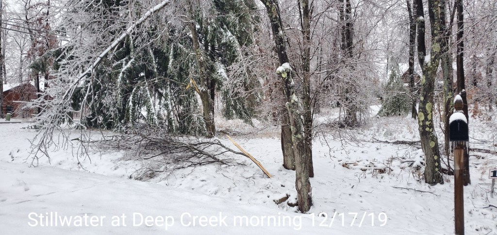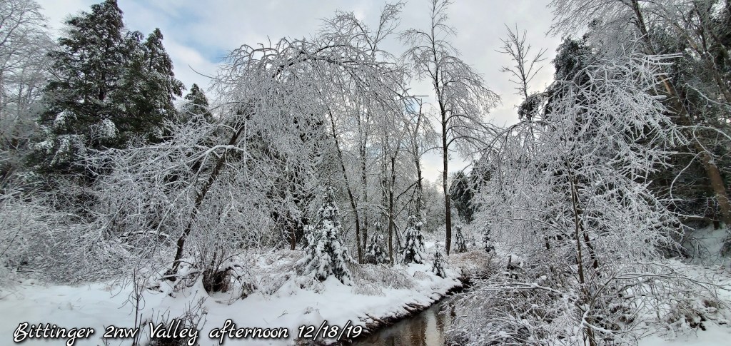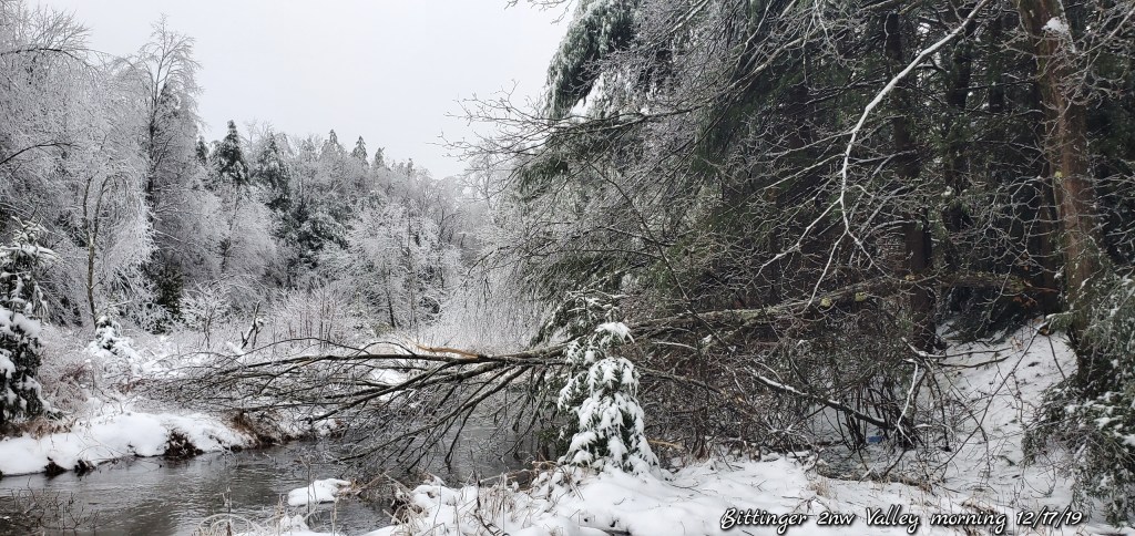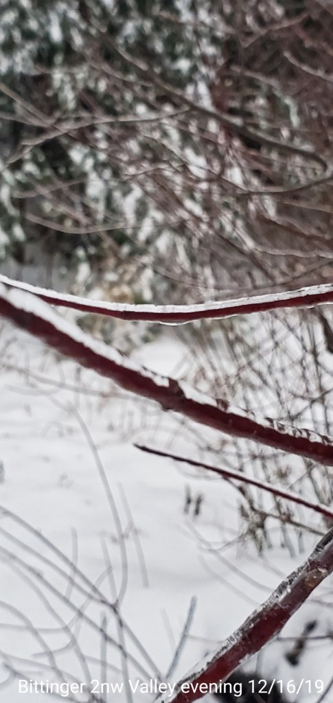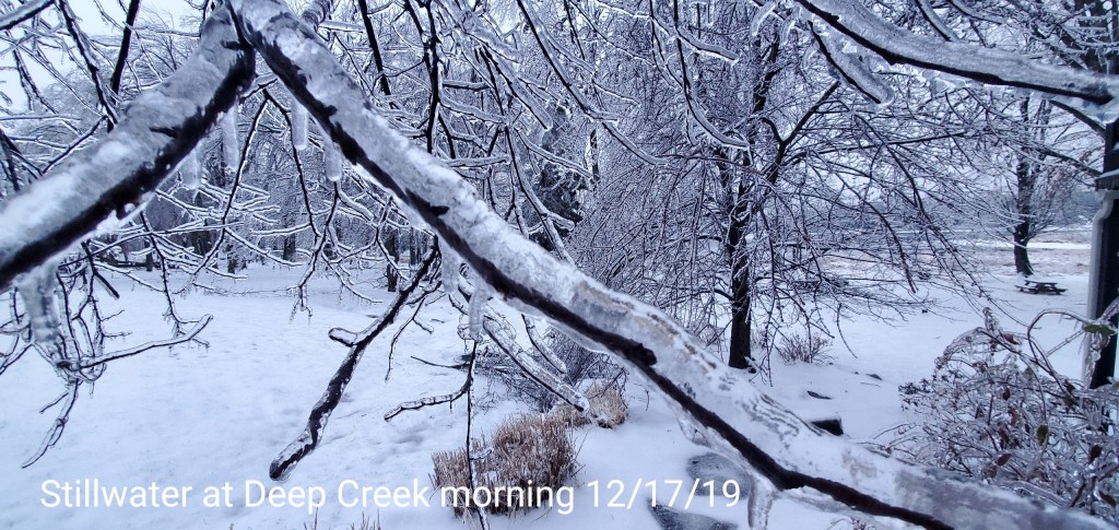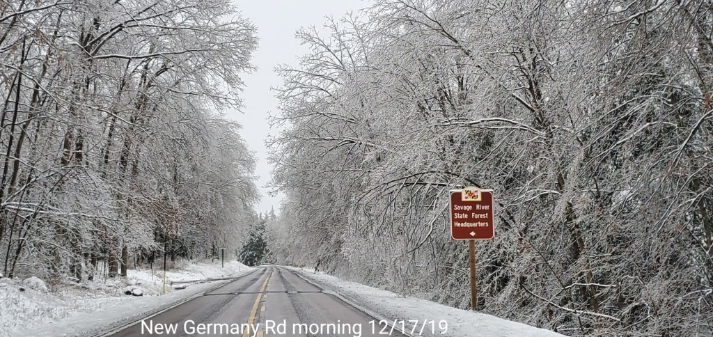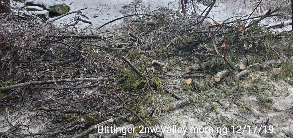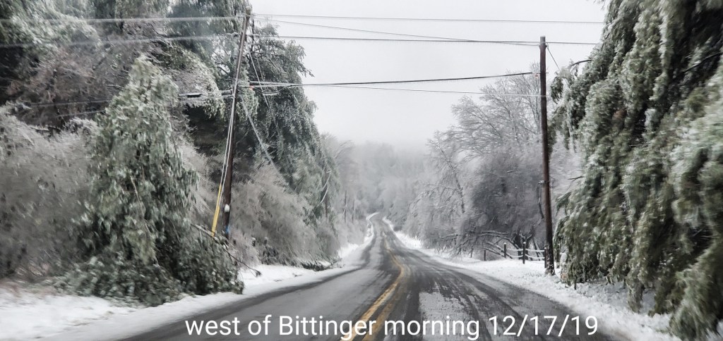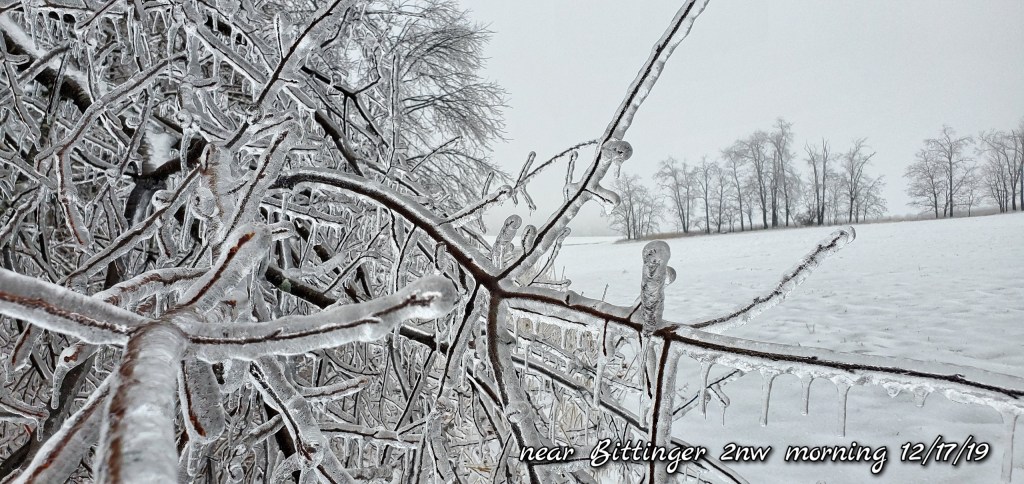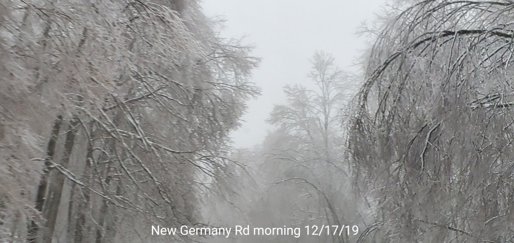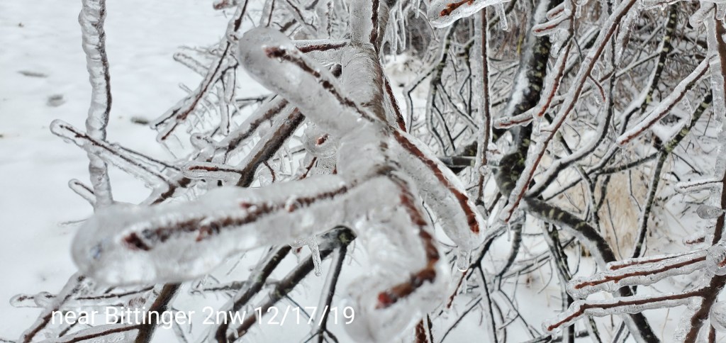 Ice ice baby. Major ice event across the eastern half of Garrett, and in some instances stretched into western Garrett. Overnight as far west as Preston County, before temps moderated there. Trees, limbs began falling 9-10pm and with that, power outages began. Some roadways blocked. All the while, very mild air and a rain out just to the south in Wv. Temps fell to the upper 20s at Mt.Storm early overnight last night, but sat at 50 this morning while below freezing remained in areas in Garrett. A brief surge of milder air came across mid morning, however not enough to scour out the cold in the high valleys in Garrett. The highest elevated areas in the ice zone lost more ice than the lower elevated areas with the brief mild surge that was followed by wind and colder air by midday. Leftover rain today changed to snow early afternoon as the colder air returned. Ice never came off the trees. Some high ground saw a little more melt than valleys in central Garrett with the slightest intrusion of mild air mid morning.