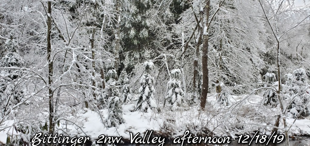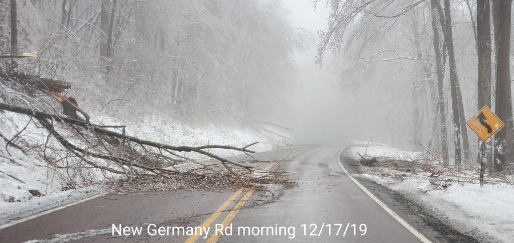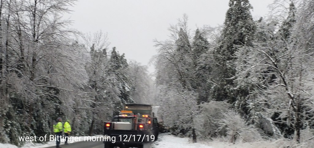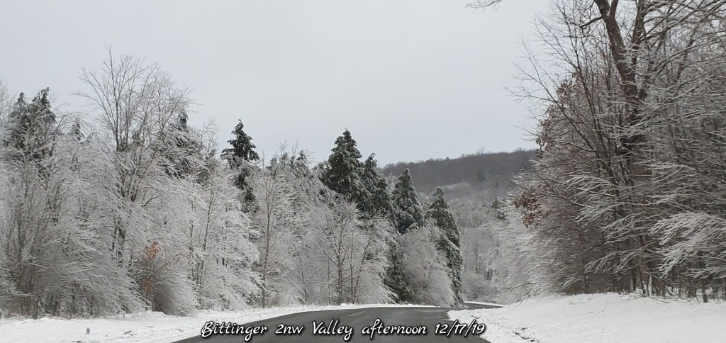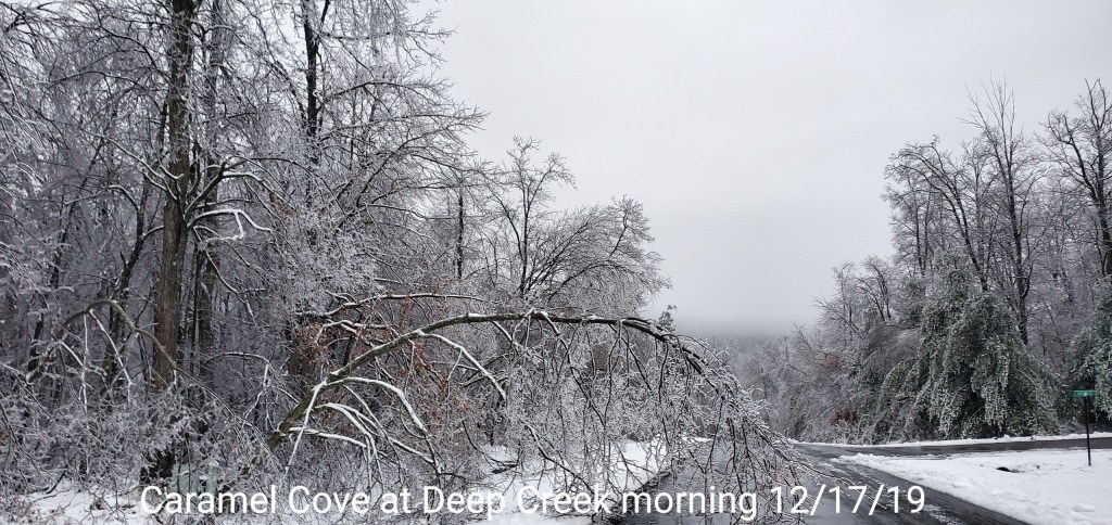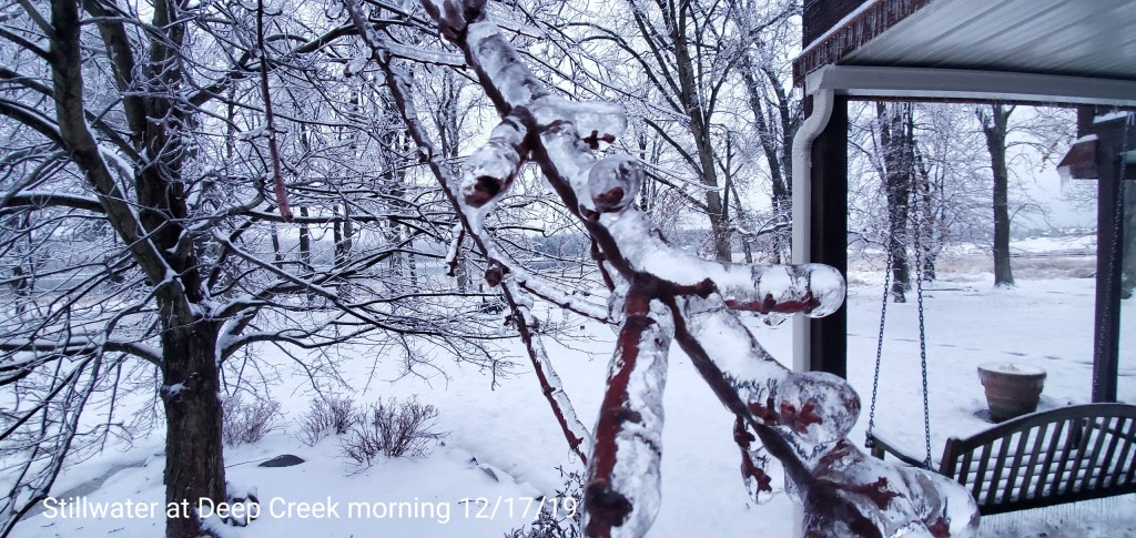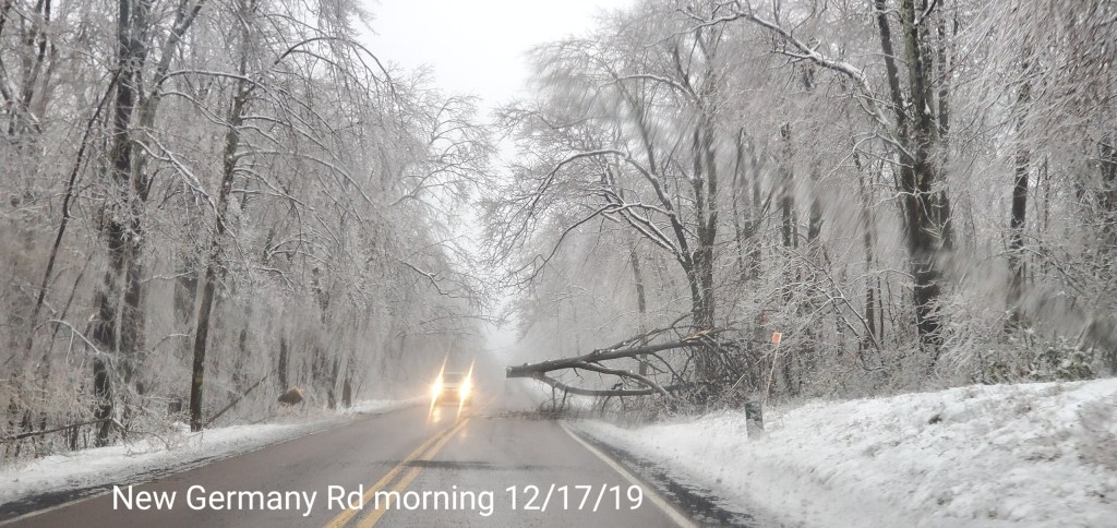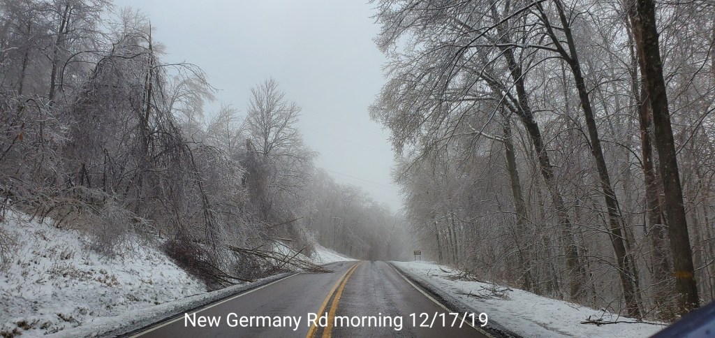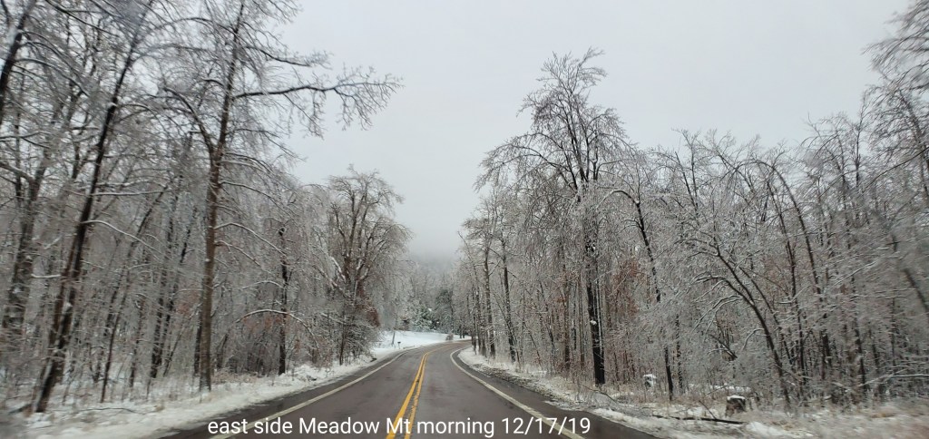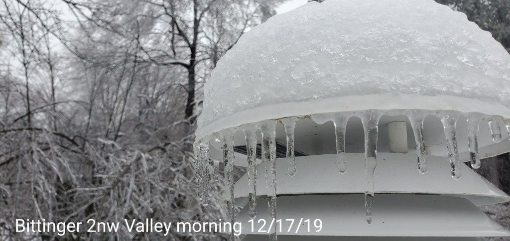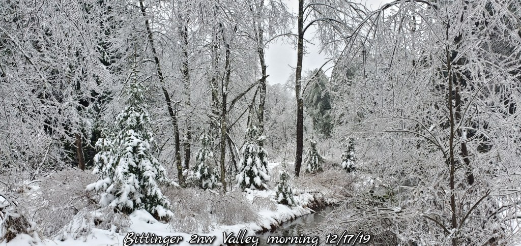 Ice ice baby. Major ice event across the eastern half of Garrett, and in some instances stretched into western Garrett. Overnight as far west as Preston County, before temps moderated there. Trees, limbs began falling 9-10pm and with that, power outages began. Some roadways blocked. All the while, very mild air and a rain out just to the south in Wv. Temps fell to the upper 20s at Mt.Storm early overnight last night, but sat at 50 this morning while below freezing remained in areas in Garrett. A brief surge of milder air came across mid morning, however not enough to scour out the cold in the high valleys in Garrett. The highest elevated areas in the ice zone lost more ice than the lower elevated areas with the brief mild surge that was followed by wind and colder air by midday. Leftover rain today changed to snow early afternoon as the colder air returned. Ice never came off the trees. Some high ground saw a little more melt than valleys in central Garrett with the slightest intrusion of mild air mid morning.