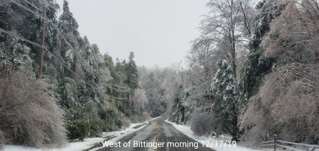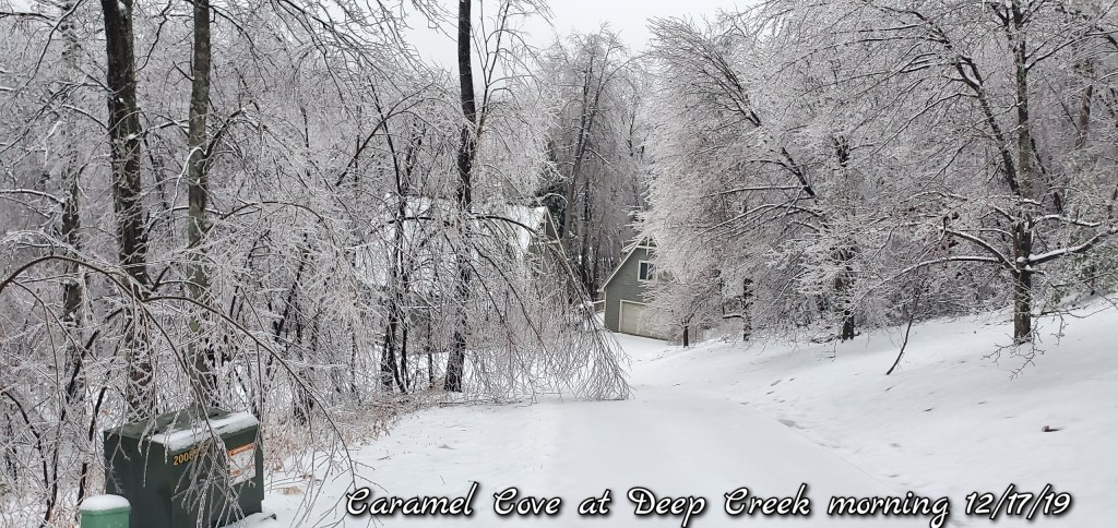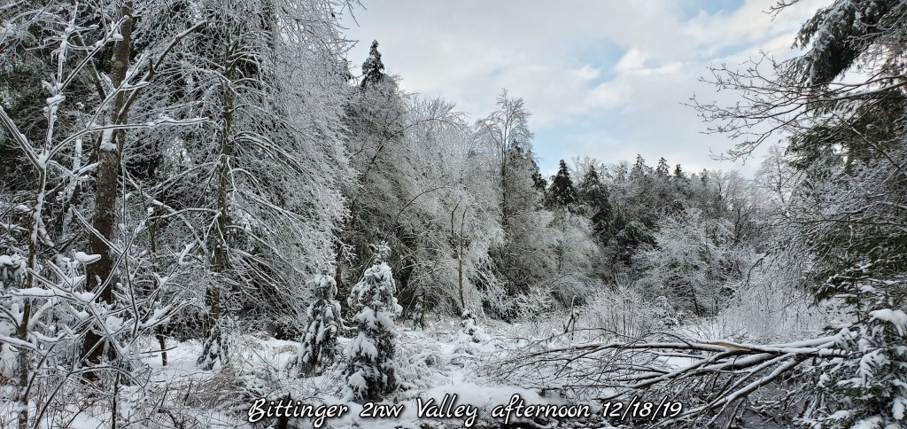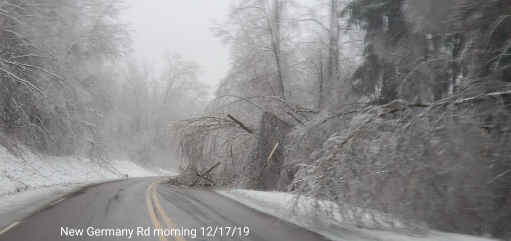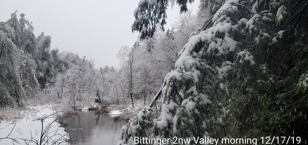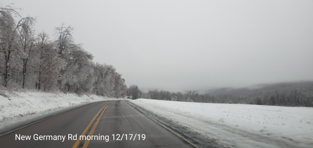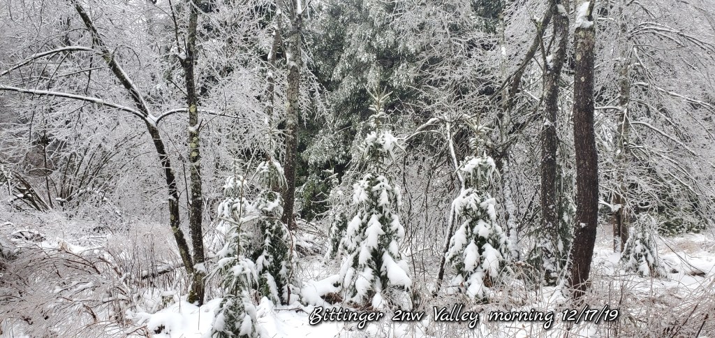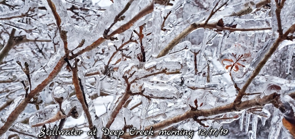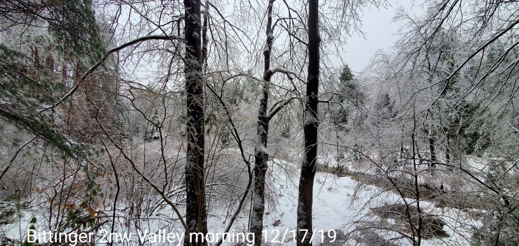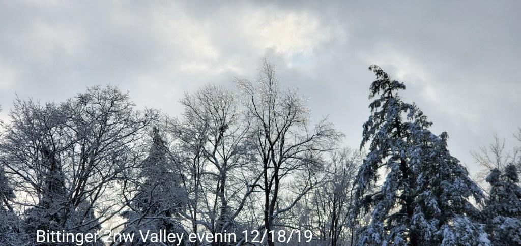 Ice ice baby. Major ice event across the eastern half of Garrett, and in some instances stretched into western Garrett. Overnight as far west as Preston County, before temps moderated there. Trees, limbs began falling 9-10pm and with that, power outages began. Some roadways blocked. All the while, very mild air and a rain out just to the south in Wv. Temps fell to the upper 20s at Mt.Storm early overnight last night, but sat at 50 this morning while below freezing remained in areas in Garrett. A brief surge of milder air came across mid morning, however not enough to scour out the cold in the high valleys in Garrett. The highest elevated areas in the ice zone lost more ice than the lower elevated areas with the brief mild surge that was followed by wind and colder air by midday. Leftover rain today changed to snow early afternoon as the colder air returned. Ice never came off the trees. Some high ground saw a little more melt than valleys in central Garrett with the slightest intrusion of mild air mid morning.