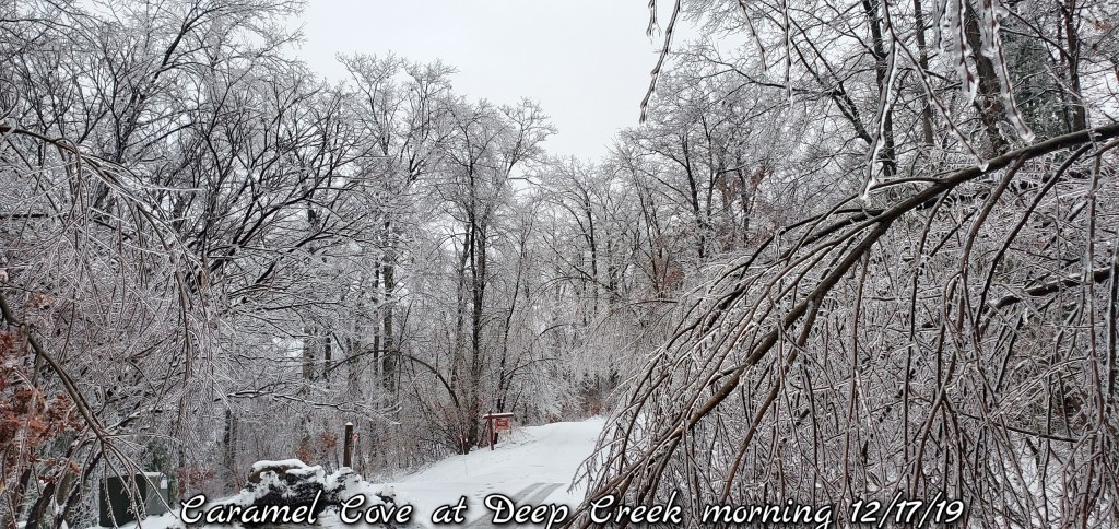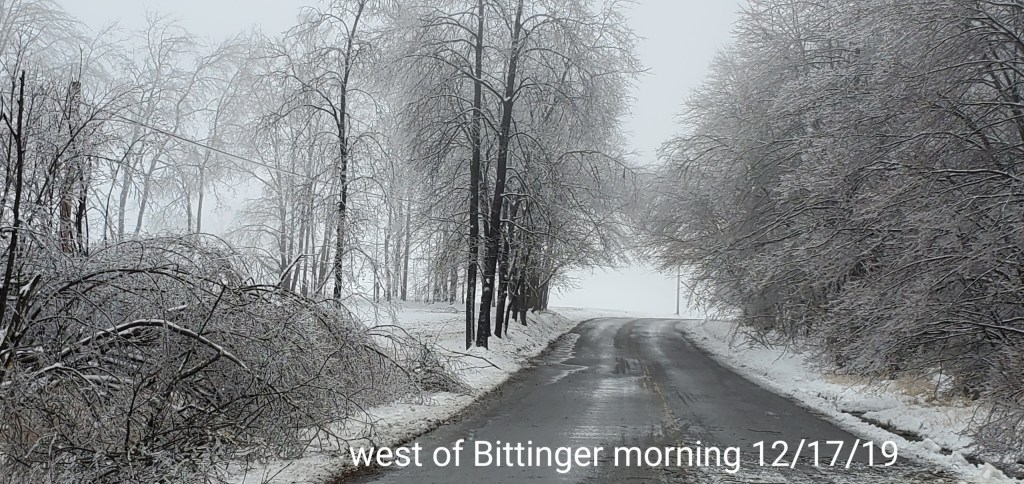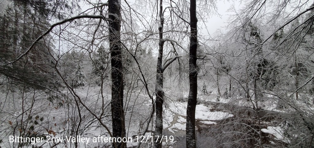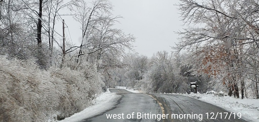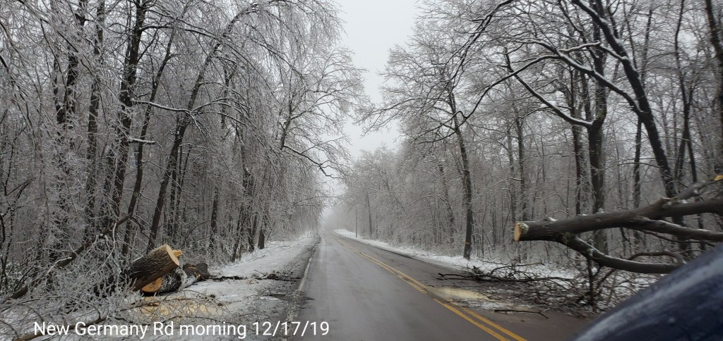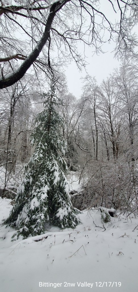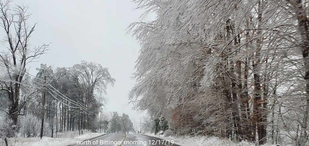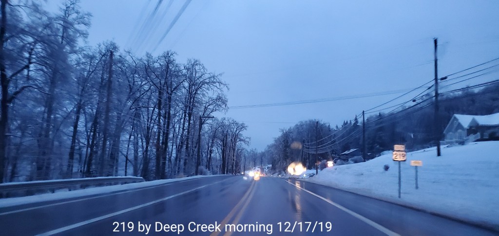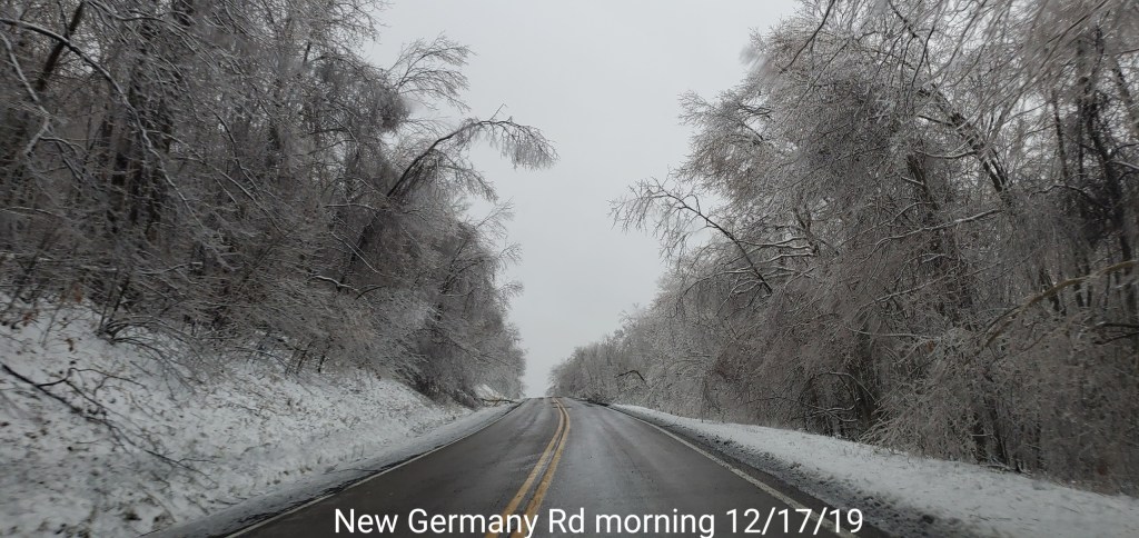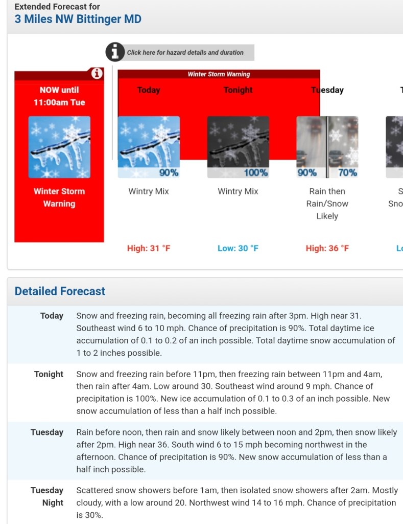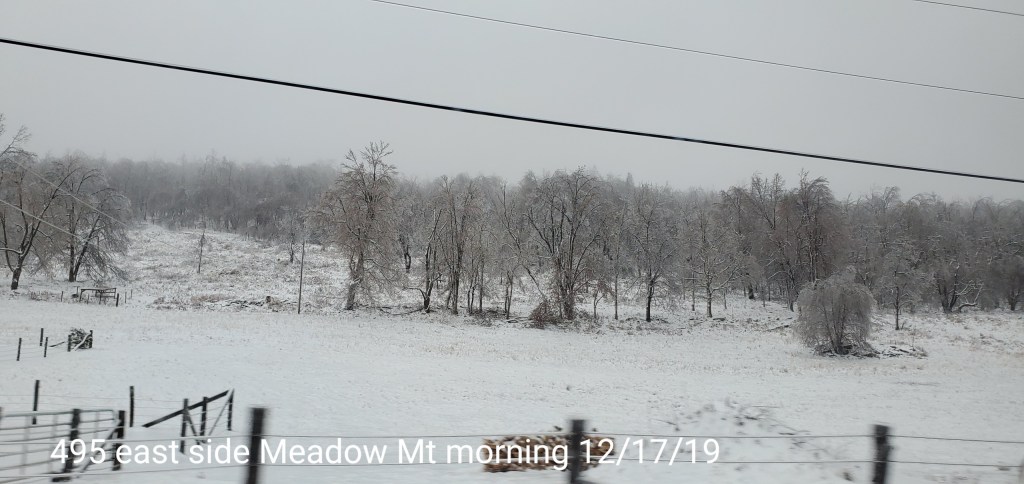 Ice ice baby. Major ice event across the eastern half of Garrett, and in some instances stretched into western Garrett. Overnight as far west as Preston County, before temps moderated there. Trees, limbs began falling 9-10pm and with that, power outages began. Some roadways blocked. All the while, very mild air and a rain out just to the south in Wv. Temps fell to the upper 20s at Mt.Storm early overnight last night, but sat at 50 this morning while below freezing remained in areas in Garrett. A brief surge of milder air came across mid morning, however not enough to scour out the cold in the high valleys in Garrett. The highest elevated areas in the ice zone lost more ice than the lower elevated areas with the brief mild surge that was followed by wind and colder air by midday. Leftover rain today changed to snow early afternoon as the colder air returned. Ice never came off the trees. Some high ground saw a little more melt than valleys in central Garrett with the slightest intrusion of mild air mid morning.