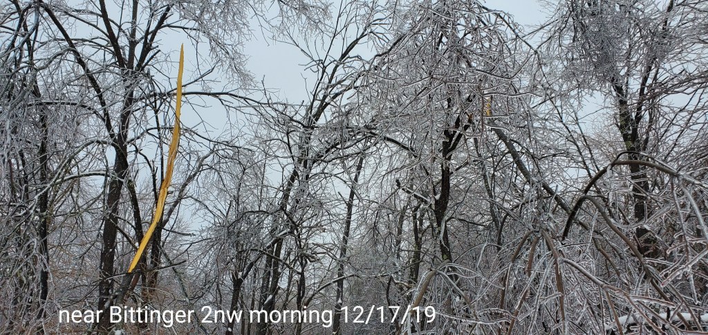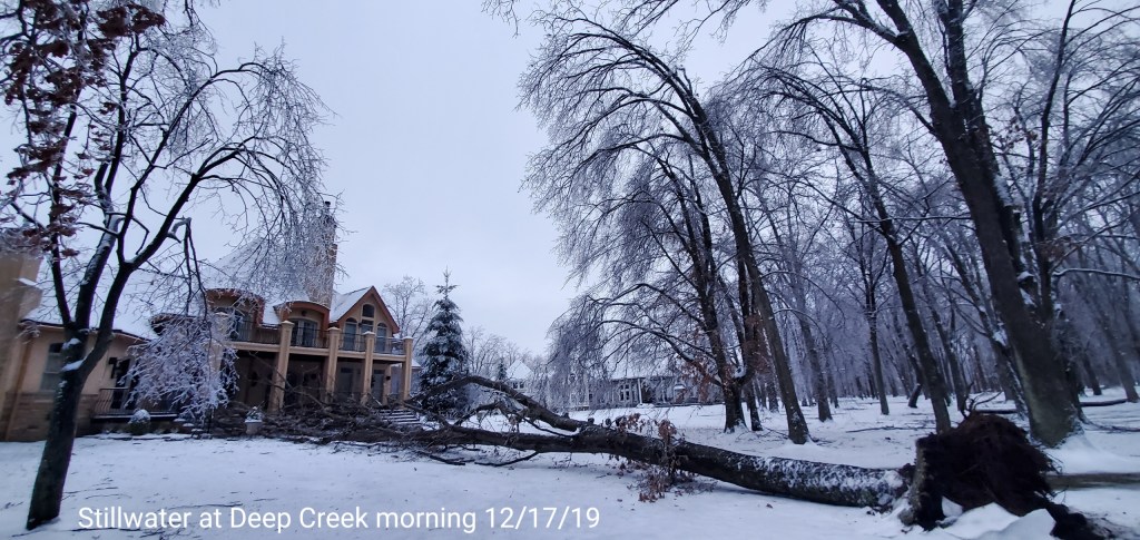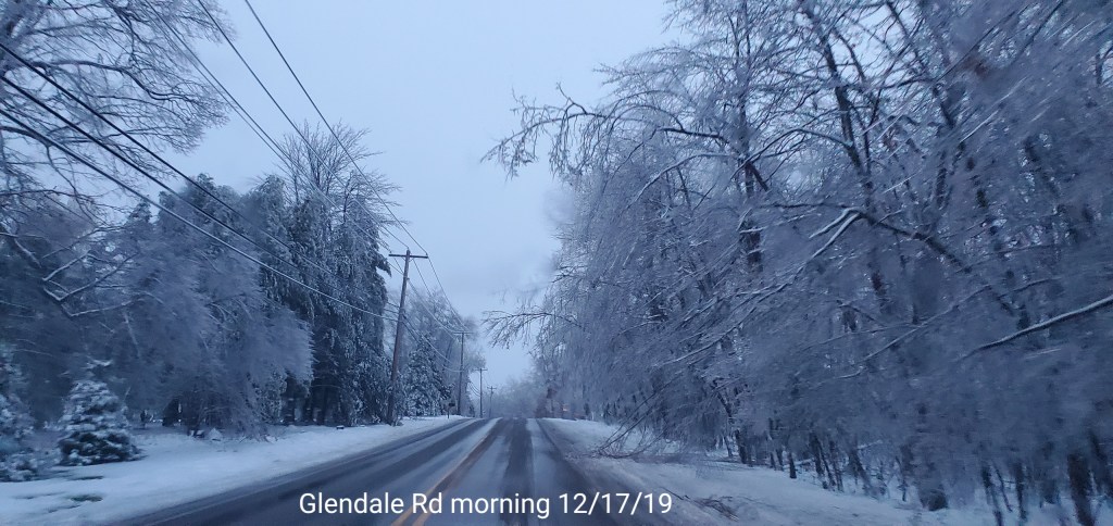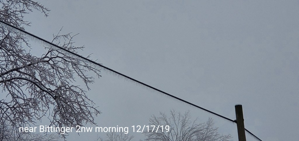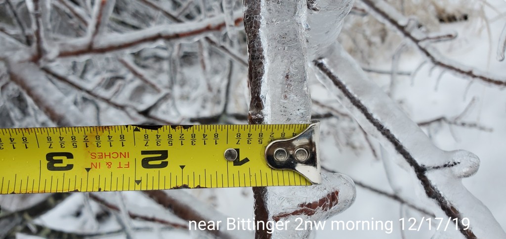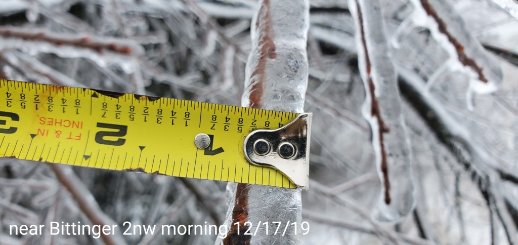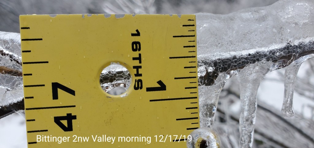 Freezing rain amounts, always a difficult judgement as freezing rain varies object to object. If its wind faced, if its marginal more can run to the end of tree limbs vs the upper parts etc…that said .4 to .6 range was common.