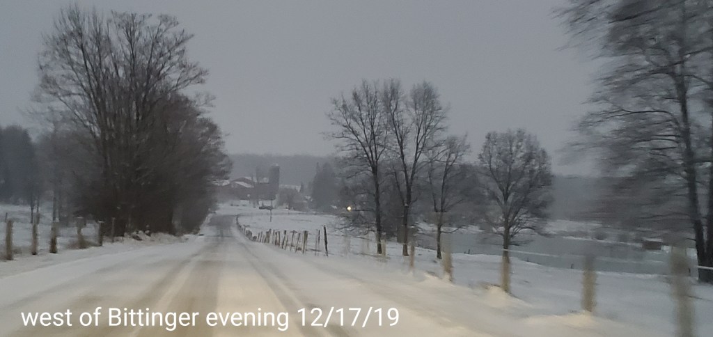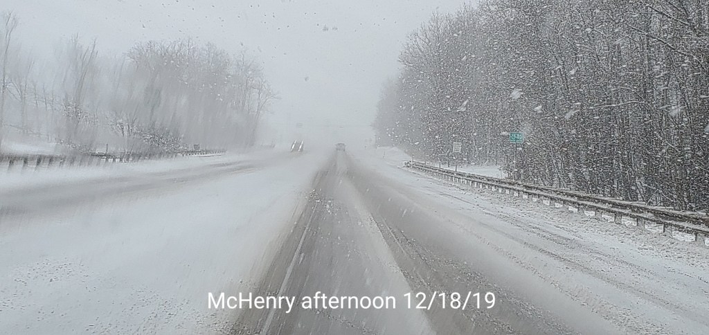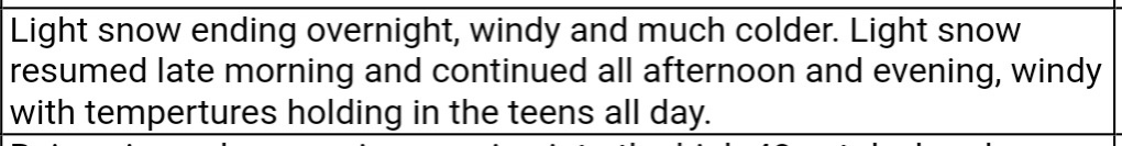 After skies cleared for awhile overnight, snow moved back in early morning(8am), and continued in varied fashion through the day with some heavier squalls at times. A brief very heavy one around 7pm.