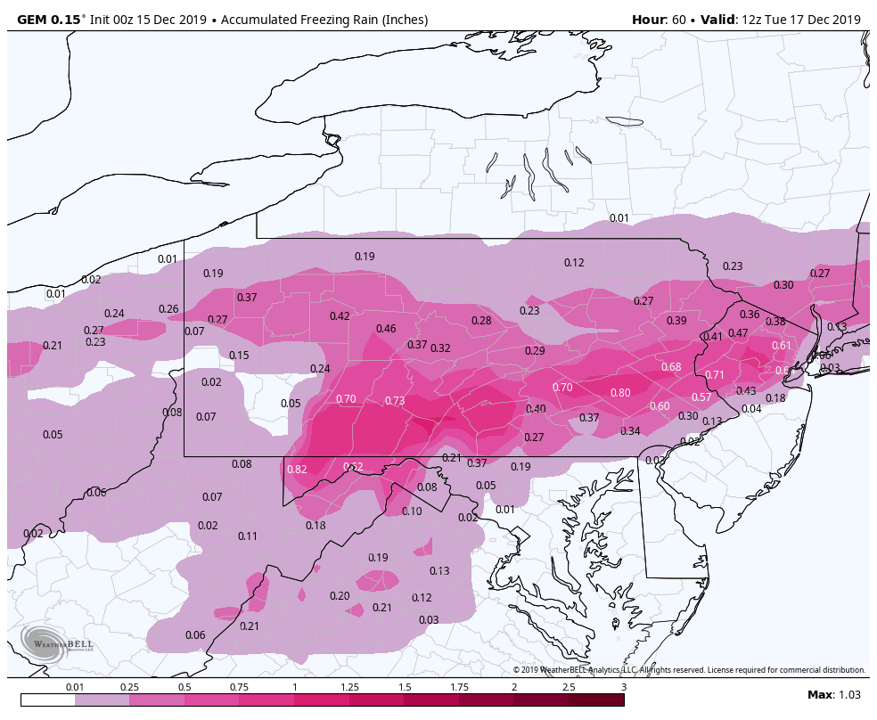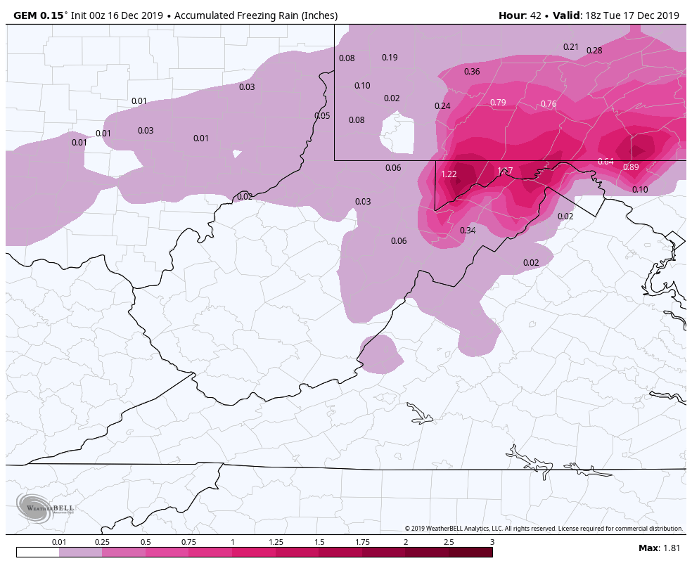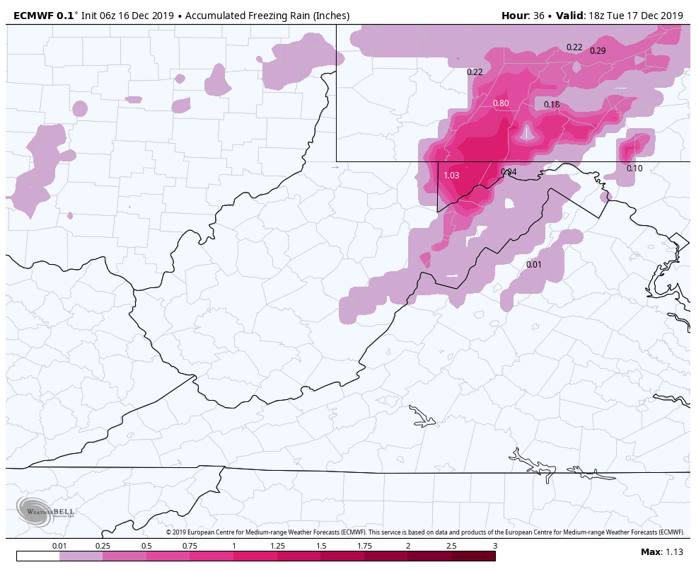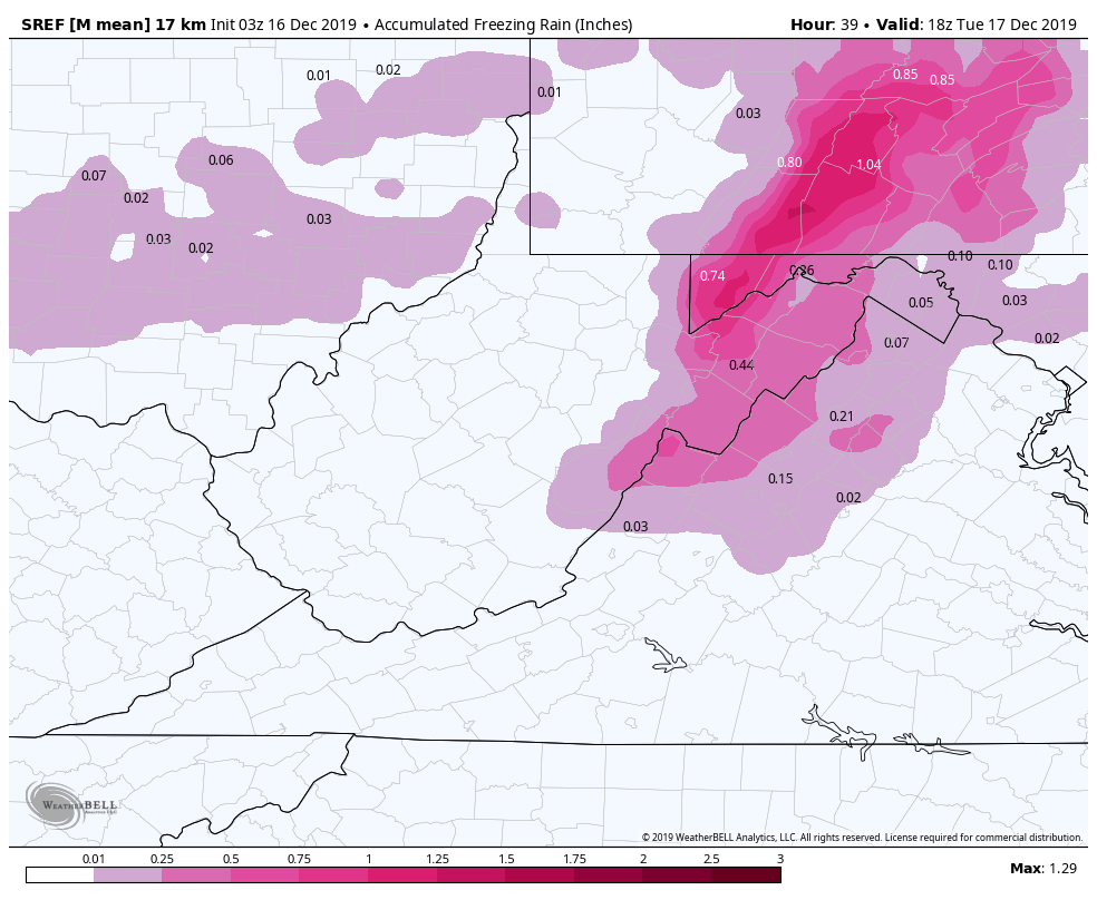 The models, the model parameters for freezing rain are consistently overdone. In a marginal temperature setup and moderate rain+, not everything freezes as it falls. Some is able to run off before freezing. Models do not factor that and will overdo ice amounts. With a east wind, those high east facing ridges get aided by the wind in freezing more of the rain. That said, model rundown