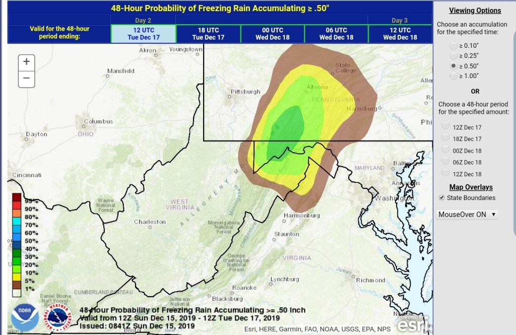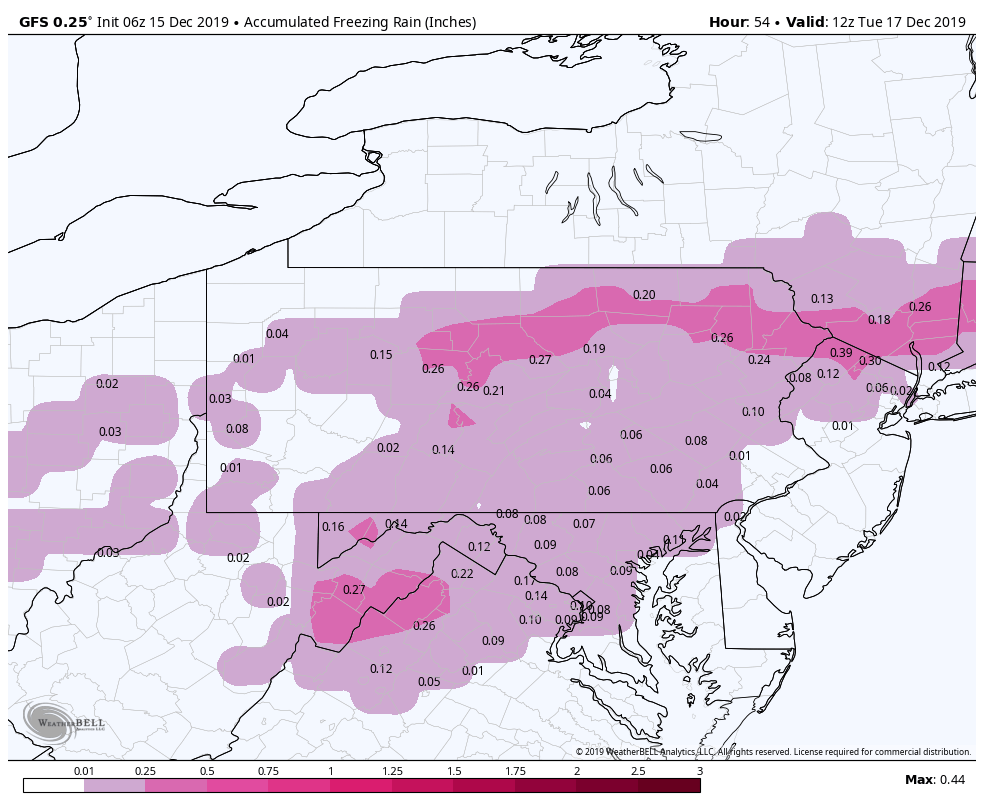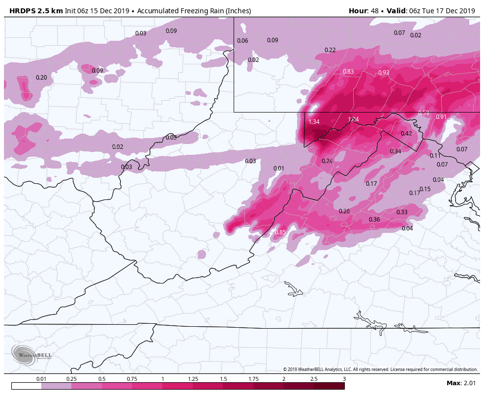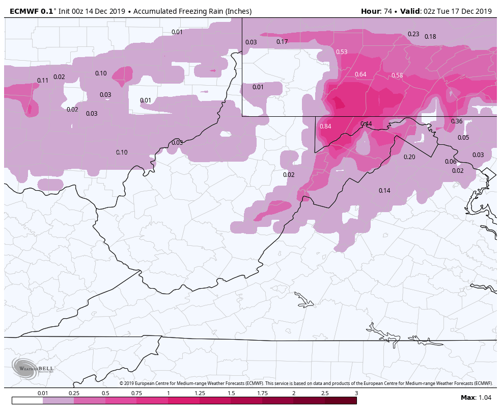 The models, the model parameters for freezing rain are consistently overdone. In a marginal temperature setup and moderate rain+, not everything freezes as it falls. Some is able to run off before freezing. Models do not factor that and will overdo ice amounts. With a east wind, those high east facing ridges get aided by the wind in freezing more of the rain. That said, model rundown