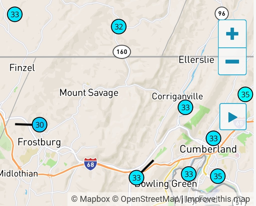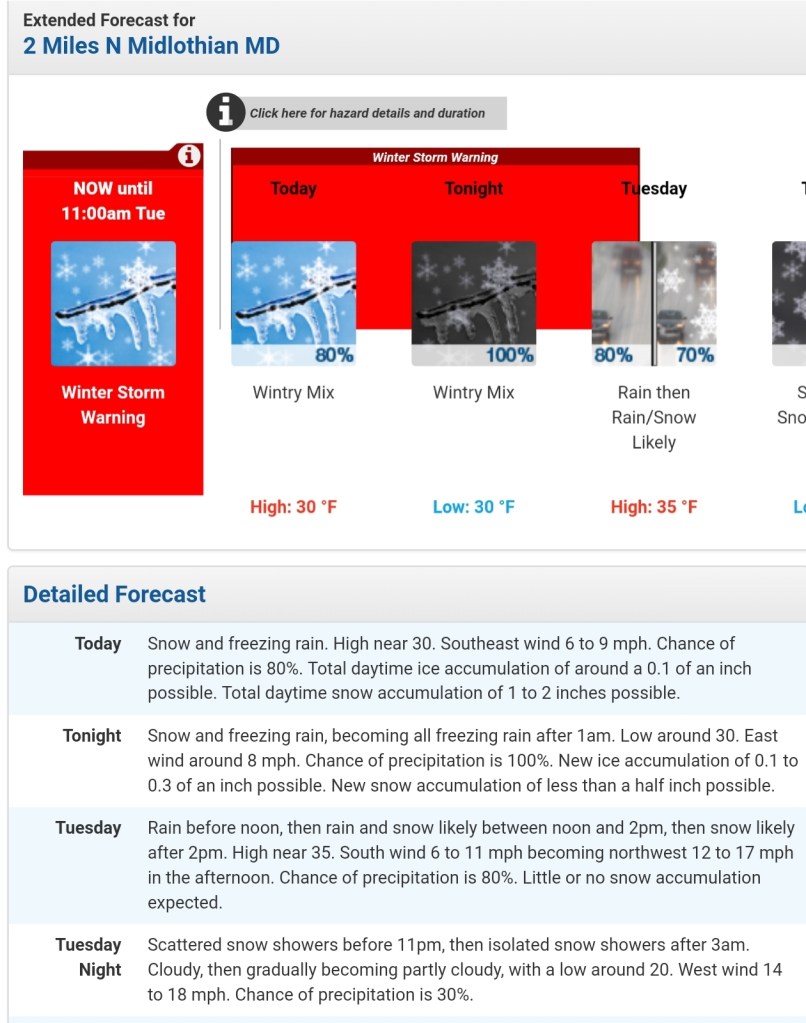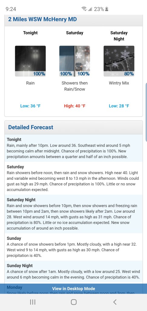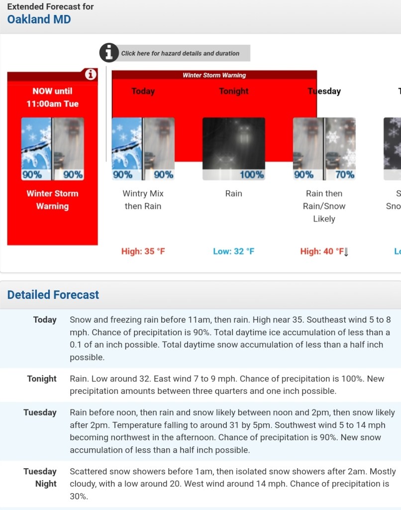 However the typical, classic, common, normal, routine, holdouts, The Allegheny Front, this looks to be Spruce Knob and north and duration is longer north, and north central Garrett County, points north, east, this looks to be a duration of a wintry mess. The models will help display that, and if you live here, you’ve seen this play out so many times over the years. This is the high ground and again the lower elevations east involved. Lots of times these systems will hold snow/sleet longer east side of Savage Mt to Frostburg and Lavale with greater accumulations there, than say Grantsville. (Sleet looks minimal with this particular event)That’s something to watch for Monday.