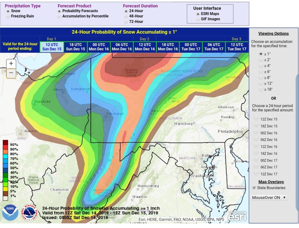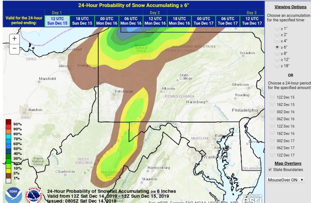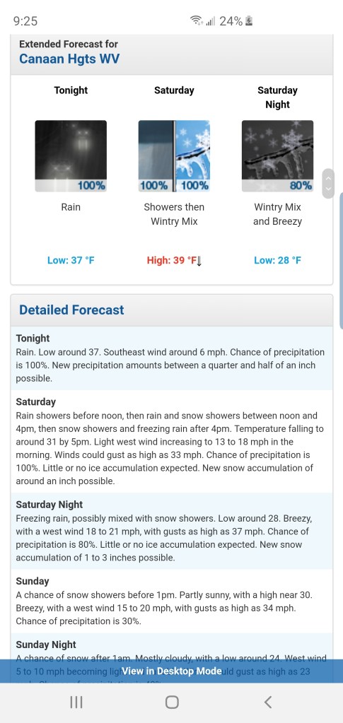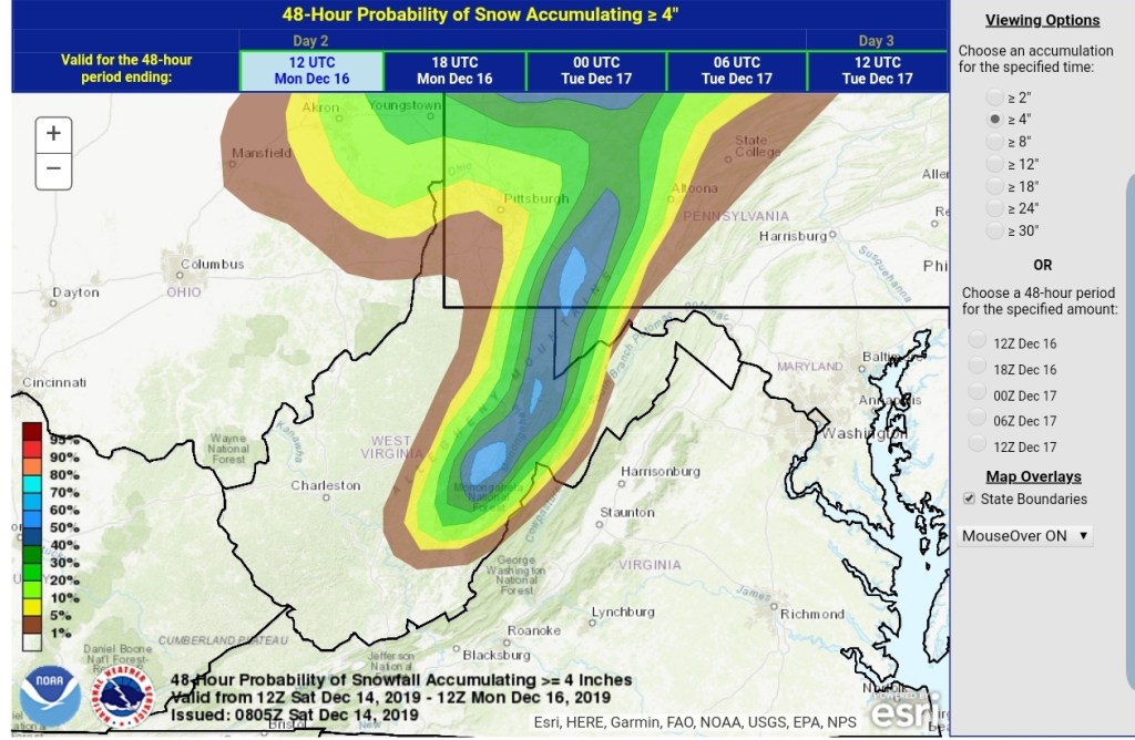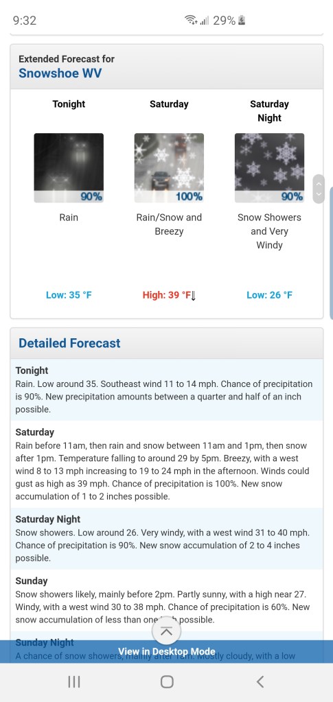 From 12pm today through 4pm Sunday, this appears to be a 3-6″ snowfall for the Wv high ground.(3000’+) As always lean low to mid range and if it performs well, the upper range can be reached. 2-4″ for Garrett, Preston and north into the southern Pa high ground above 2500′. Slightly lower amounts under 2500′. Again, low to mid range looks likely and after some weird forecast last night, the NWS has came around to close to this, but holding it low and at the time of this writing, holding this under winter weather advisory criteria and that may give travelers in this area a false sense of what road conditions will be…