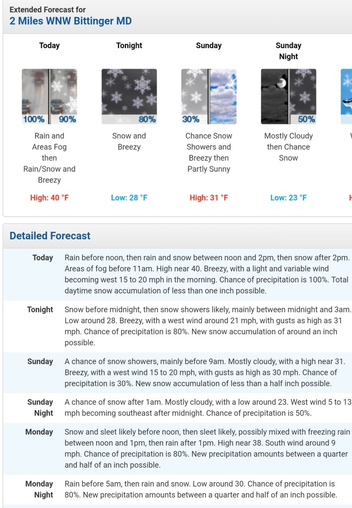 Ice accretion does look to be a concern from the Bittinger area, and points east, north east. Especially the high ground and east facing areas as a strong east wind occurs during this time. With a strong east wind, temps do not just magically spike above freezing. The common NWS error is to forecast the warm air into the typical freeze zone much to soon. Sometimes anywhere from 2 hours to 12 hours to soon. Granted, things have time to adjust yet, but already their Monday forecast looks too soon to rain. I would rather, in these instances have a forecast call for ice a little longer(Tuesday a.m even) than expected for safety purposes in which what winter forecast are for than call for it to end sooner than it does than put people out in about making plans while conditions are still poor.