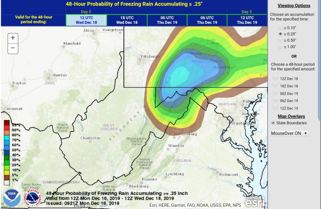 By later today into the overnight, temps along the Allegheny Front, into central Garrett and points east, northeast look to drop 2-3°, from daytime maxes today that may briefly eek above freezing. At this time, precipitation is on the increase. The most significant icing may occur in the hours of 4pm to 4am in these areas. Especially the higher east facing ridges. This could be significant icing in those areas. Ice will occur outside of this zone, this is circled for greatest impact zone.